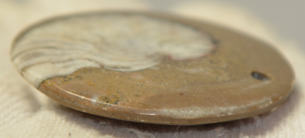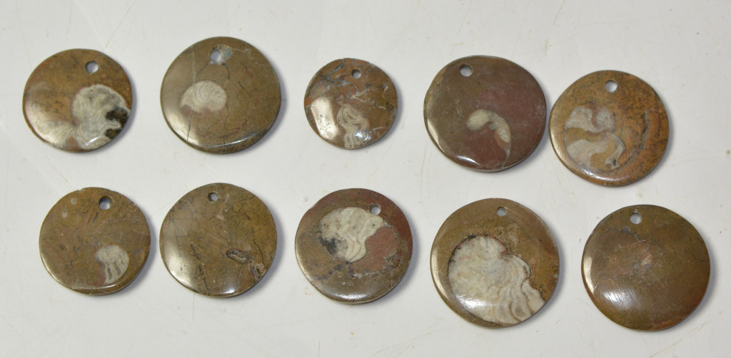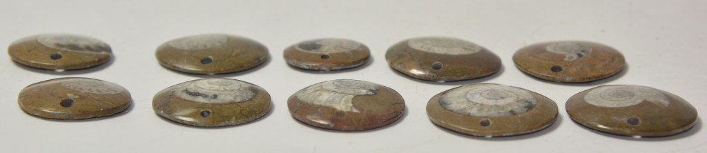 10 Devonian calcitized ammonites (Goniatites) in a disc-shaped polished limestone, which is drilled through as a pendant. The ammonites originate from Morocco, Atlas Mountains. The dimensions of the ammonites are approximately: 37.9 - 27.3 mm x 7.2 - 5.5 mm. The total weight of the 10 pendants is 101 grams + packaging.