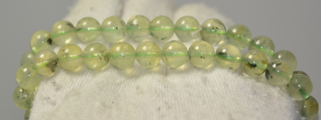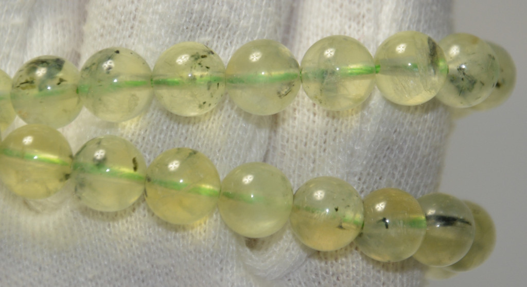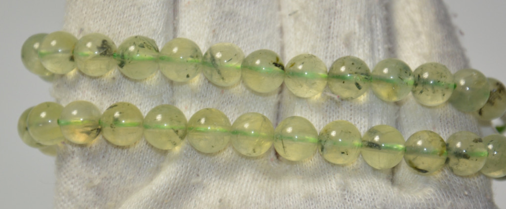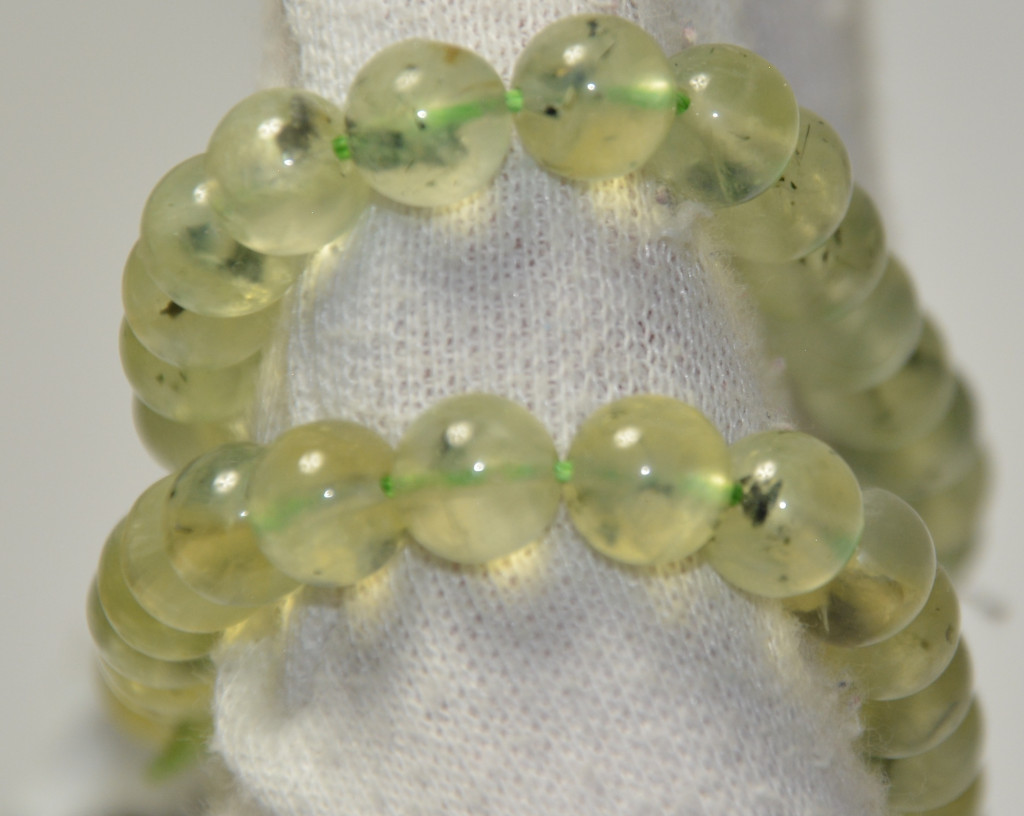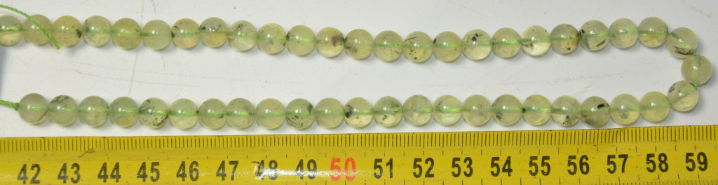 Ball-shaped beads made of prehnite mineral. The size of the beads is approximately 7.7 - 8 mm. The length of the necklace is approximately 38-40 cm. The weight of the necklace is approximately 34-36 grams.