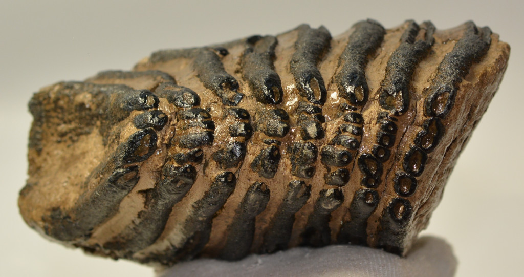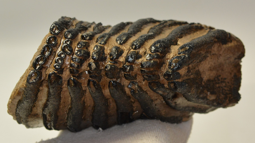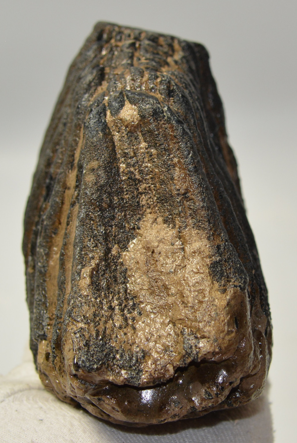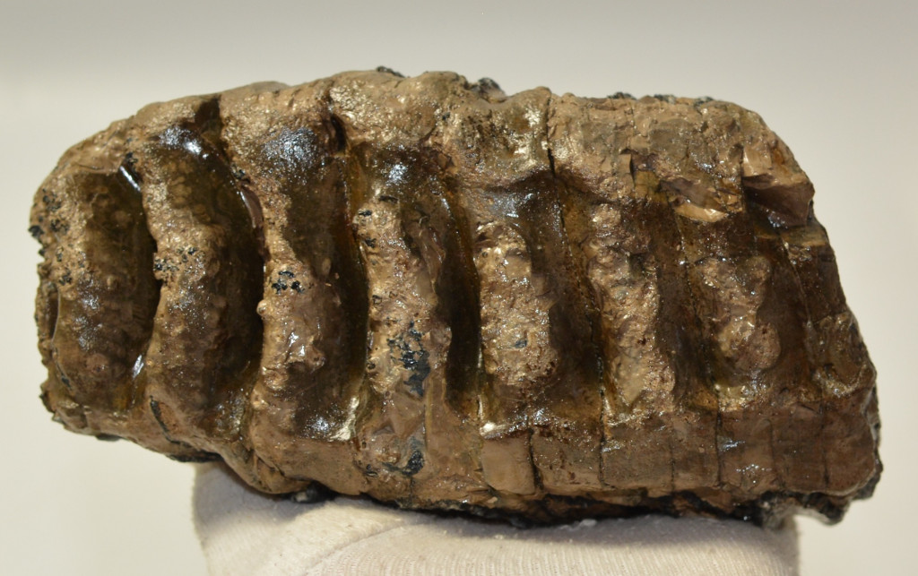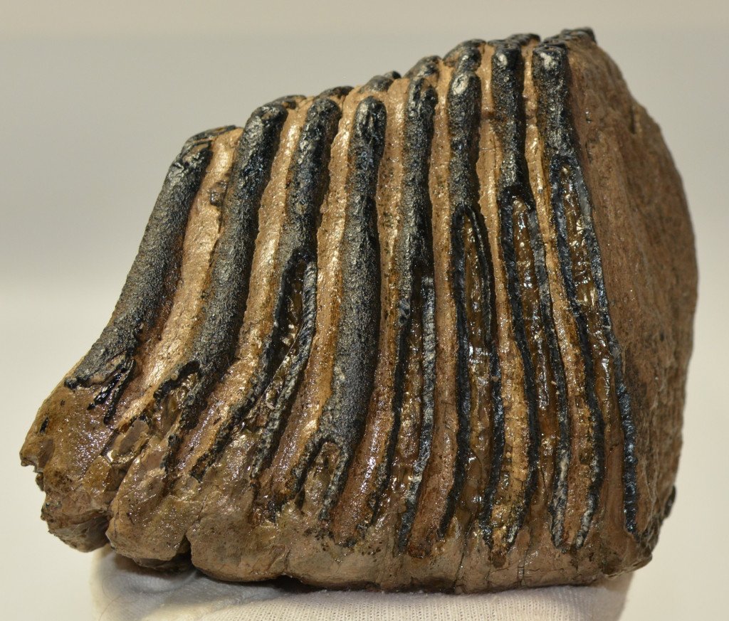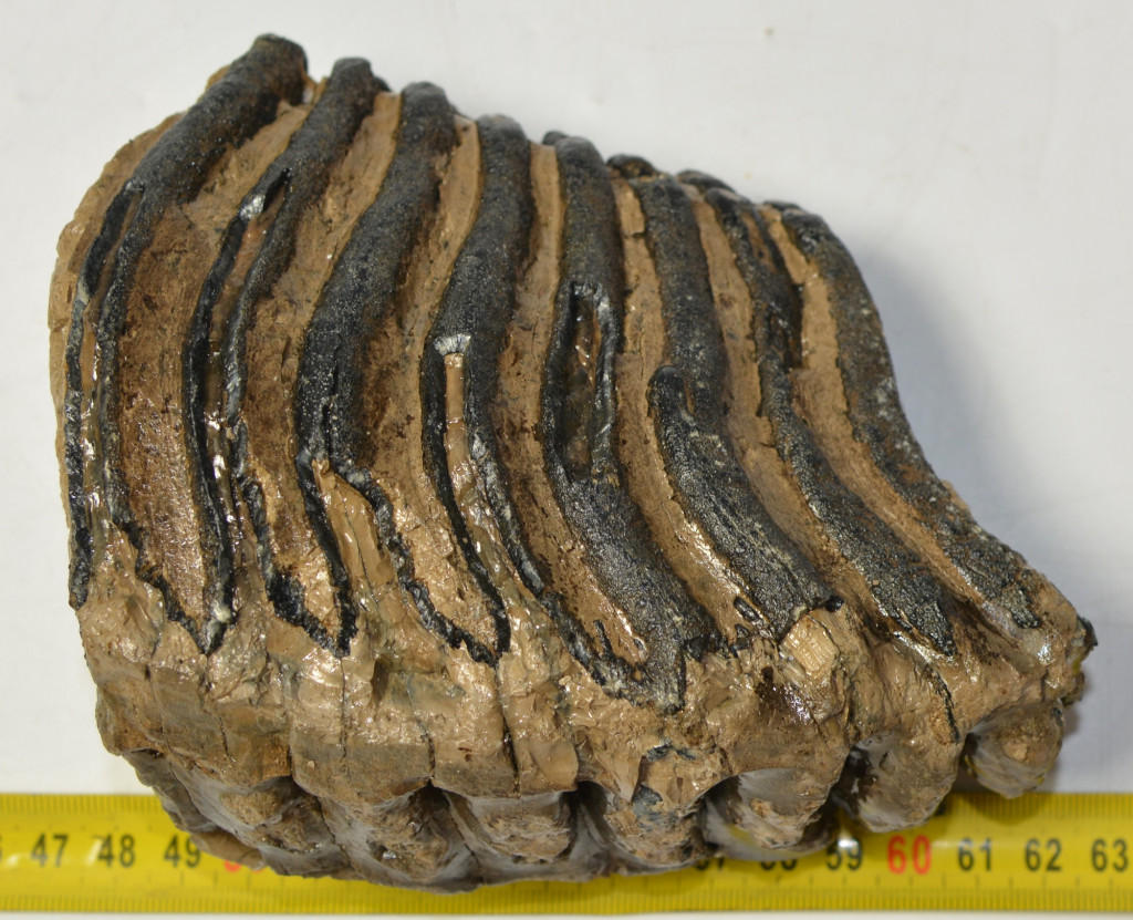 Mammuthus primigenius (gyapjas mamut) részleges fog. A mamut fosszília Magyarországon, Pest megyében kavicsbányászat során került a felszínre. A fog méretei kb: hosszúsága 149 mm, magassága 115 mm, szélessége 76 mm. Tömege kb: 1259 gramm + csomagolás. A fog felülete ethanolba oldott Polyvinyl Butyral 30 nevű anyaggal van konzerválva.