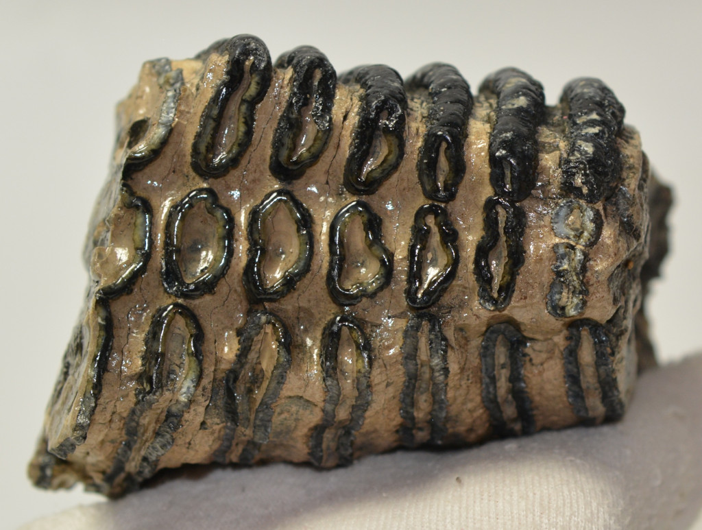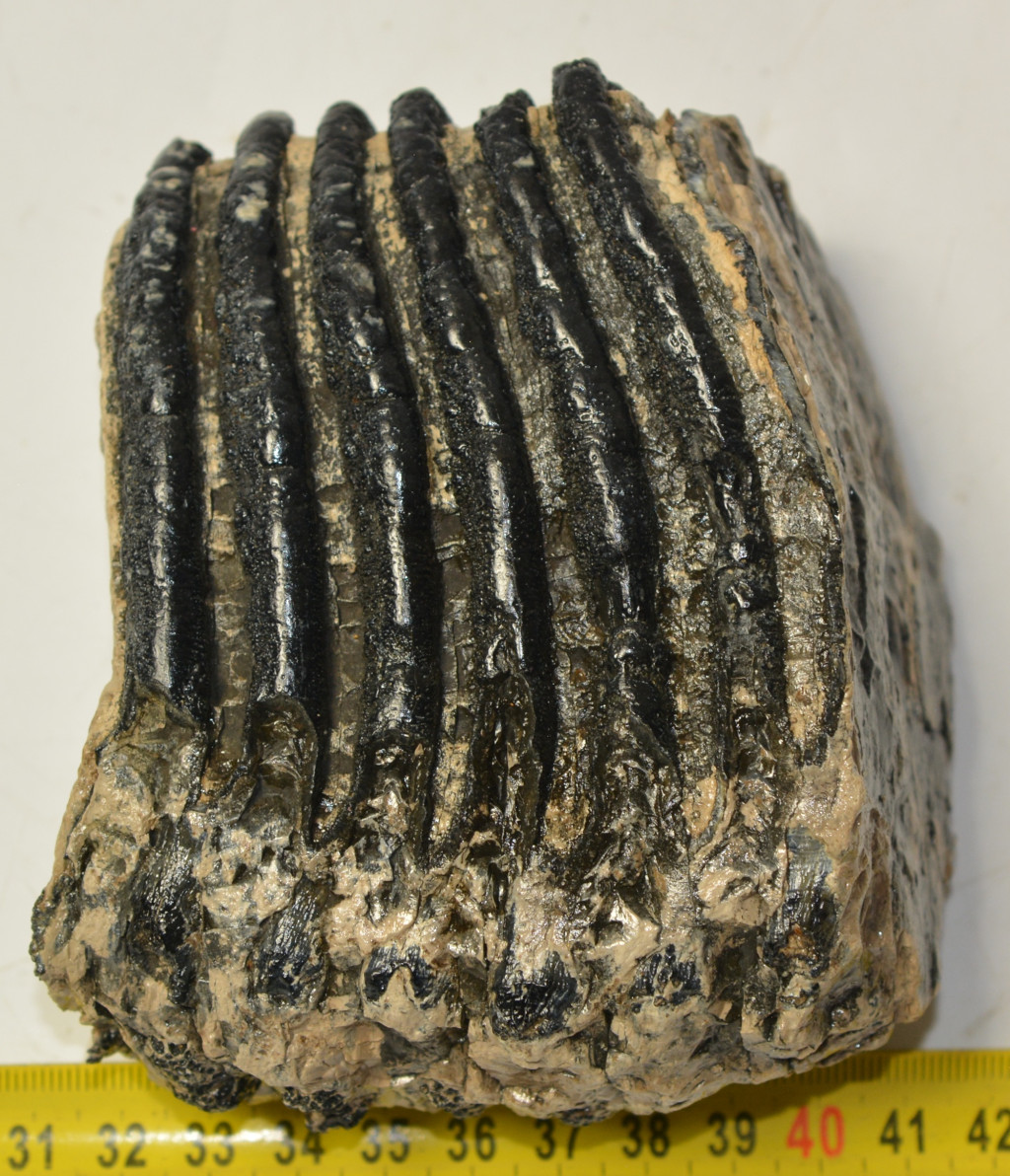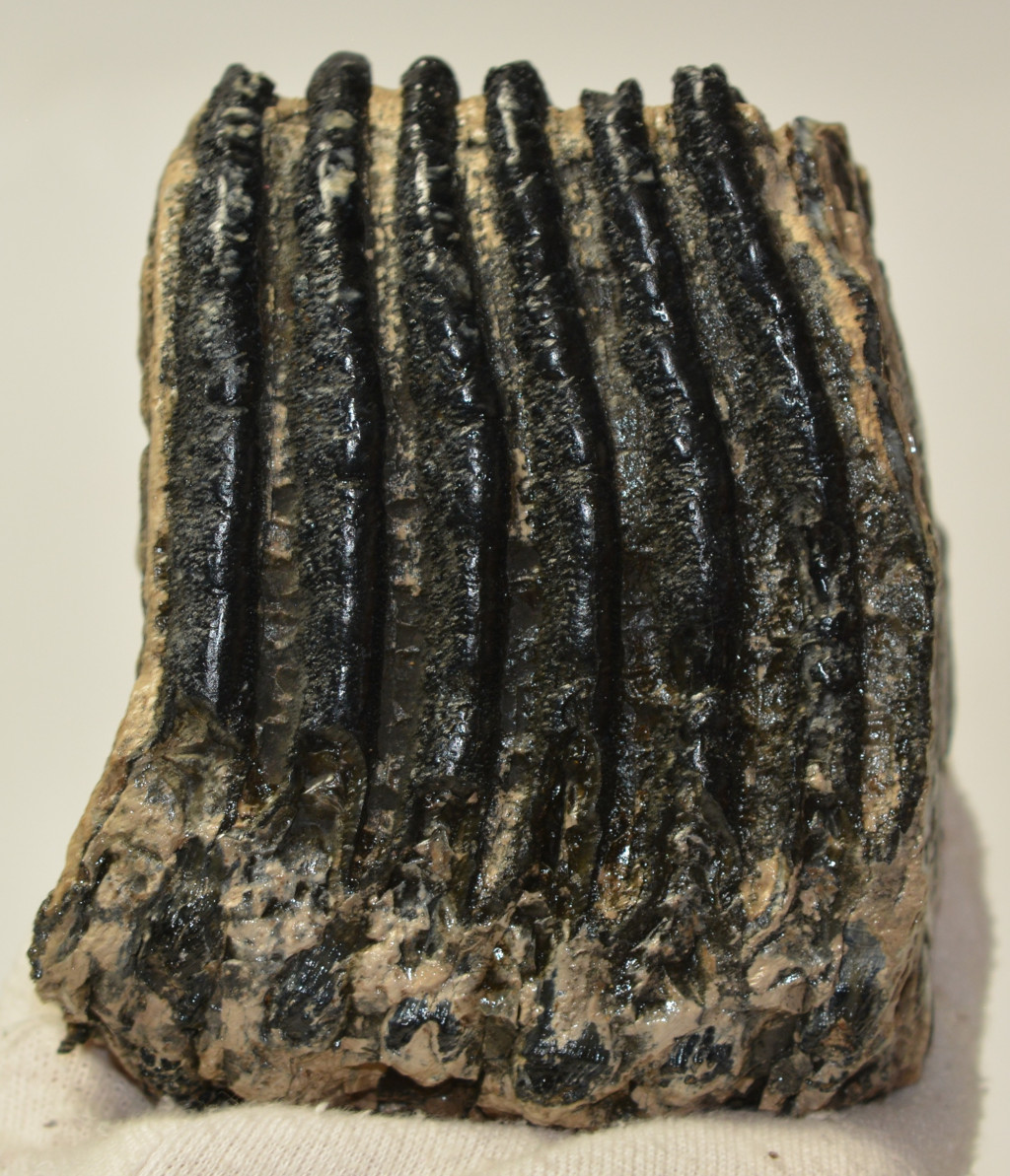 Mammuthus primigenius (gyapjas mamut) részleges fog. A mamut fosszília Magyarországon, Pest megyében kavicsbányászat során került a felszínre. A fog méretei kb: hosszúsága 95 mm, magassága 113 mm, szélessége 65 mm. Tömege kb: 843 gramm + csomagolás. A fog felülete ethanolba oldott Polyvinyl Butyral 30 nevű anyaggal van konzerválva.