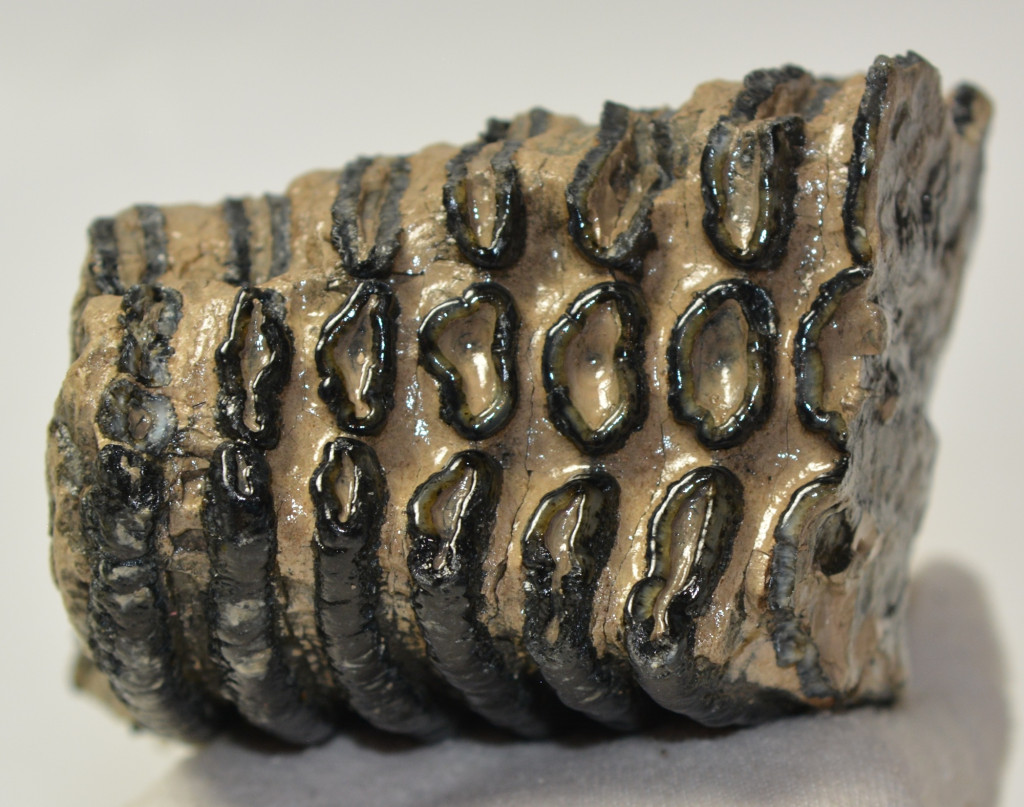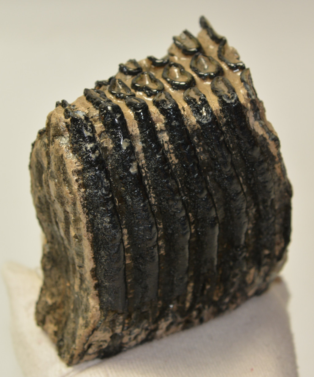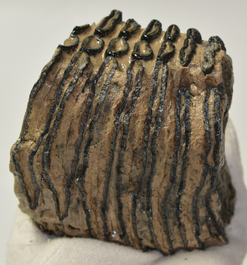 Mammuthus primigenius (gyapjas mamut) részleges fog. A mamut fosszília Magyarországon, Pest megyében kavicsbányászat során került a felszínre. A fog méretei kb: hosszúsága 95 mm, magassága 113 mm, szélessége 65 mm. Tömege kb: 843 gramm + csomagolás. A fog felülete ethanolba oldott Polyvinyl Butyral 30 nevű anyaggal van konzerválva.