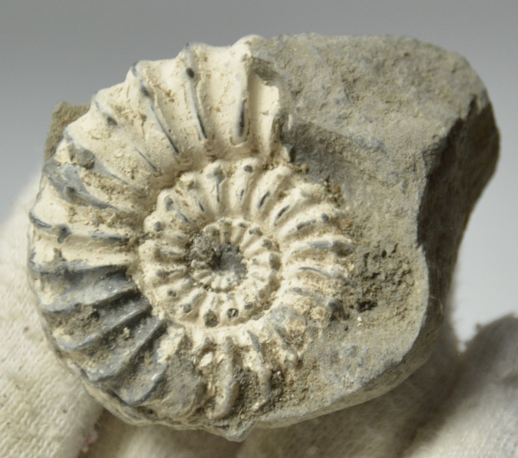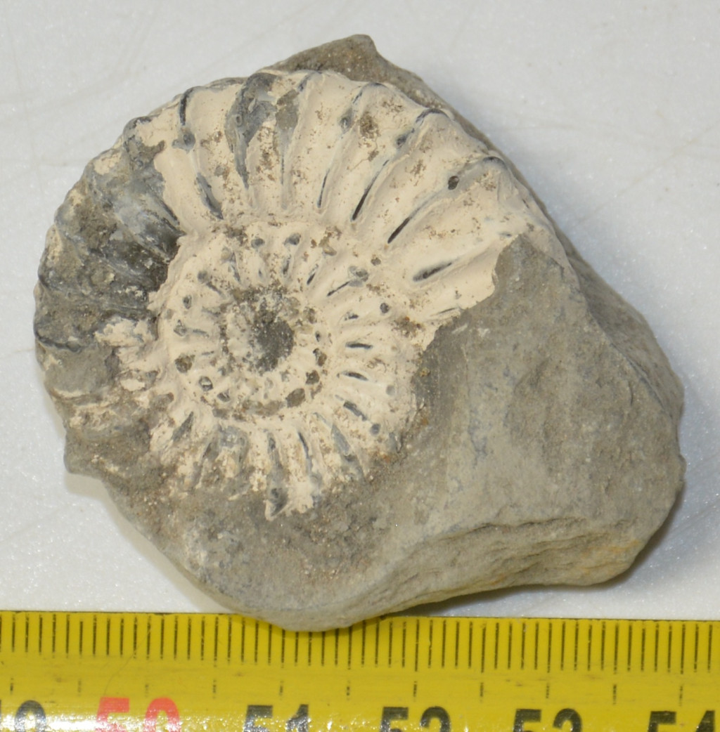 Jura (Pliensbachian) korú Pleuroceras sp. ammonitesz kövület kőzetben. Az ammonitesz származási helye Németország, Unterstürmig kőbánya. Az ammoniteszt tartalmazó kő méretei kb: 50,9 mm x 41 mm x 23,5 mm. Tömege kb: 55 gramm + csomagolás. Az ammonitesz legnagyobb átmérője kb: 40,3 mm.