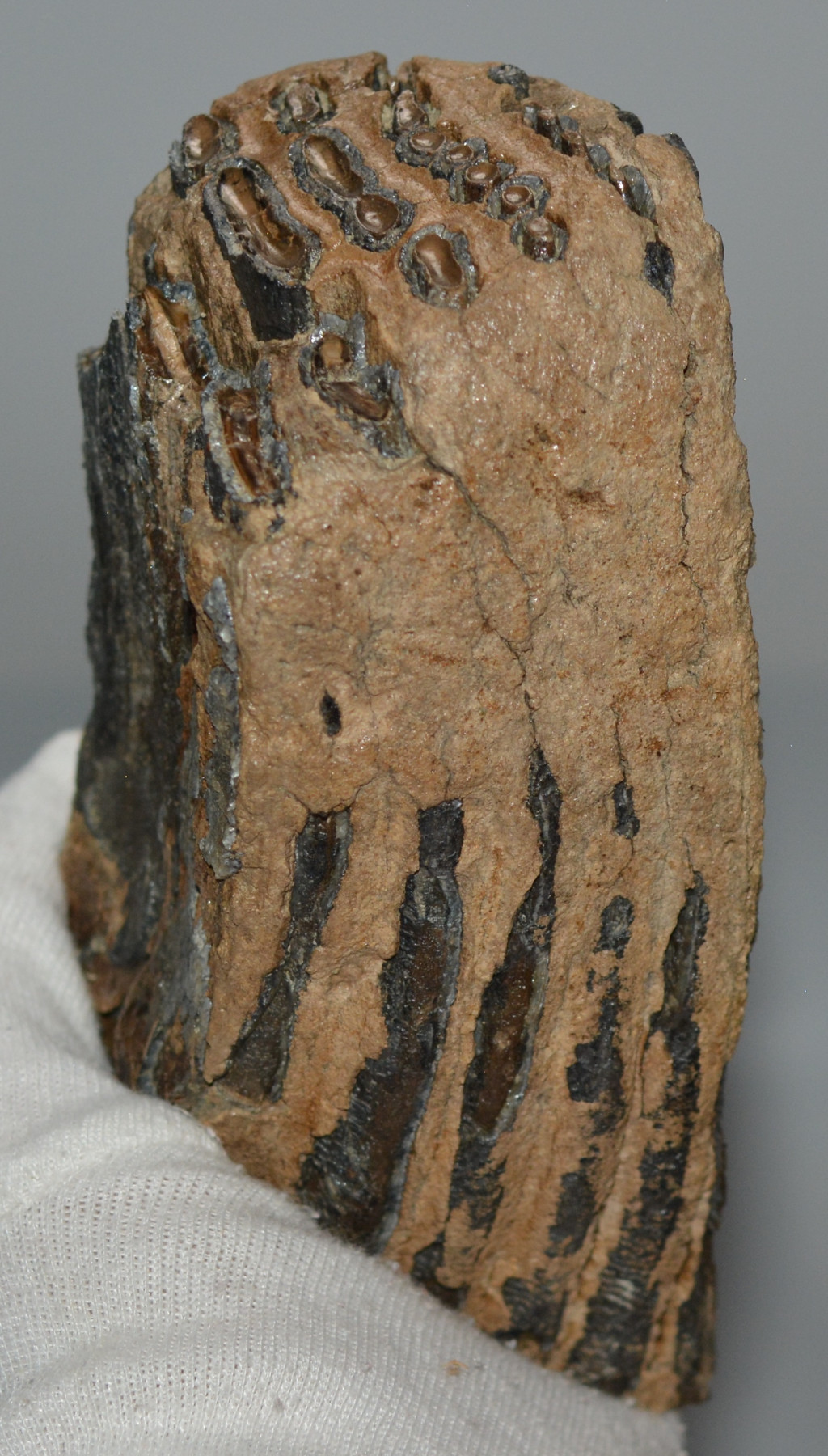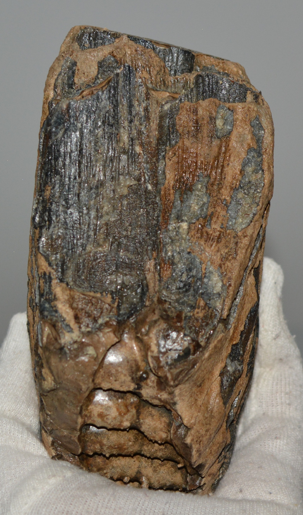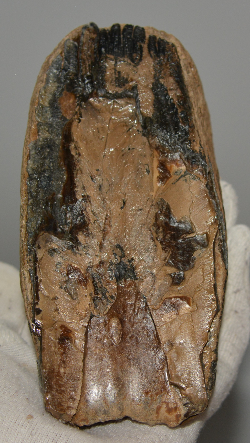 Mammuthus primigenius (gyapjas mamut) részleges fog. A mamut fosszília Magyarországon, Heves megyében kavicsbányászat során került a felszínre. A fog méretei kb: hosszúsága 59,4 mm, magassága 149,3 mm, szélessége 72,3 mm. Tömege kb: 850 gramm + csomagolás. A fog felülete ethanolba oldott Polyvinyl Butyral 30 nevű anyaggal van konzerválva.