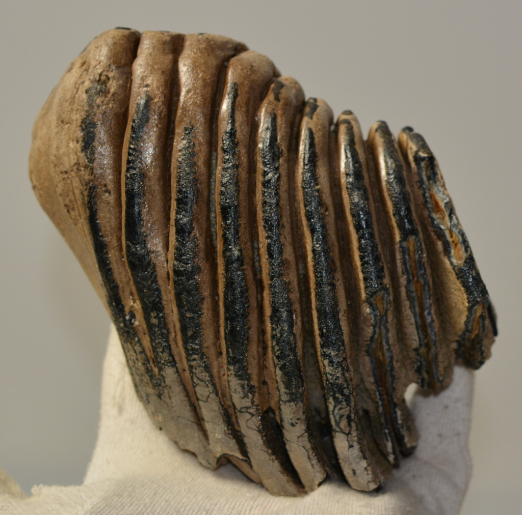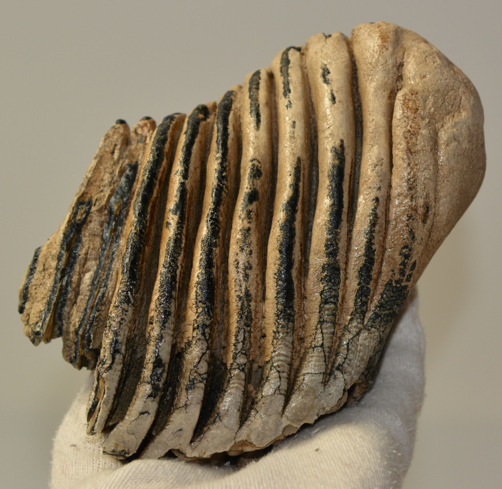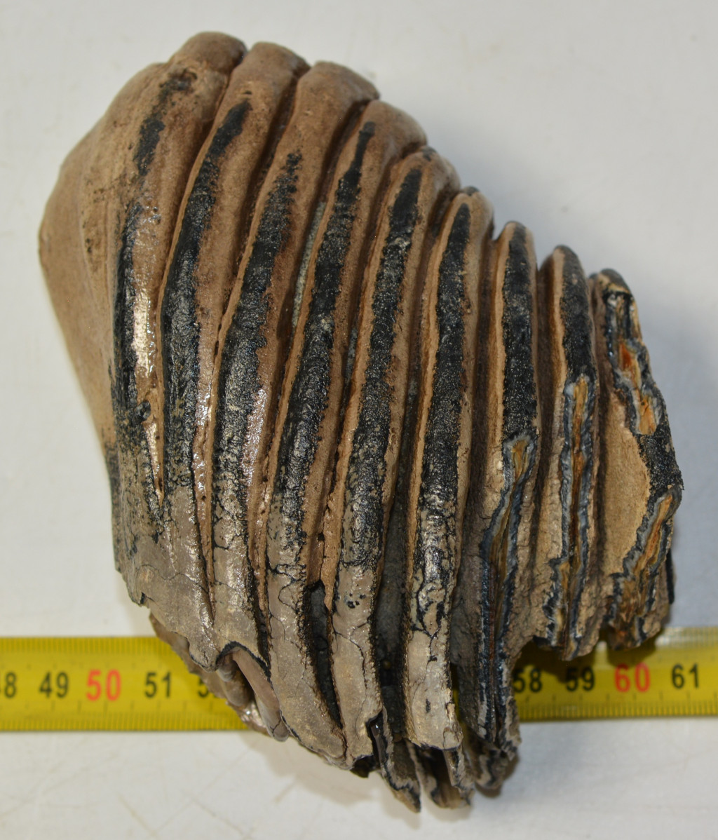 Mammuthus primigenius (gyapjas mamut) részleges fog. A mamut fosszília Magyarországon, Pest megyében kavicsbányászat során került a felszínre. A fog méretei kb: hosszúsága 135 mm, magassága 115 mm, szélessége 66 mm. Tömege kb: 970 gramm + csomagolás. A fog felülete ethanolba oldott Polyvinyl Butyral 30 nevű anyaggal van konzerválva.