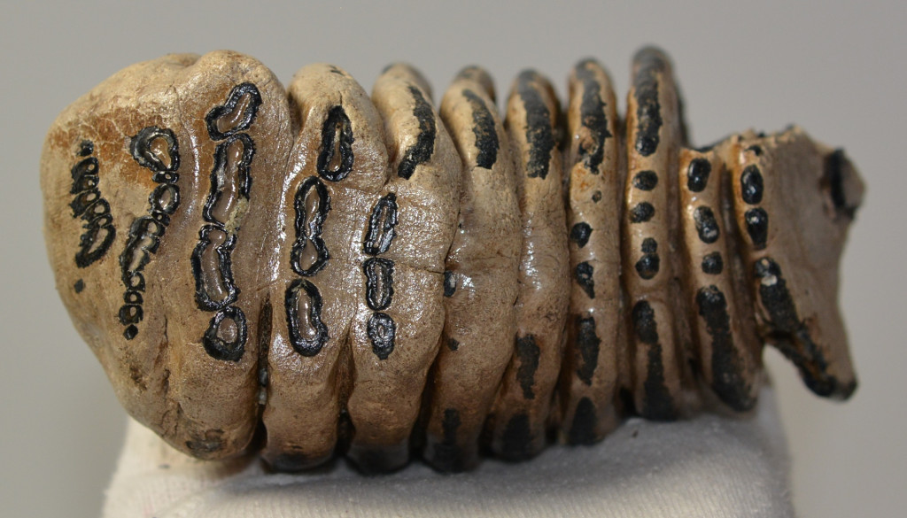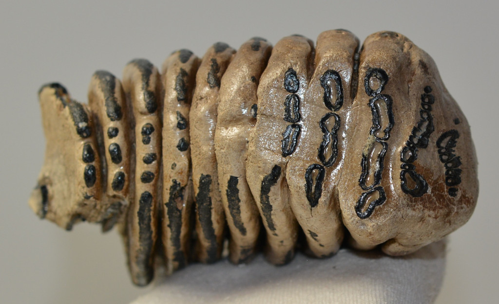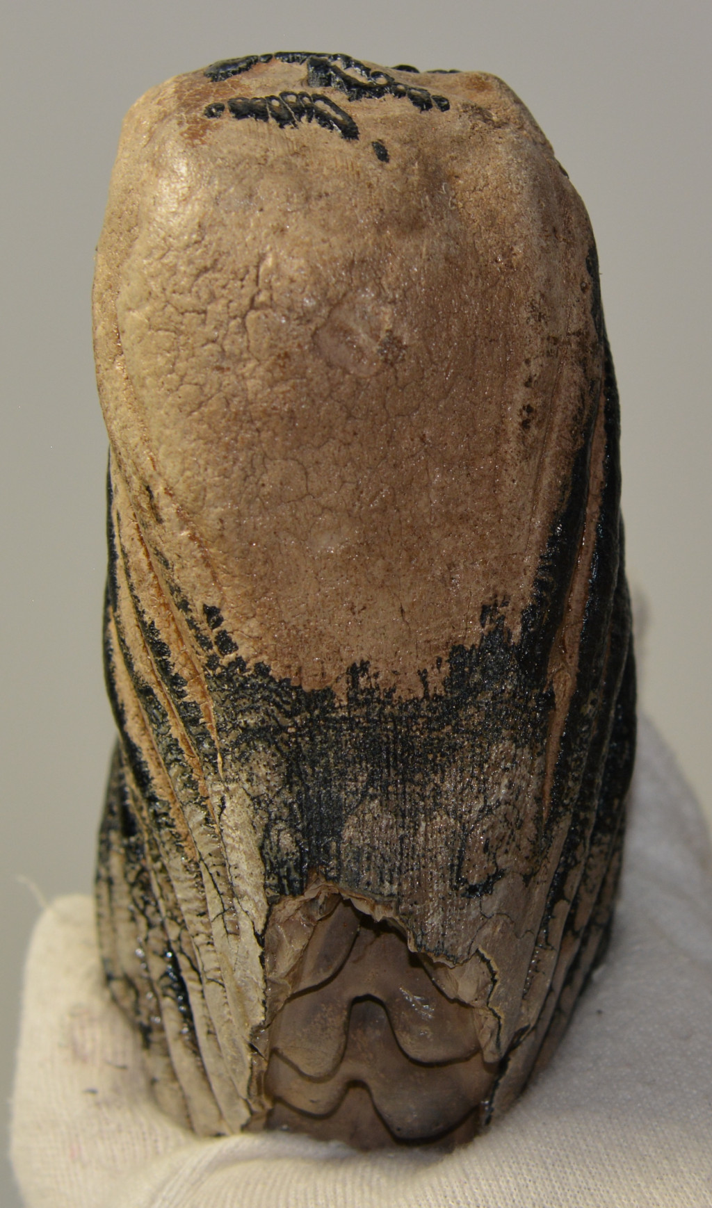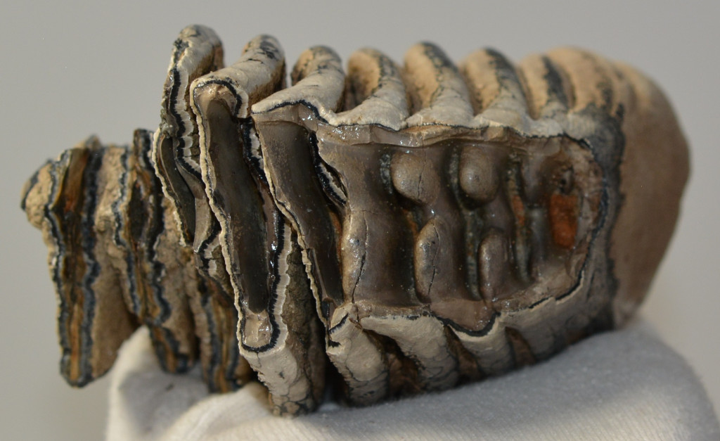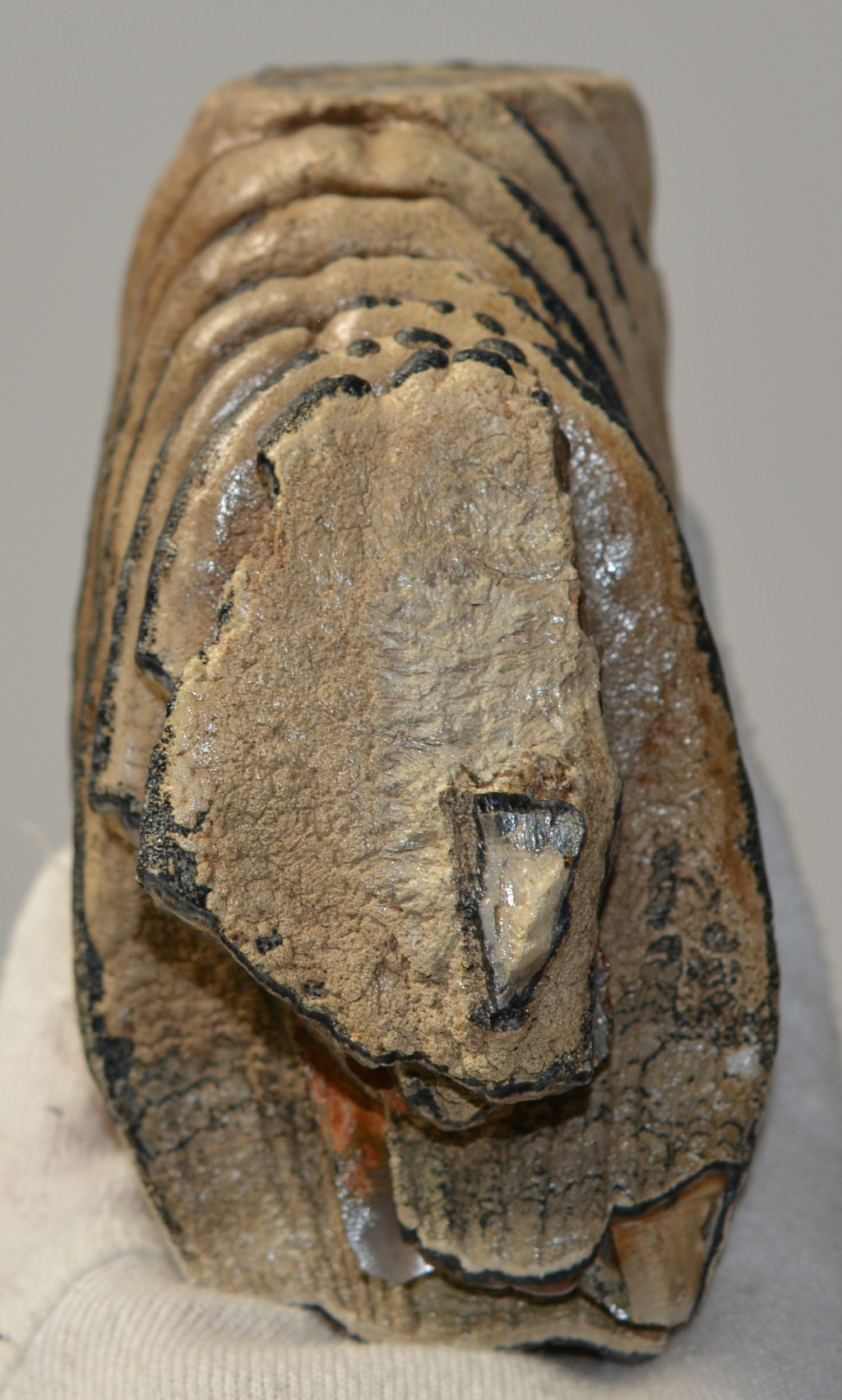 Mammuthus primigenius (gyapjas mamut) részleges fog. A mamut fosszília Magyarországon, Pest megyében kavicsbányászat során került a felszínre. A fog méretei kb: hosszúsága 135 mm, magassága 115 mm, szélessége 66 mm. Tömege kb: 970 gramm + csomagolás. A fog felülete ethanolba oldott Polyvinyl Butyral 30 nevű anyaggal van konzerválva.