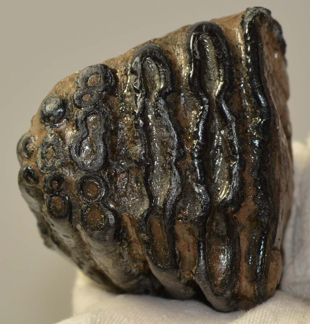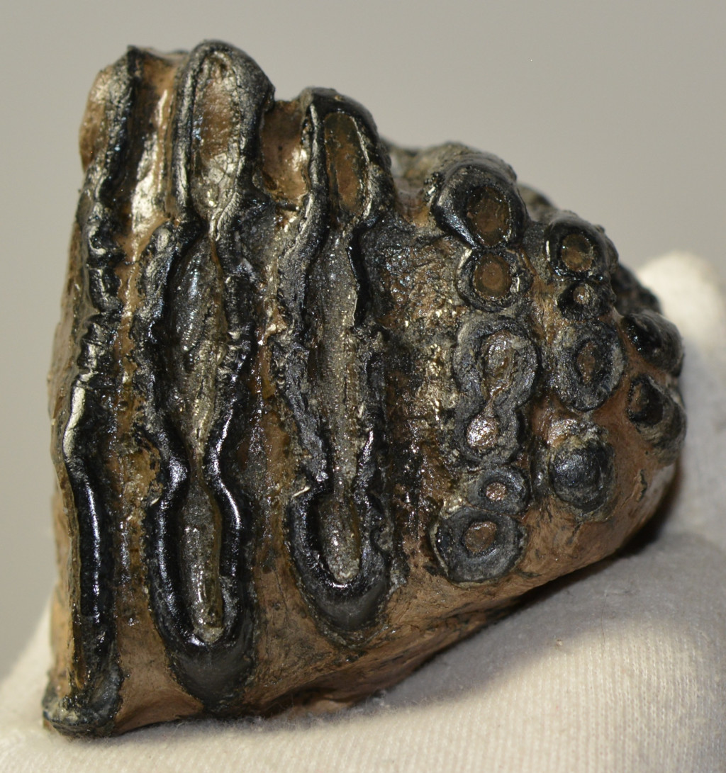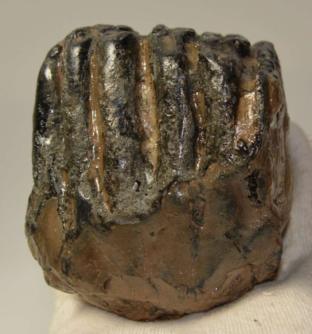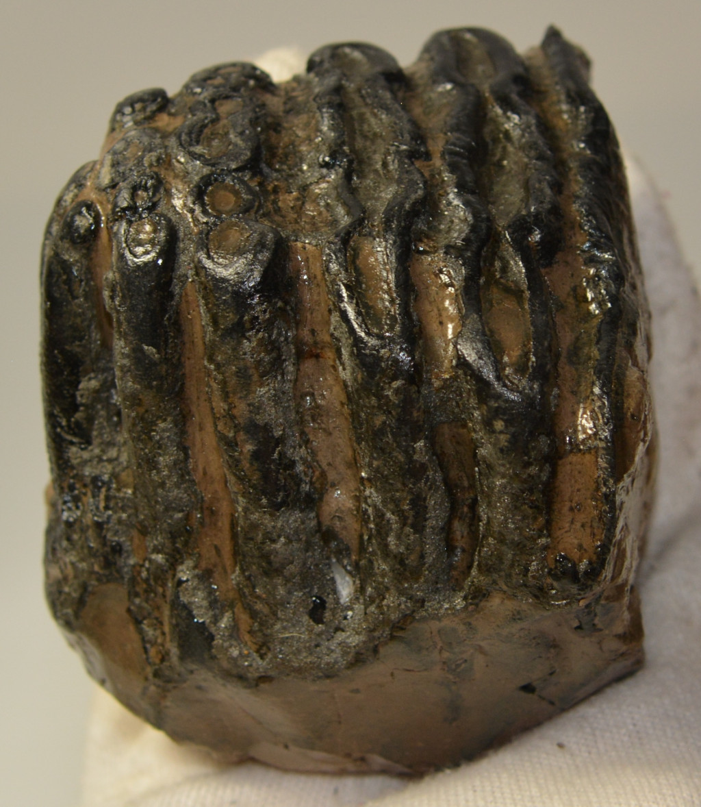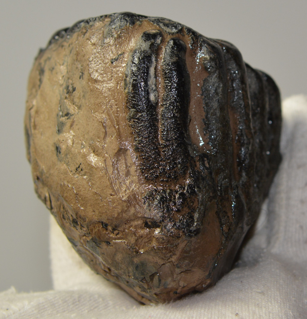 Mammuthus meridionalis (déli mamut) részleges fog. A mamut fosszília Magyarországon, Pest megyében kavicsbányászat során került a felszínre. A fog méretei kb: hosszúsága 79 mm, magassága 86 mm, szélessége 84 mm. Tömege kb: 583 gramm + csomagolás. A fog felülete ethanolba oldott Polyvinyl Butyral 30 nevű anyaggal van konzerválva.