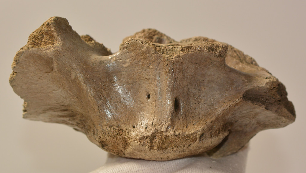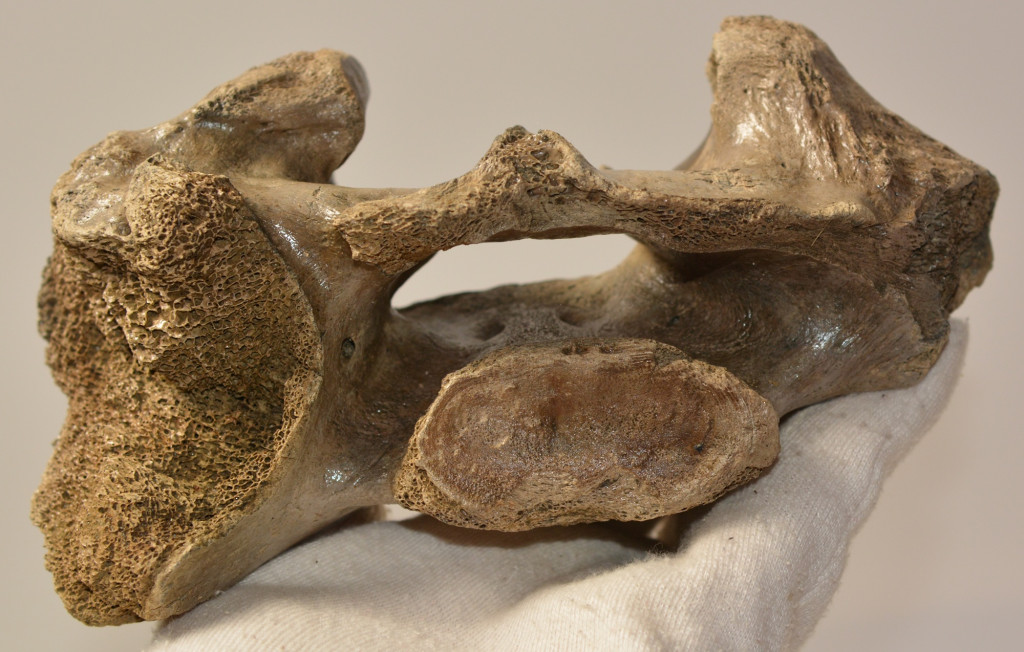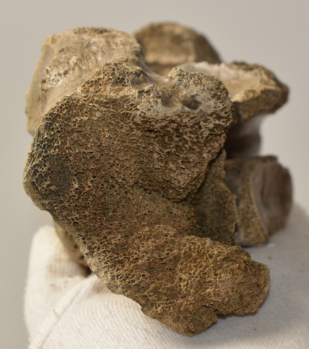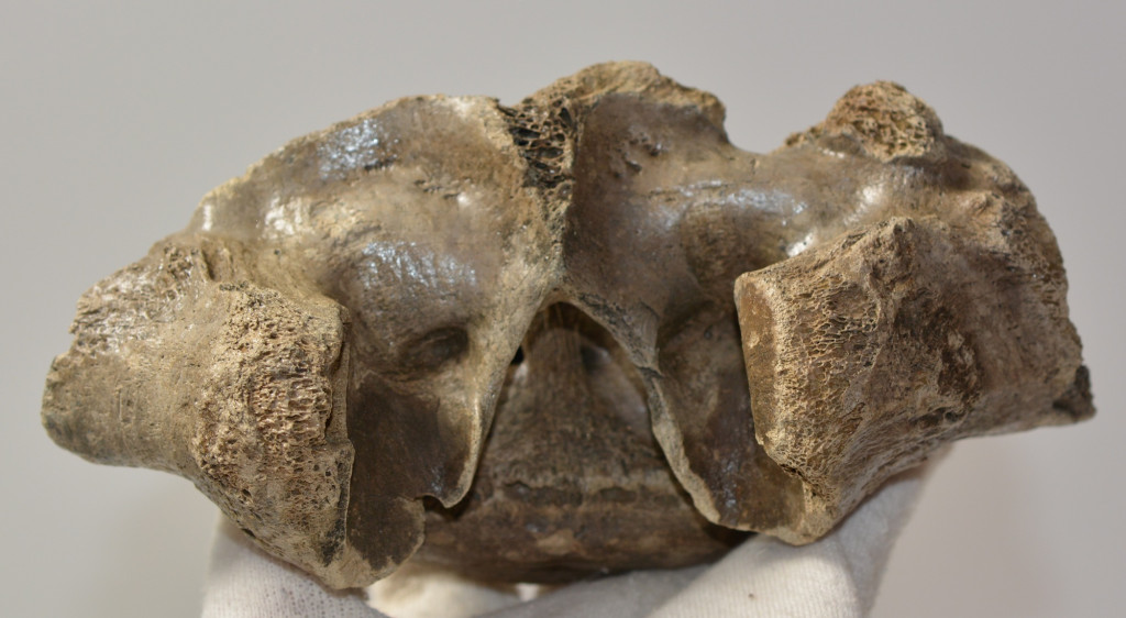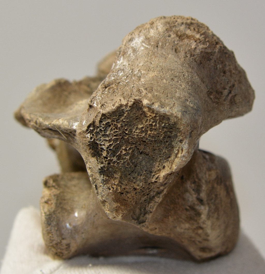 Bison priscus (sztyeppei bölény) részleges sacrum csigolya csont. A bölény fosszília Magyarországon, Pest megyében kavicsbányászat során került a felszínra. A bölény fosszília méretei kb: hosszúsága 85 mm, magassága 84 mm, szélessége 180 mm. Tömege kb: 563 gramm + csomagolás. A fosszília felülete ethanolba oldott Polyvinyl Butyral 30 nevű anyaggal van konzerválva.