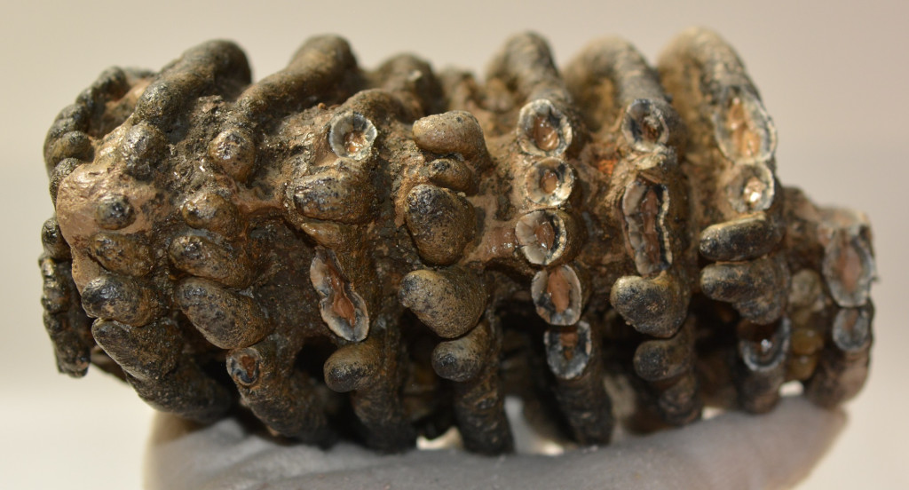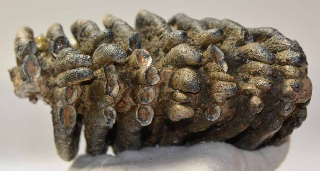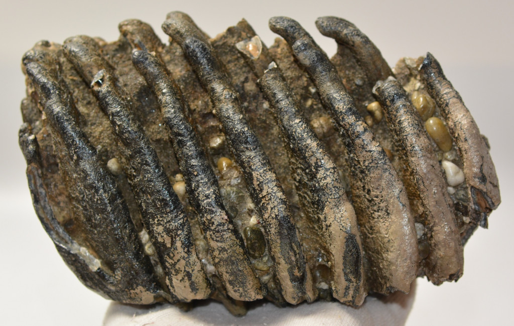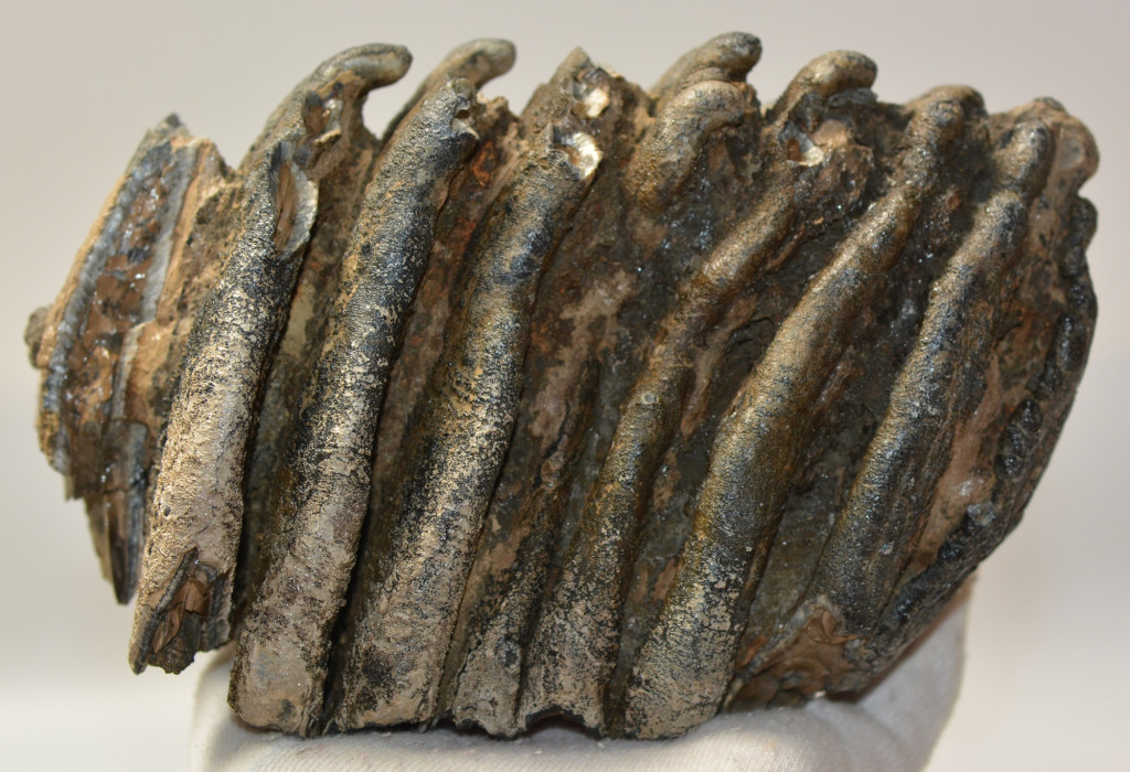 Mammuthus meridionalis (déli mamut) részleges fog. A mamut fosszília Magyarországon, Pest megyében kavicsbányászat során került a felszínre. A fog méretei kb: hosszúsága 176 mm, magassága 121 mm, szélessége 93 mm. Tömege kb: 1819 gramm + csomagolás. A fog felülete ethanolba oldott Polyvinyl Butyral 30 nevű anyaggal van konzerválva. A fog érdekessége, hogy még nincs teljesen kifejlődve, a mamut még nem rágott ezzel a fogával. A fogon homok és kavics rákövesedések láthatóak.
