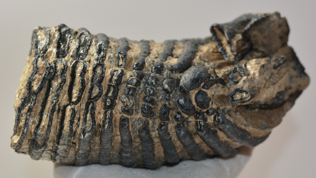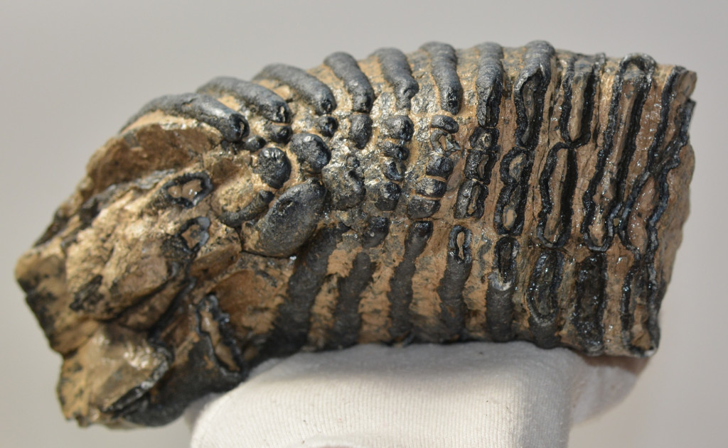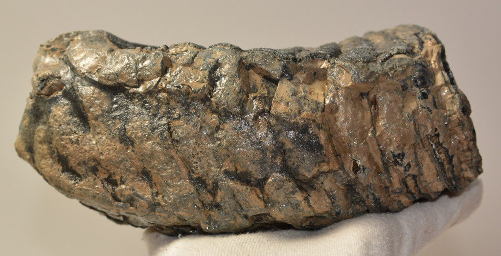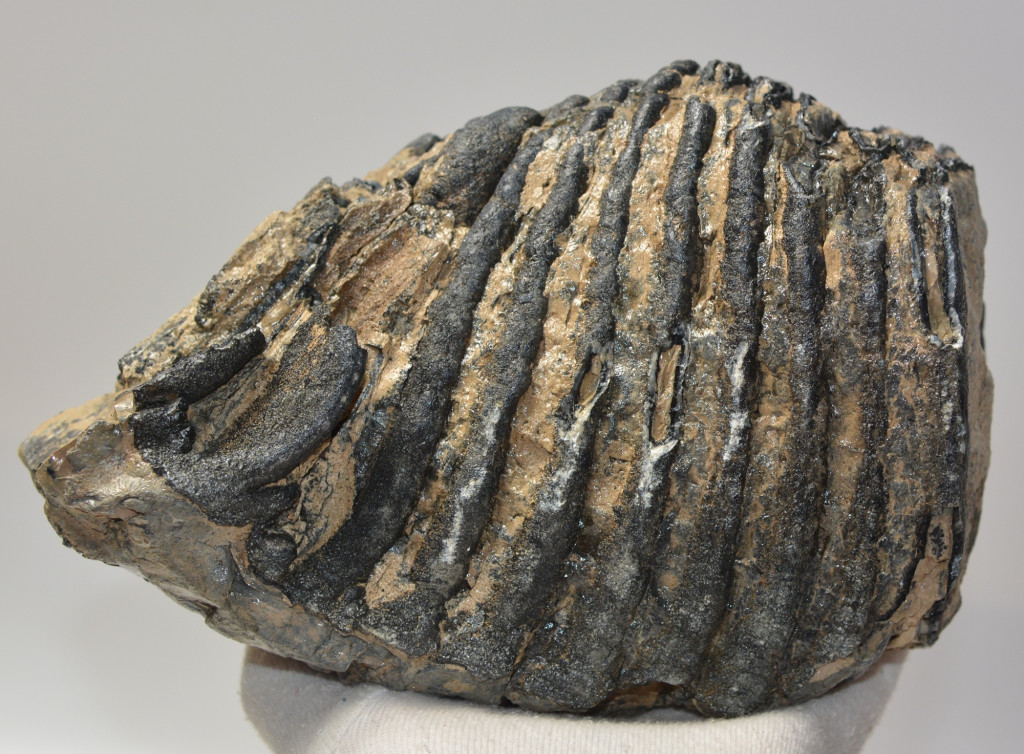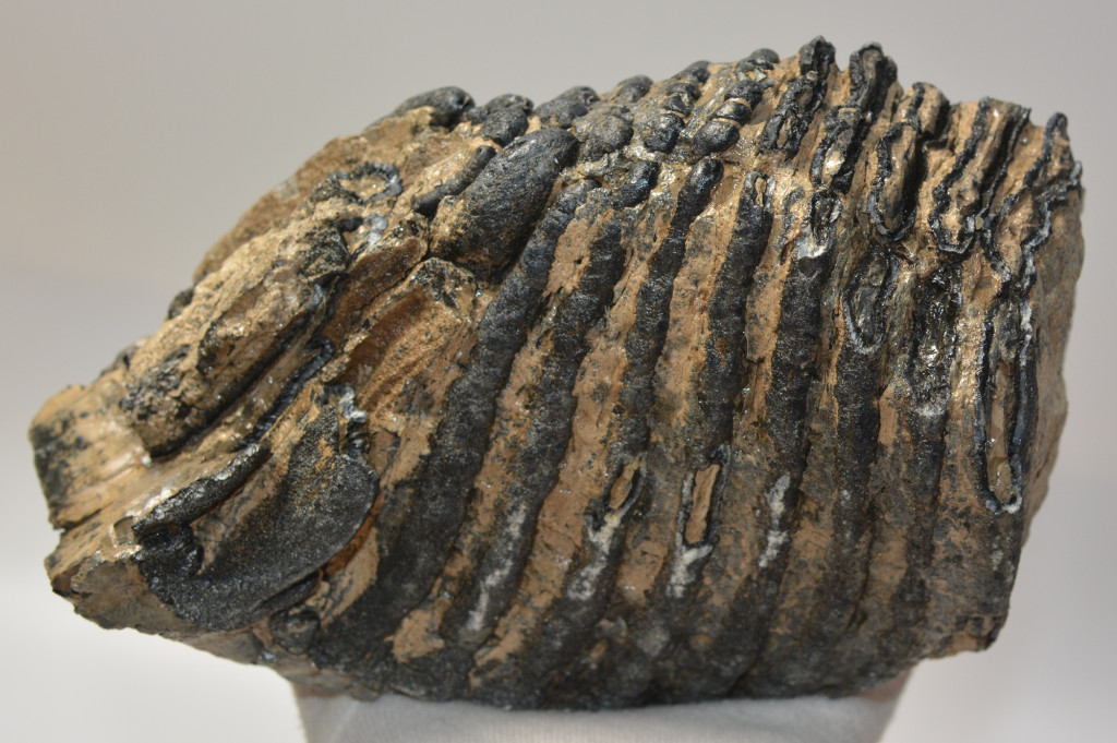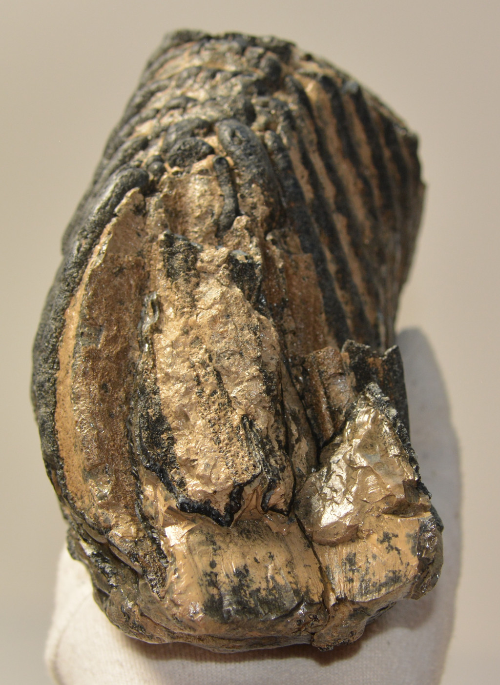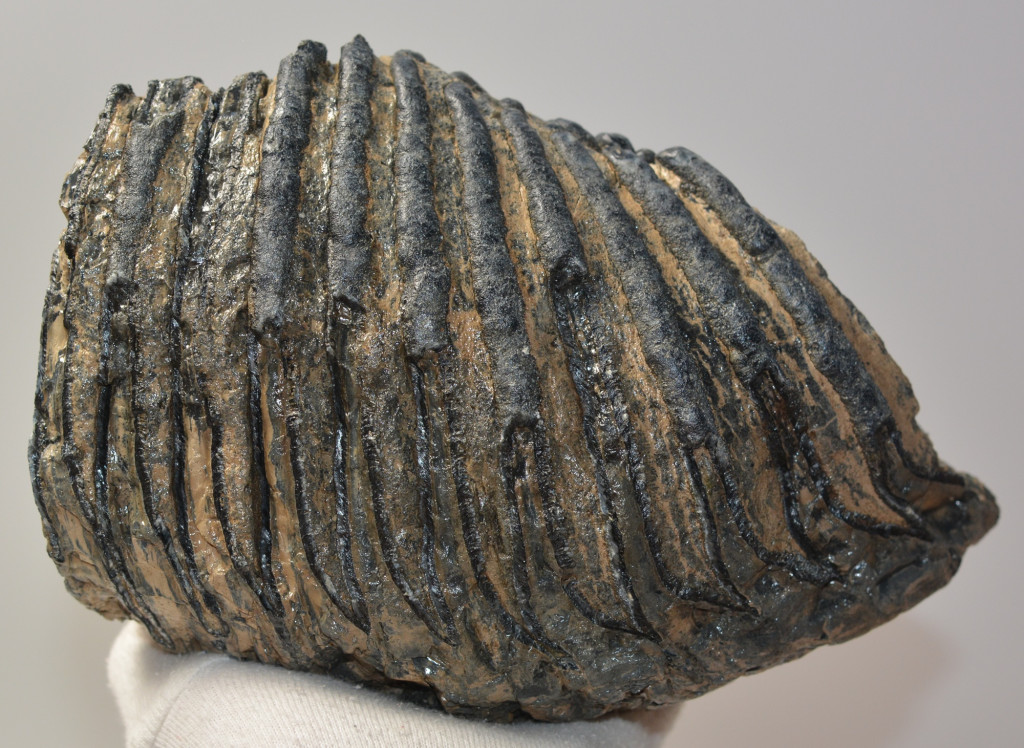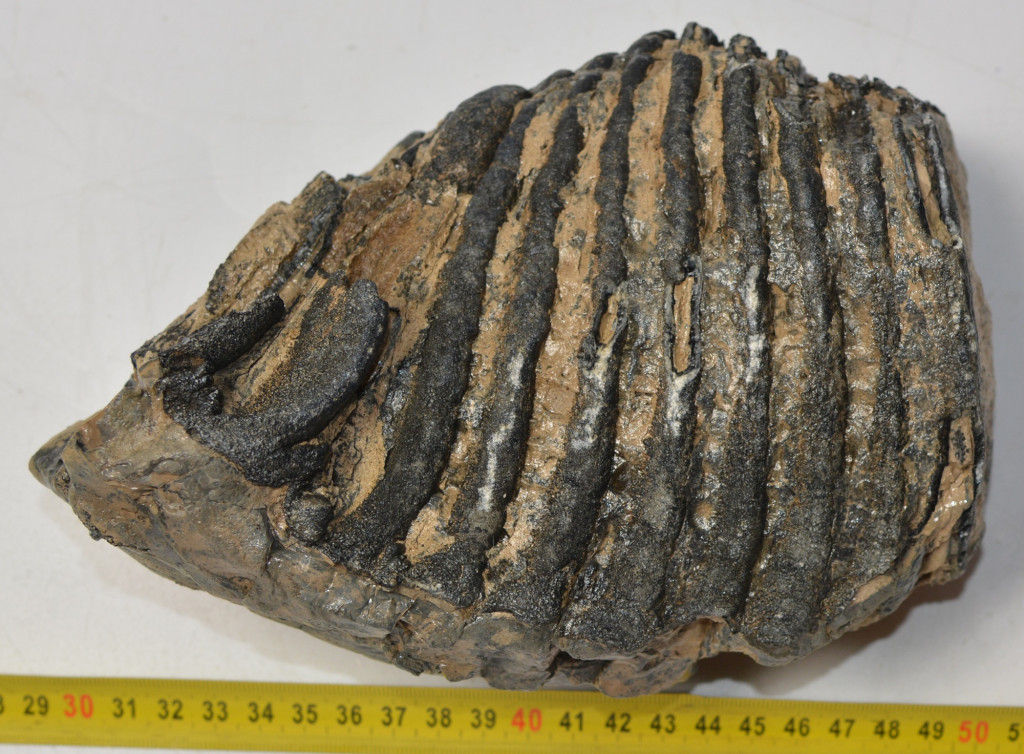 Mammuthus primigenius (gyapjas mamut) részleges fog. A mamut fosszília Magyarországon, Pest megyében kavicsbányászat során került a felszínre. A fog méretei kb: hosszúsága 207 mm, magassága 142 mm, szélessége 88 mm. Tömege kb: 2577 gramm + csomagolás. A fog felülete ethanolba oldott Polyvinyl Butyral 30 nevű anyaggal van konzerválva.