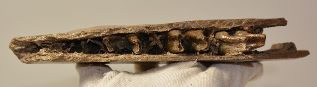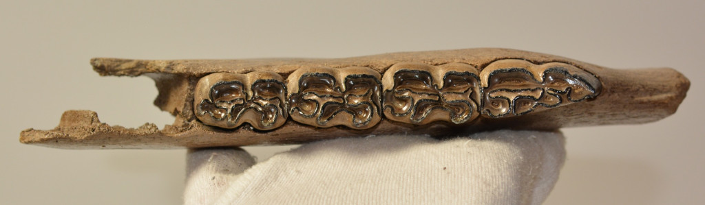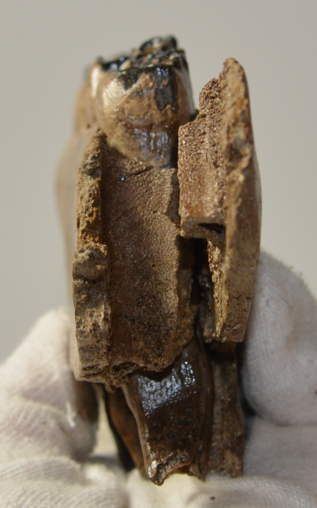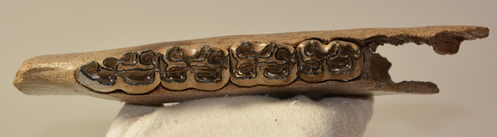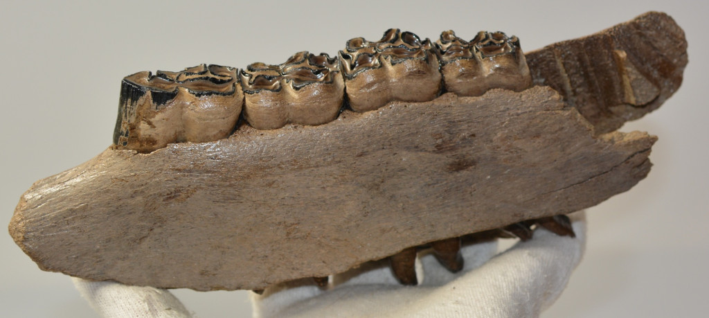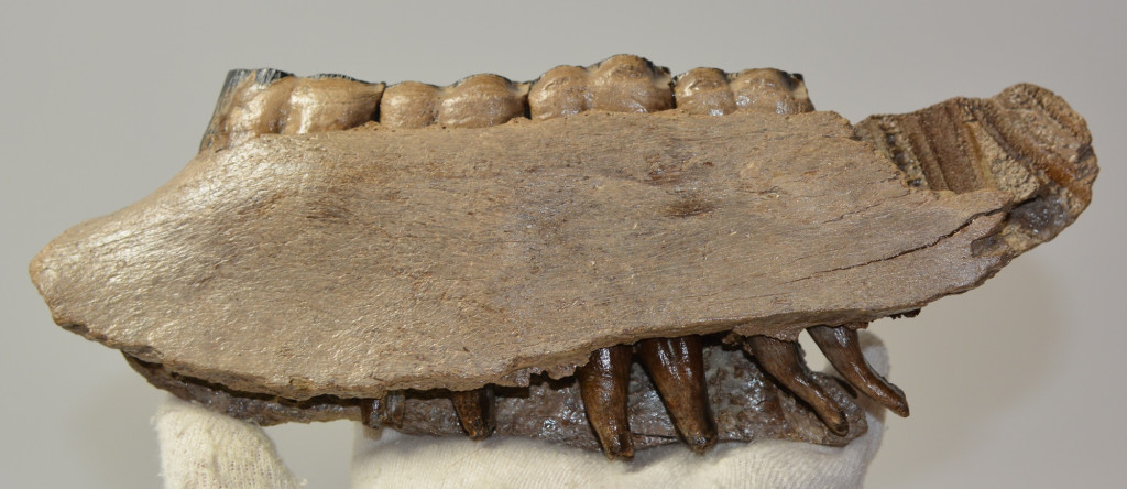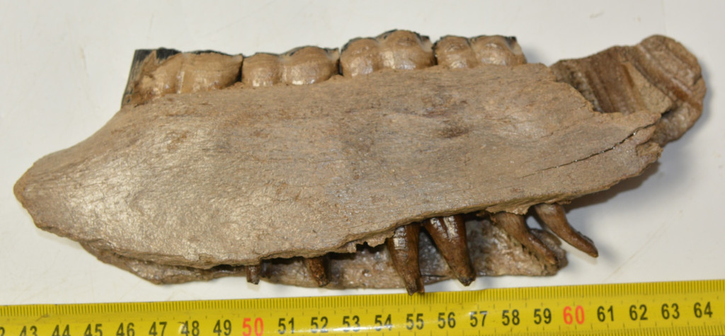 Pleisztocén korú ló (Equus sp.) részleges állkapcsa. A ló fosszília Magyarországon, Pest megyében kavicsbányászat során került a felszínre. Az állkapocsban 4 db egész fog látható. Az állkapocs méretei kb: hosszúsága 223 mm, magassága 87,9 mm, szélessége 30,3 mm. Tömege kb: 428 gramm + csomagolás. Az állkapocs felülete ethanolba oldott Polyvinyl Butyral 30 nevű anyaggal van konzerválva.