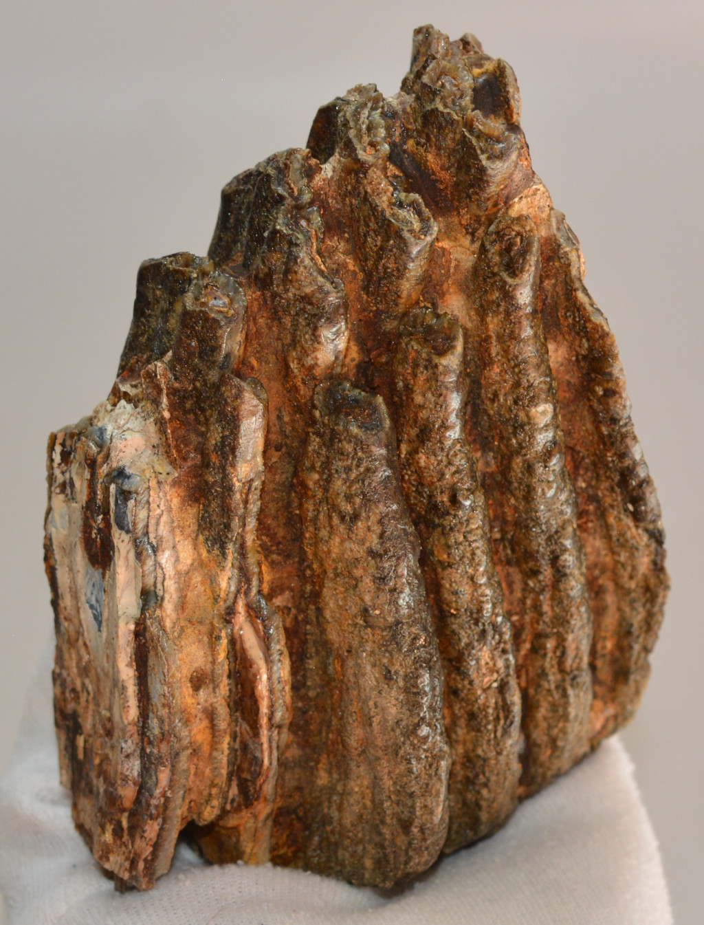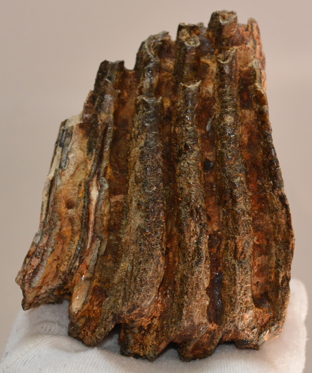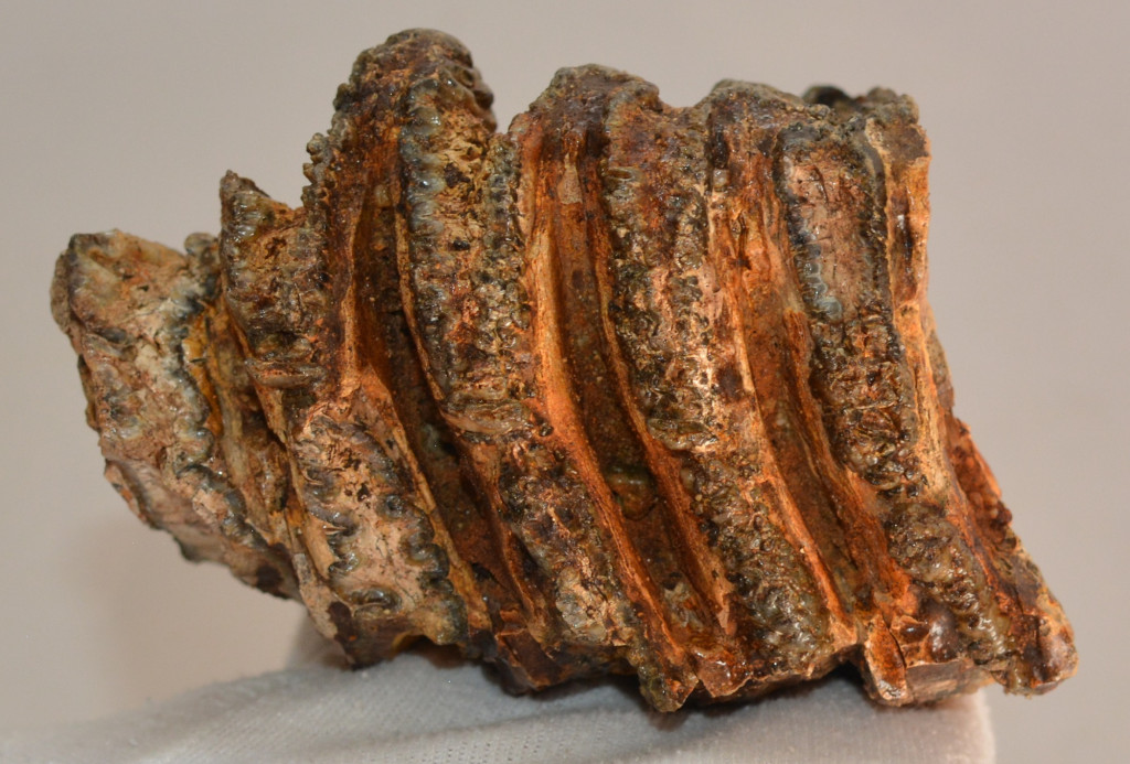 Mammuthus primigenius (gyapjas mamut) részleges fog. A mamut fosszília Magyarországon, Pest megyében kavicsbányászat során került a felszínre. A fog méretei kb: hosszúsága 95 mm, magassága 132 mm, szélessége 74 mm. Tömege kb: 807 gramm + csomagolás. A fog felülete ethanolba oldott Polyvinyl Butyral 30 nevű anyaggal van konzerválva.