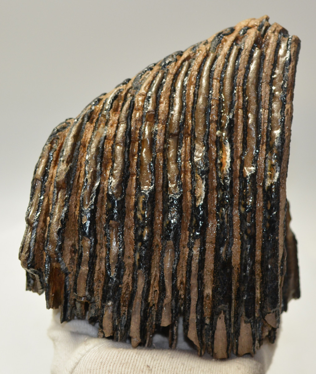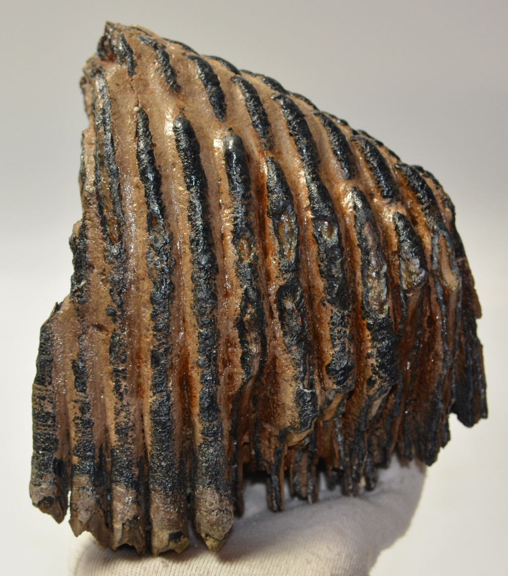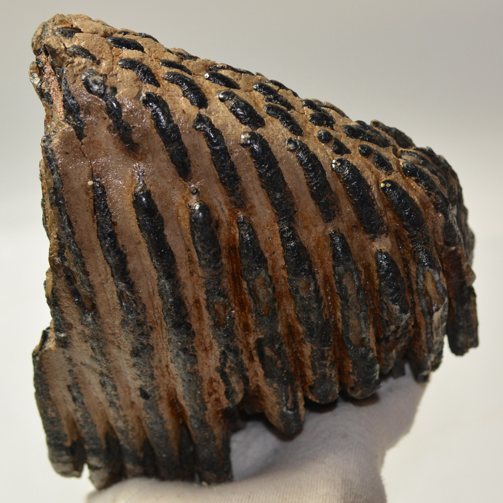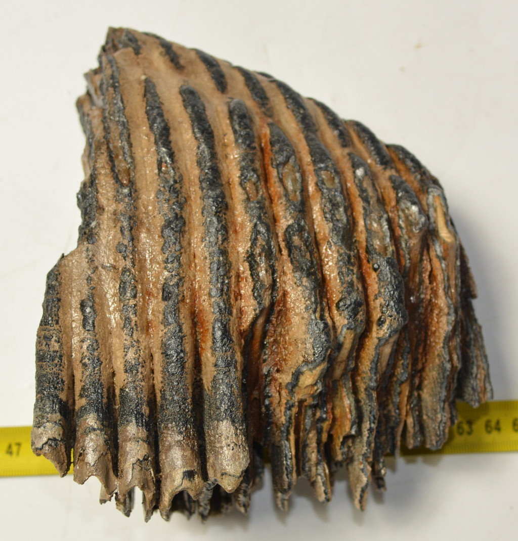 Mammuthus primigenius (gyapjas mamut) részleges fog. A mamut fosszília Magyarországon, Pest megyében kavicsbányászat során került a felszínre. A fog méretei kb: hosszúsága 146 mm, magassága 171 mm, szélessége 88 mm. Tömege kb: 1974 gramm + csomagolás. A fog felülete ethanolba oldott Polyvinyl Butyral 30 nevű anyaggal van konzerválva.