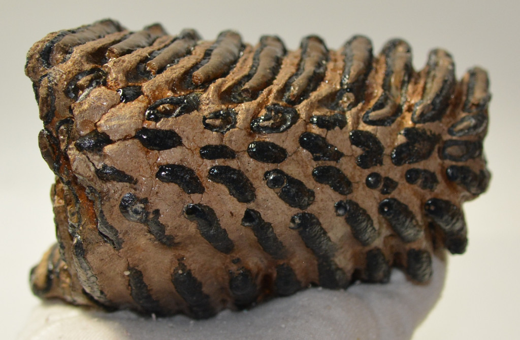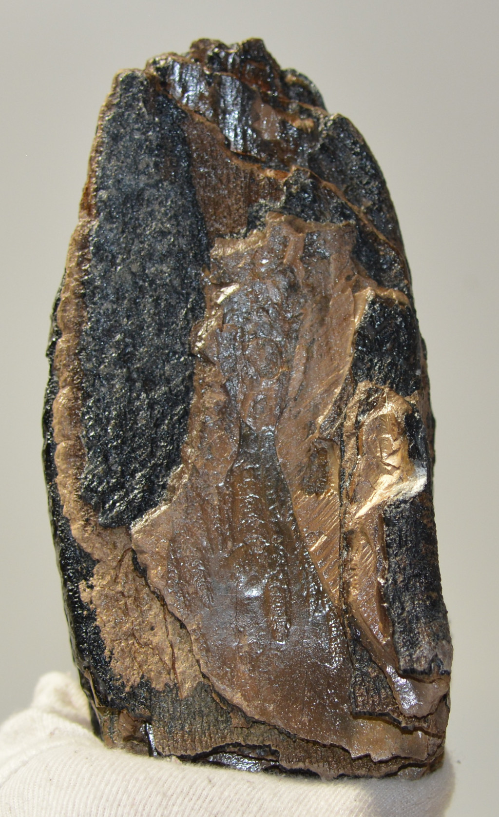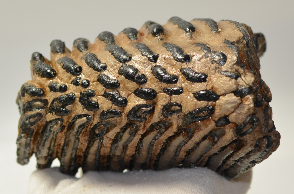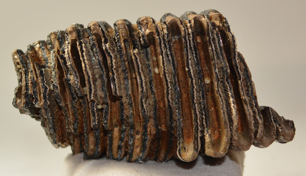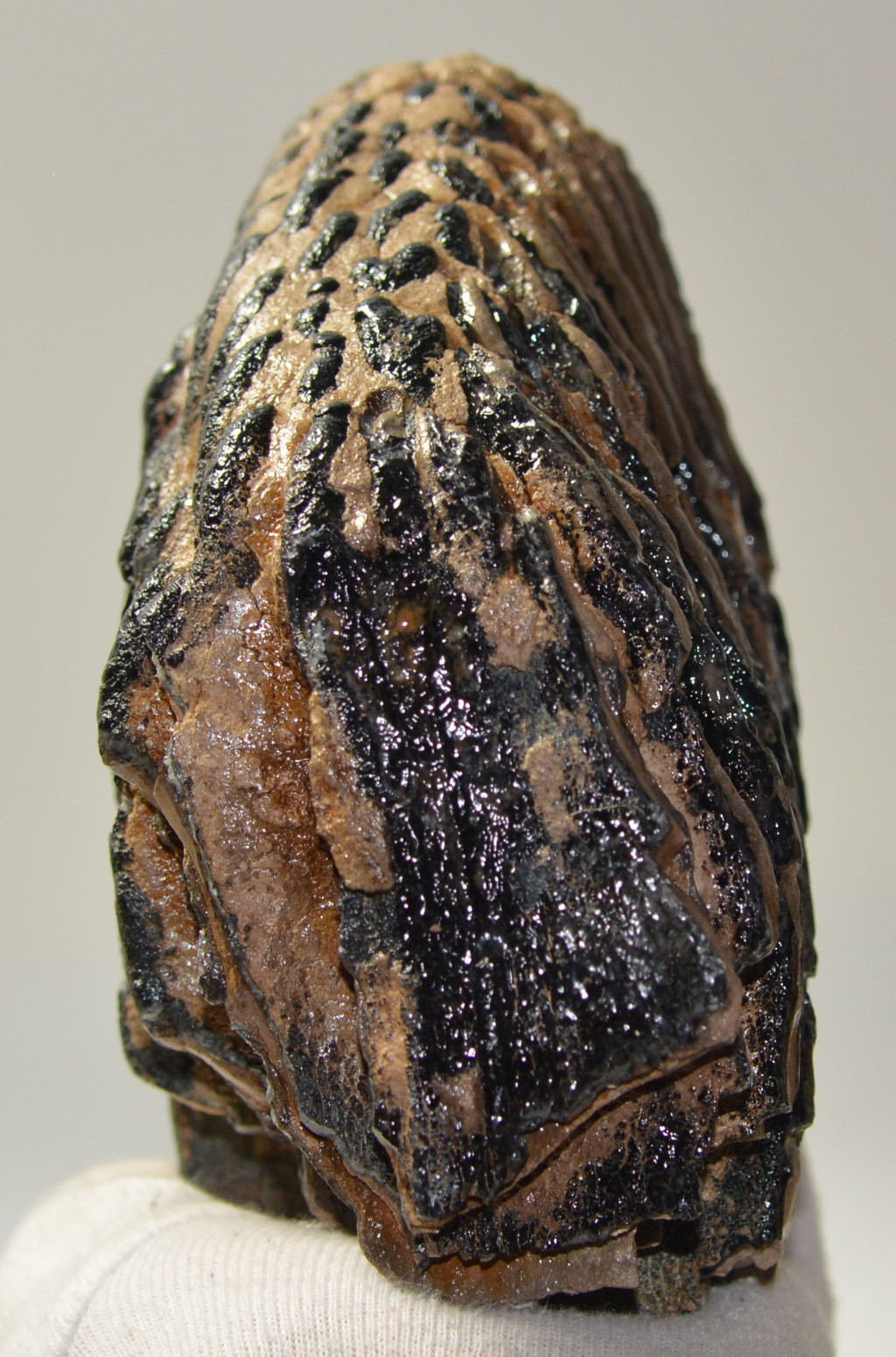 Mammuthus primigenius (gyapjas mamut) részleges fog. A mamut fosszília Magyarországon, Pest megyében kavicsbányászat során került a felszínre. A fog méretei kb: hosszúsága 146 mm, magassága 171 mm, szélessége 88 mm. Tömege kb: 1974 gramm + csomagolás. A fog felülete ethanolba oldott Polyvinyl Butyral 30 nevű anyaggal van konzerválva.