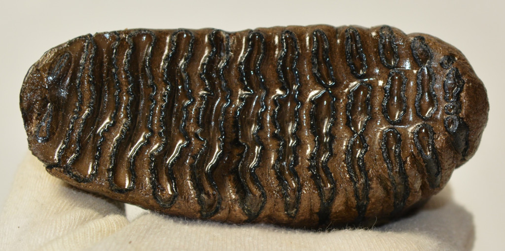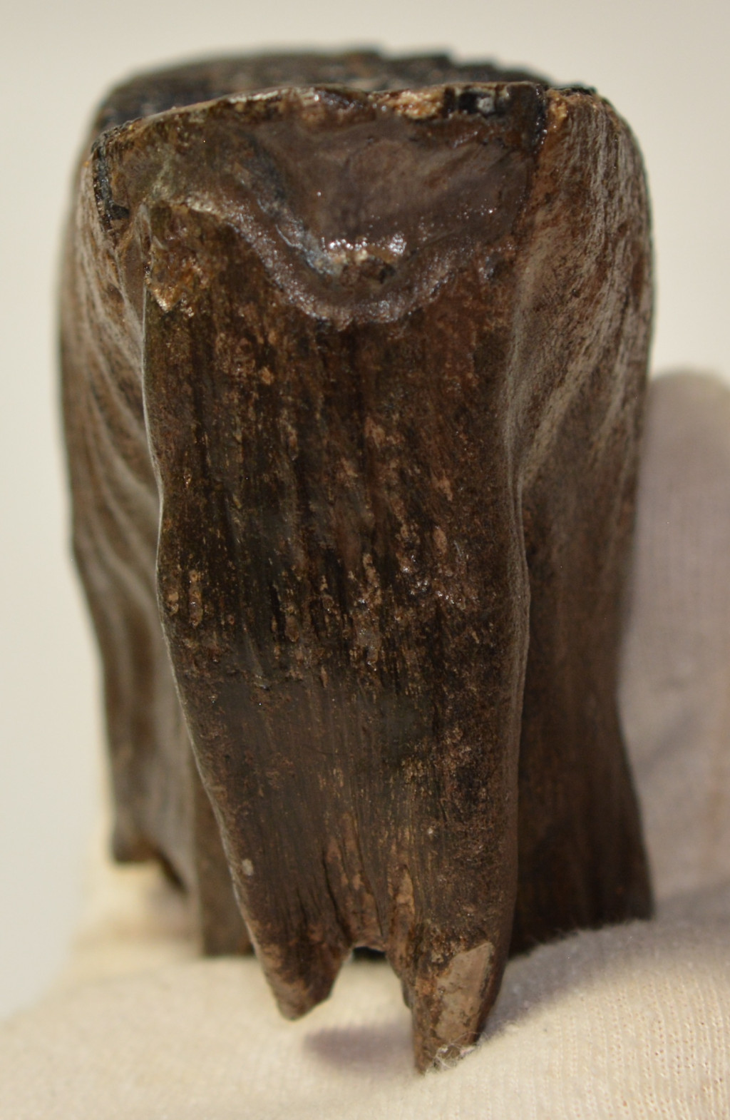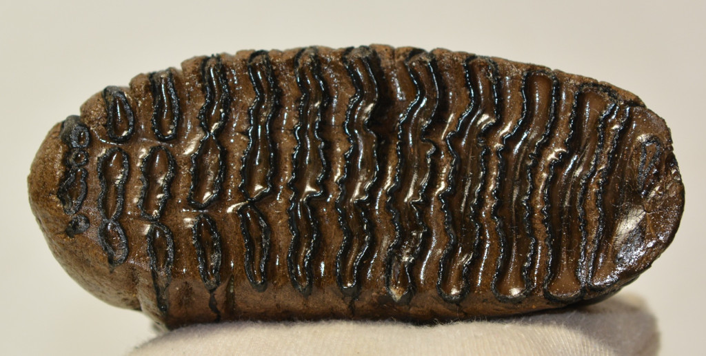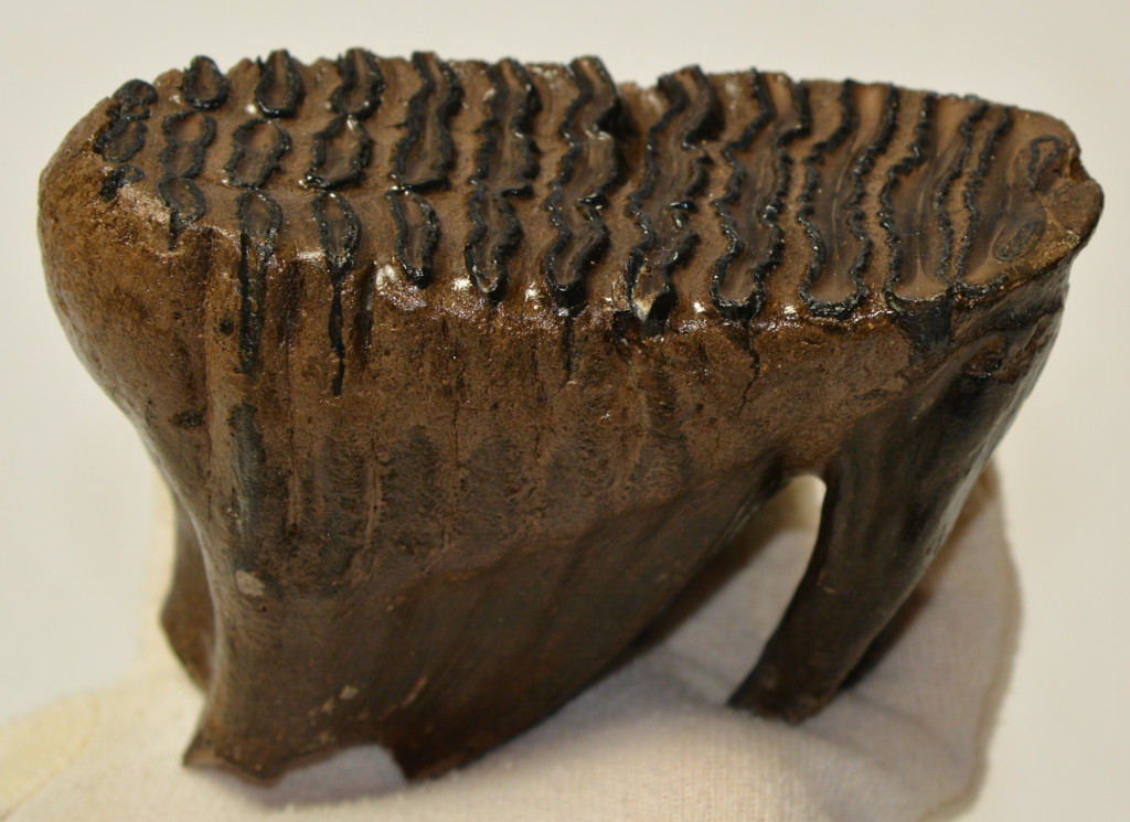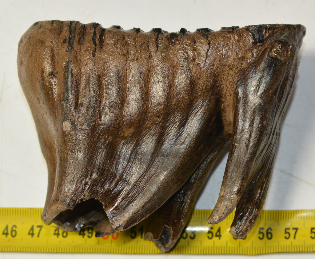 Mammuthus primigenius (gyapjas mamut) fiatal állat foga. A mamut fosszília Magyarországon, Pest megyében kavicsbányászat során került a felszínre. A fog méretei kb: hosszúsága 109 mm, magassága 81 mm, szélessége 48 mm. Tömege kb: 397 gramm + csomagolás. A fog felülete ethanolba oldott Polyvinyl Butyral 30 nevű anyaggal van konzerválva.