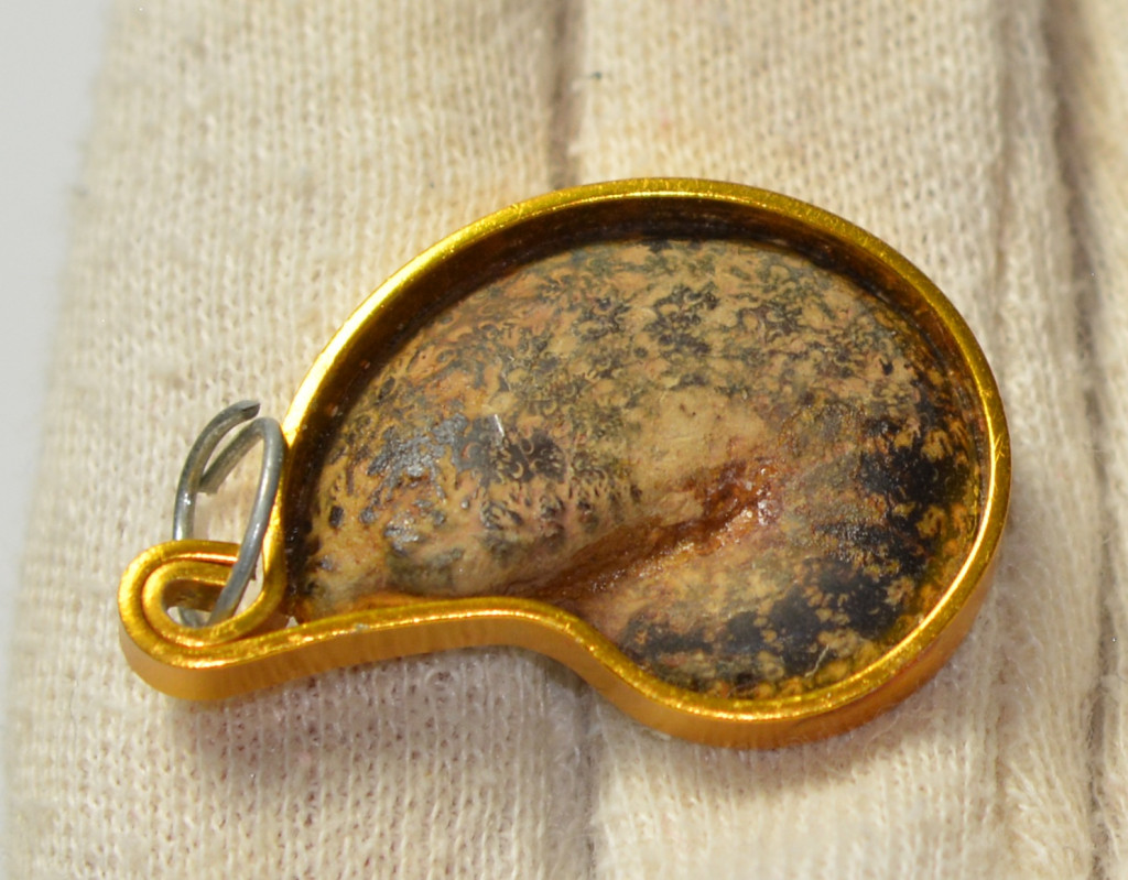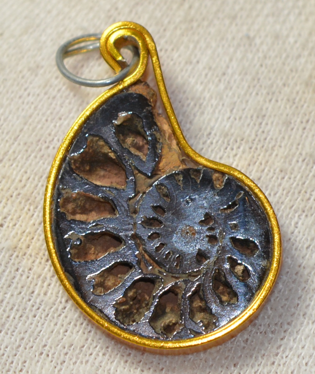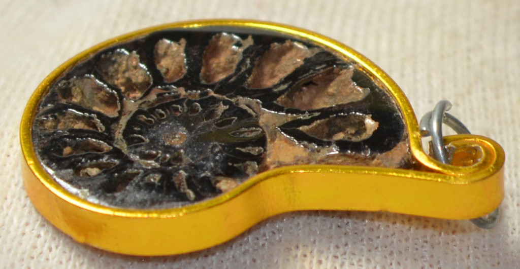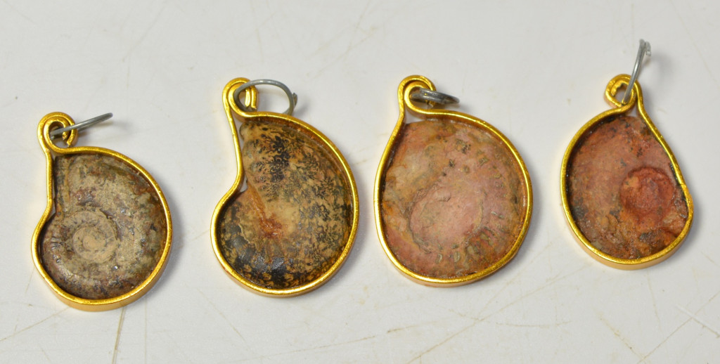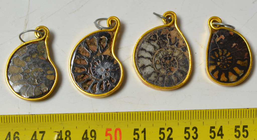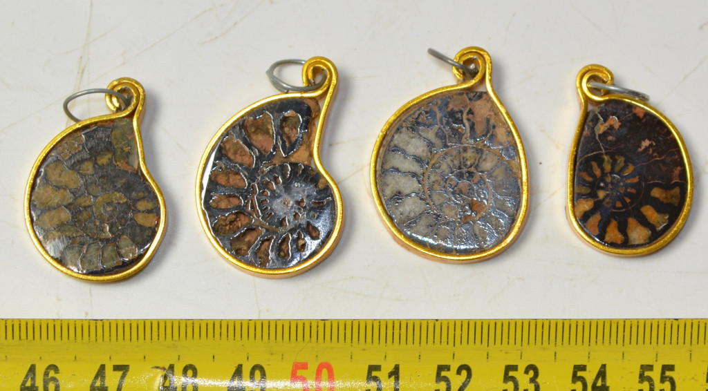 4 db kréta korú, egy oldalán csiszolt hematitos kalcitos ammonitesz medálnak elkészítve. 4 db ammonitesz arany színű fémmel van kötbefogatva. Az ammoniteszek származási helye Marokkó. Az ammonitesz medálok méretei kb: hosszúság 34 - 29,6 mm közötti, szélesség 23,8 - 18,7 mm közötti, vastagság 3,5- 4,9 mm közötti. Tömeg kb: 4 - 3 gramm/db közötti A 4 db ammonitesz medál tömege kb: 14 gramm + csomagolás.