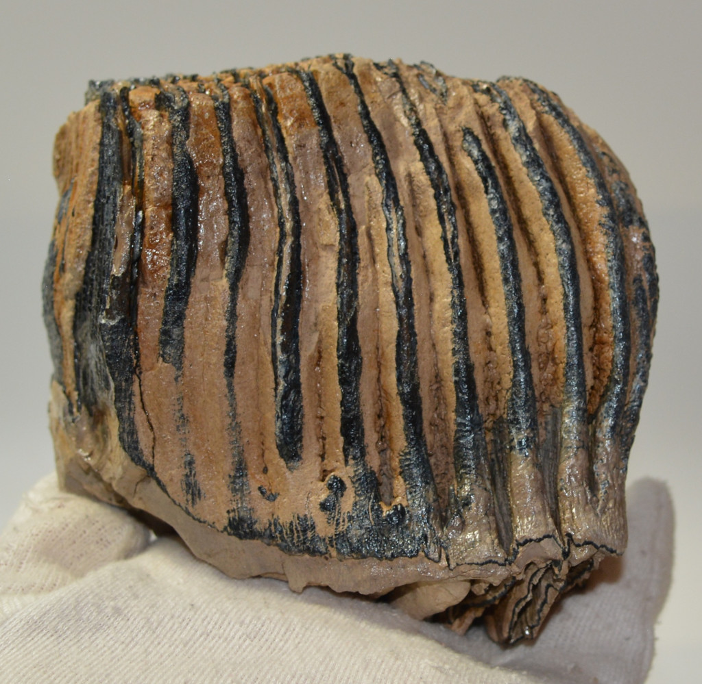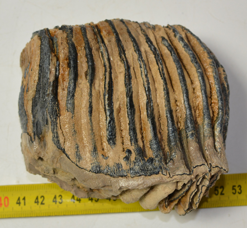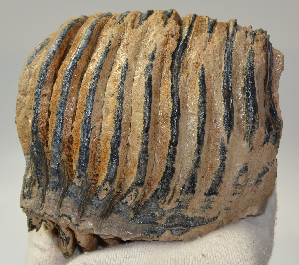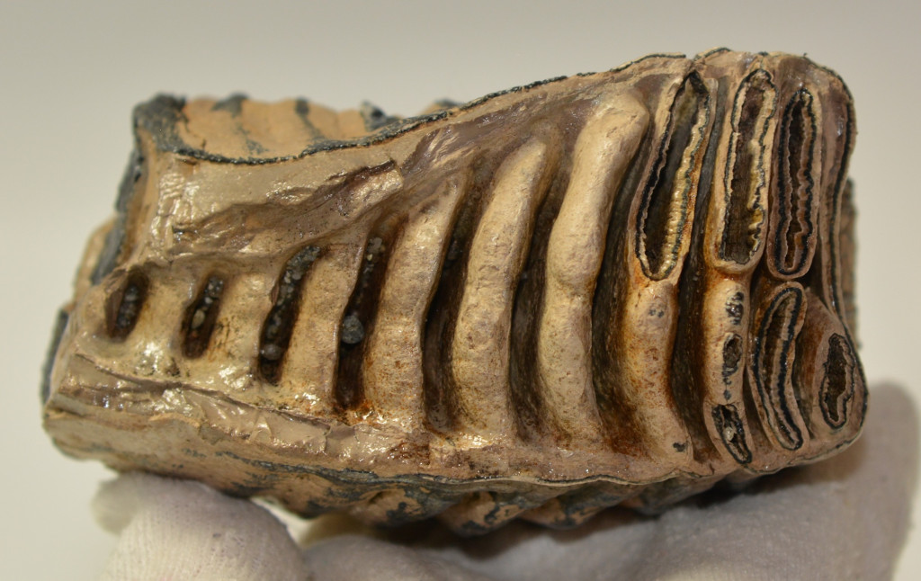 Mammuthus primigenius (gyapjas mamut) részleges fog. A mamut fosszília Magyarországon, Pest megyében kavicsbányászat során került a felszínre. A fog méretei kb: hosszúsága 110 mm, magassága 105 mm, szélessége 60 mm. Tömege kb: 732 gramm + csomagolás. A fog felülete ethanolba oldott Polyvinyl Butyral 30 nevű anyaggal van konzerválva.