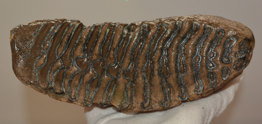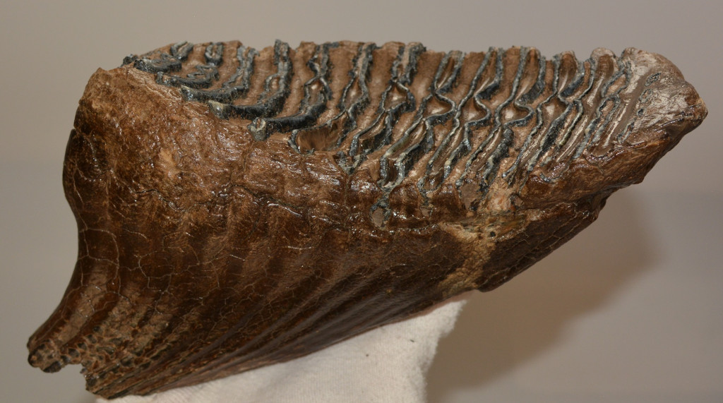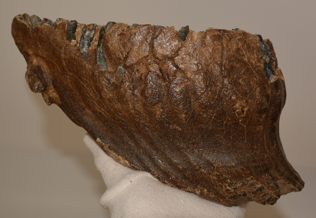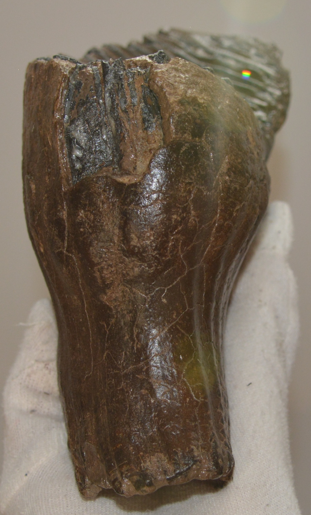 Mammuthus primigenius (gyapjas mamut) jobb alsó fog. A mamut fosszília Magyarországon, Pest megyében kavicsbányászat során került a felszínre. A fog méretei kb: hosszúsága 217 mm, magassága 130 mm, szélessége 87 mm. Tömege kb: 1889 gramm + csomagolás. A fog felülete ethanolba oldott Polyvinyl Butyral 30 nevű anyaggal van konzerválva.