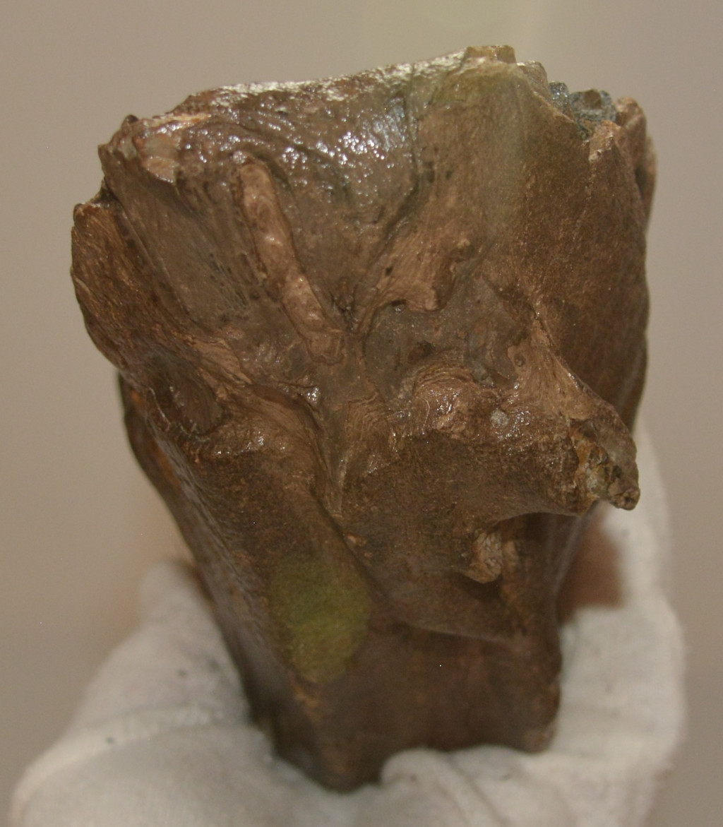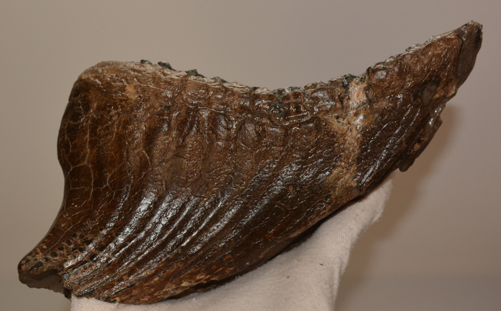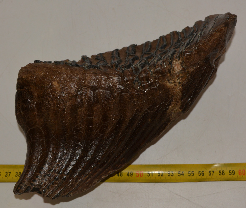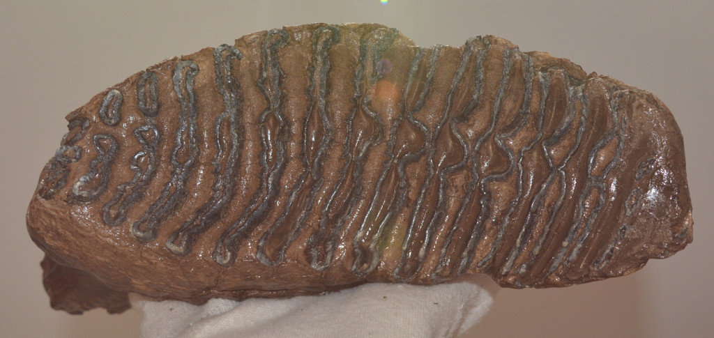 Mammuthus primigenius (gyapjas mamut) jobb alsó fog. A mamut fosszília Magyarországon, Pest megyében kavicsbányászat során került a felszínre. A fog méretei kb: hosszúsága 217 mm, magassága 130 mm, szélessége 87 mm. Tömege kb: 1889 gramm + csomagolás. A fog felülete ethanolba oldott Polyvinyl Butyral 30 nevű anyaggal van konzerválva.