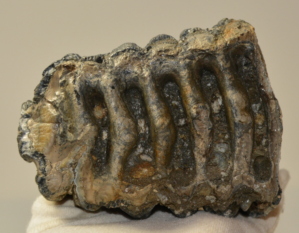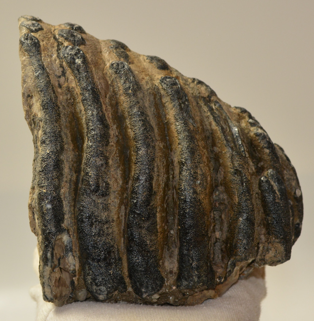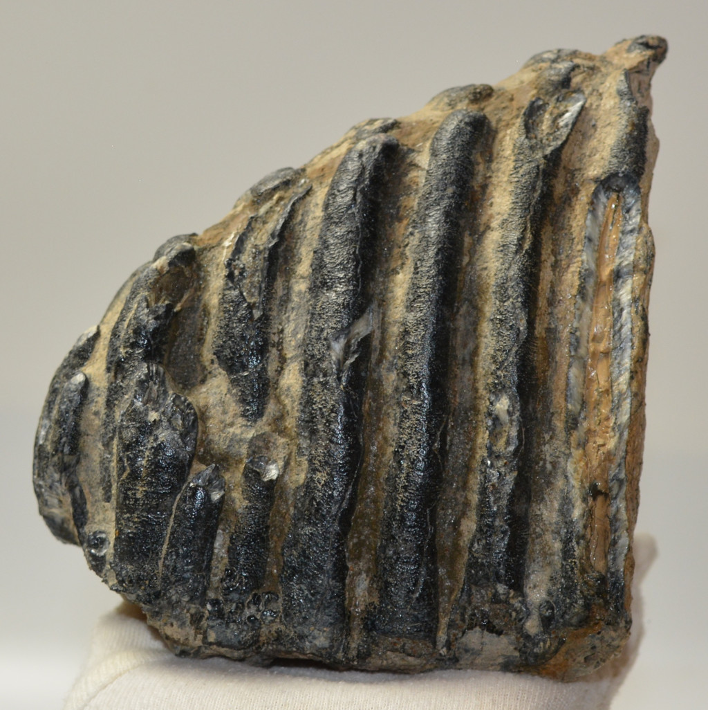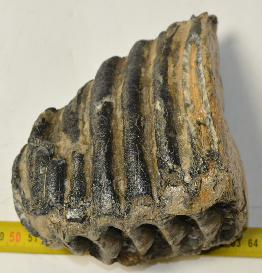 Mammuthus meridionalis (déli mamut) részleges fog. A mamut fosszília Magyarországon, Pest megyében kavicsbányászat során került a felszínre. A fog méretei kb: hosszúsága 129 mm, magassága 139 mm, szélessége 101 mm. Tömege kb: 1752 gramm + csomagolás. A fog felülete ethanolba oldott Polyvinyl Butyral 30 nevű anyaggal van konzerválva.