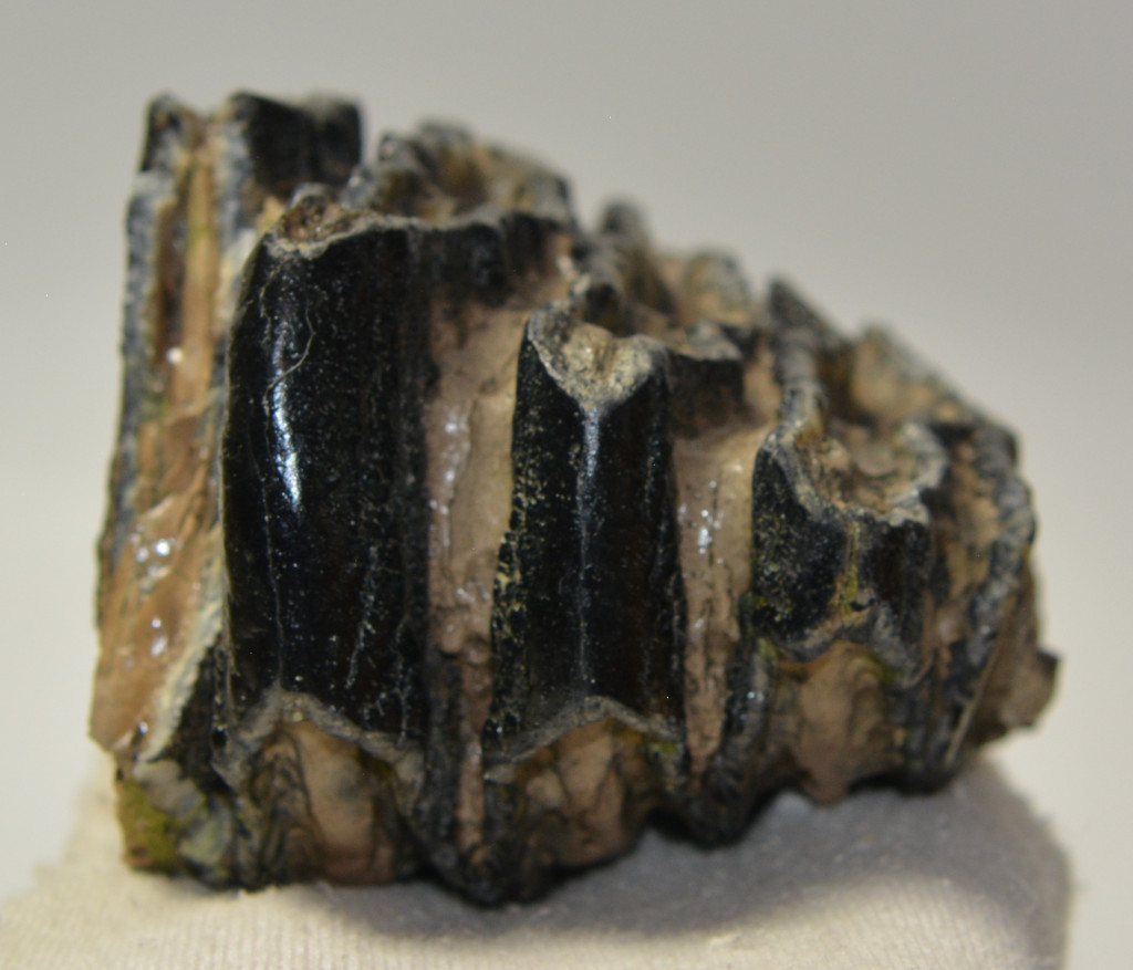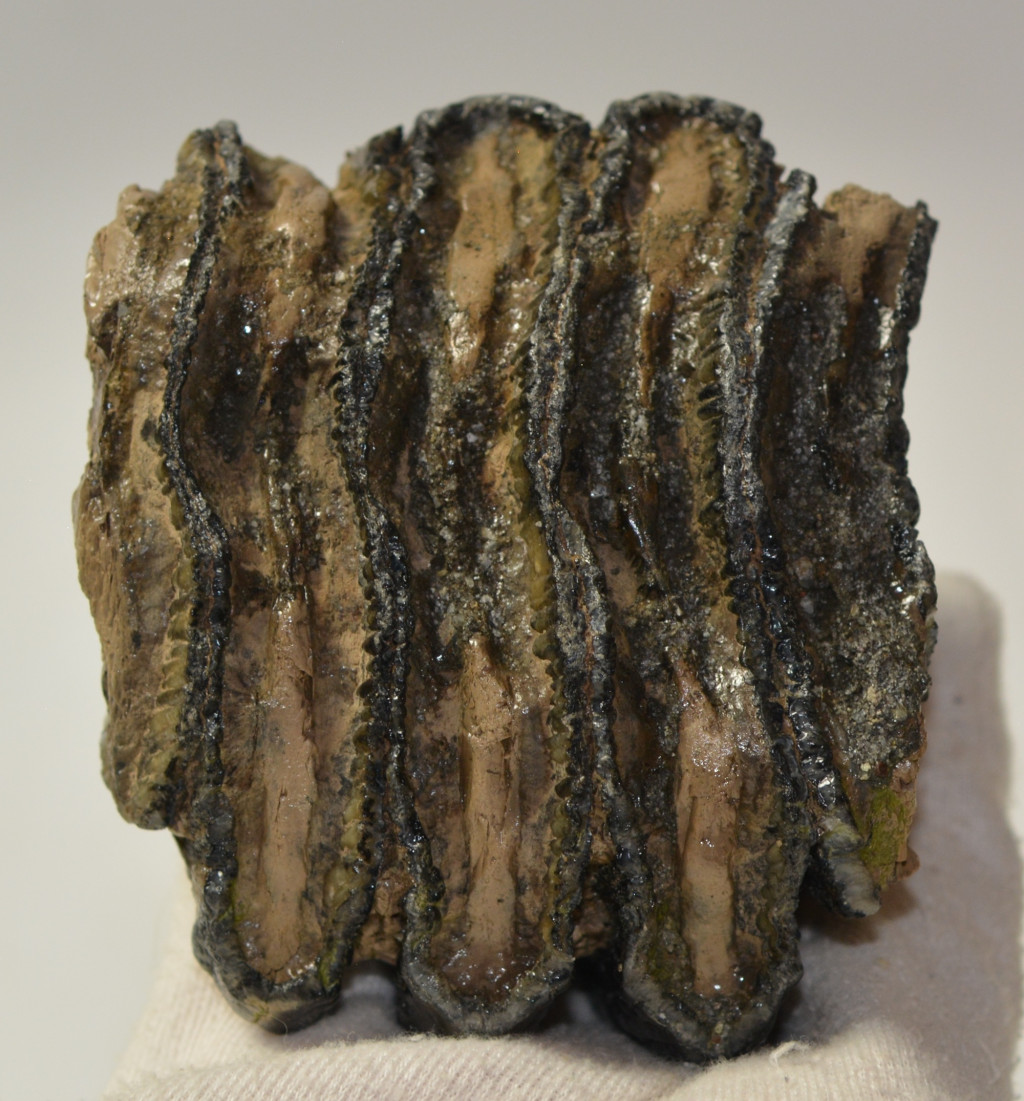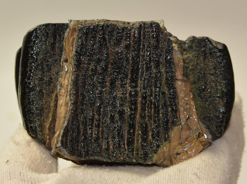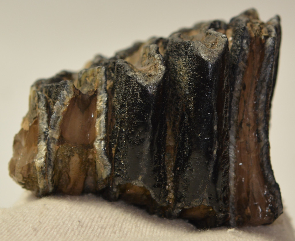 Mammuthus meridionalis (déli mamut) részleges fog. A mamut fosszília Magyarországon, Pest megyében kavicsbányászat során került a felszínre. A fog méretei kb: hosszúsága 87 mm, magassága 66 mm, szélessége 98 mm. Tömege kb: 524 gramm + csomagolás. A fog felülete ethanolba oldott Polyvinyl Butyral 30 nevű anyaggal van konzerválva.