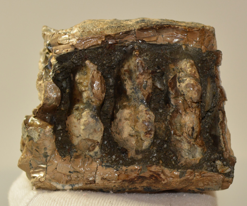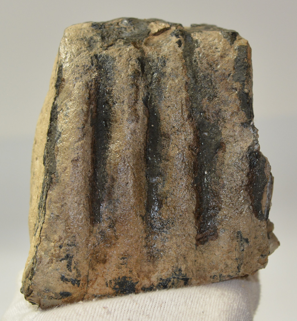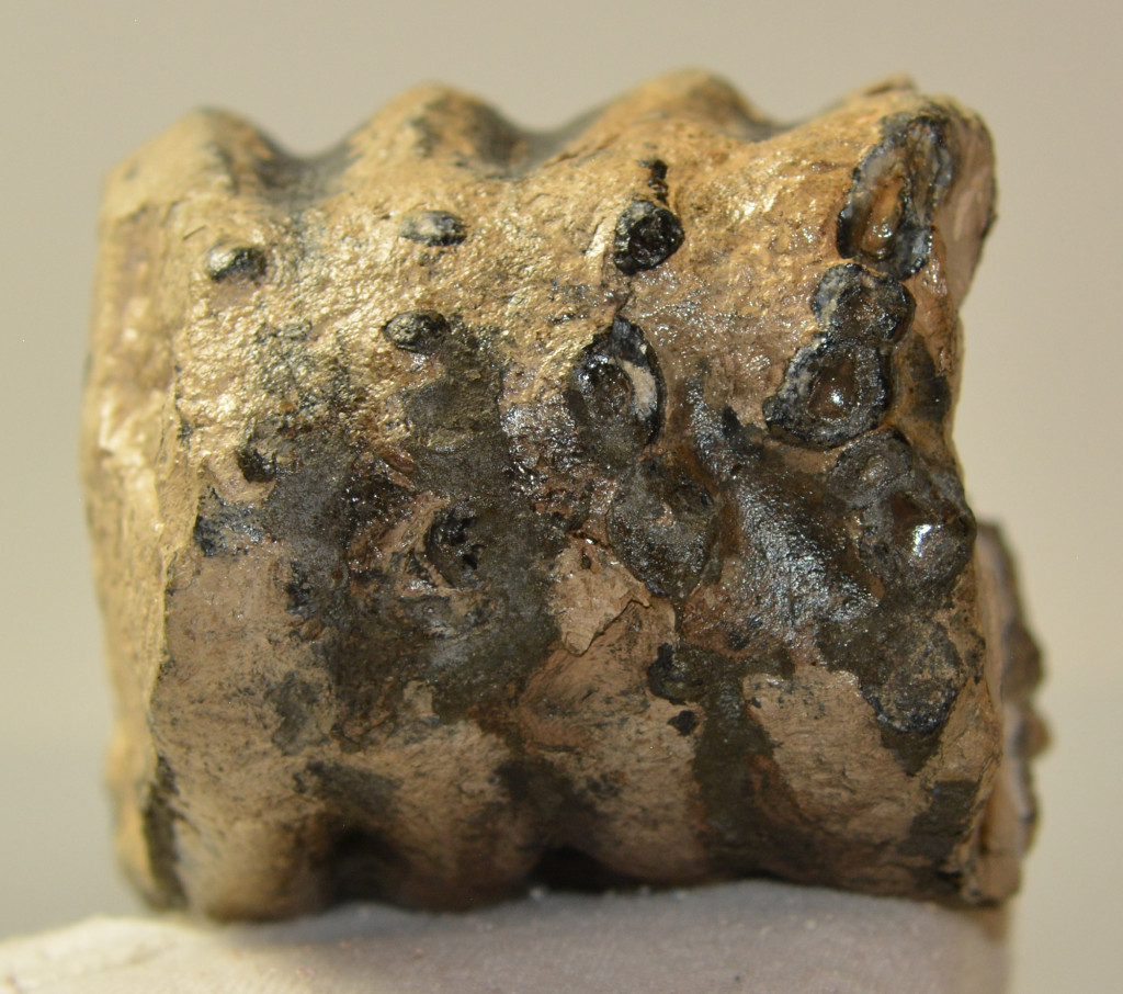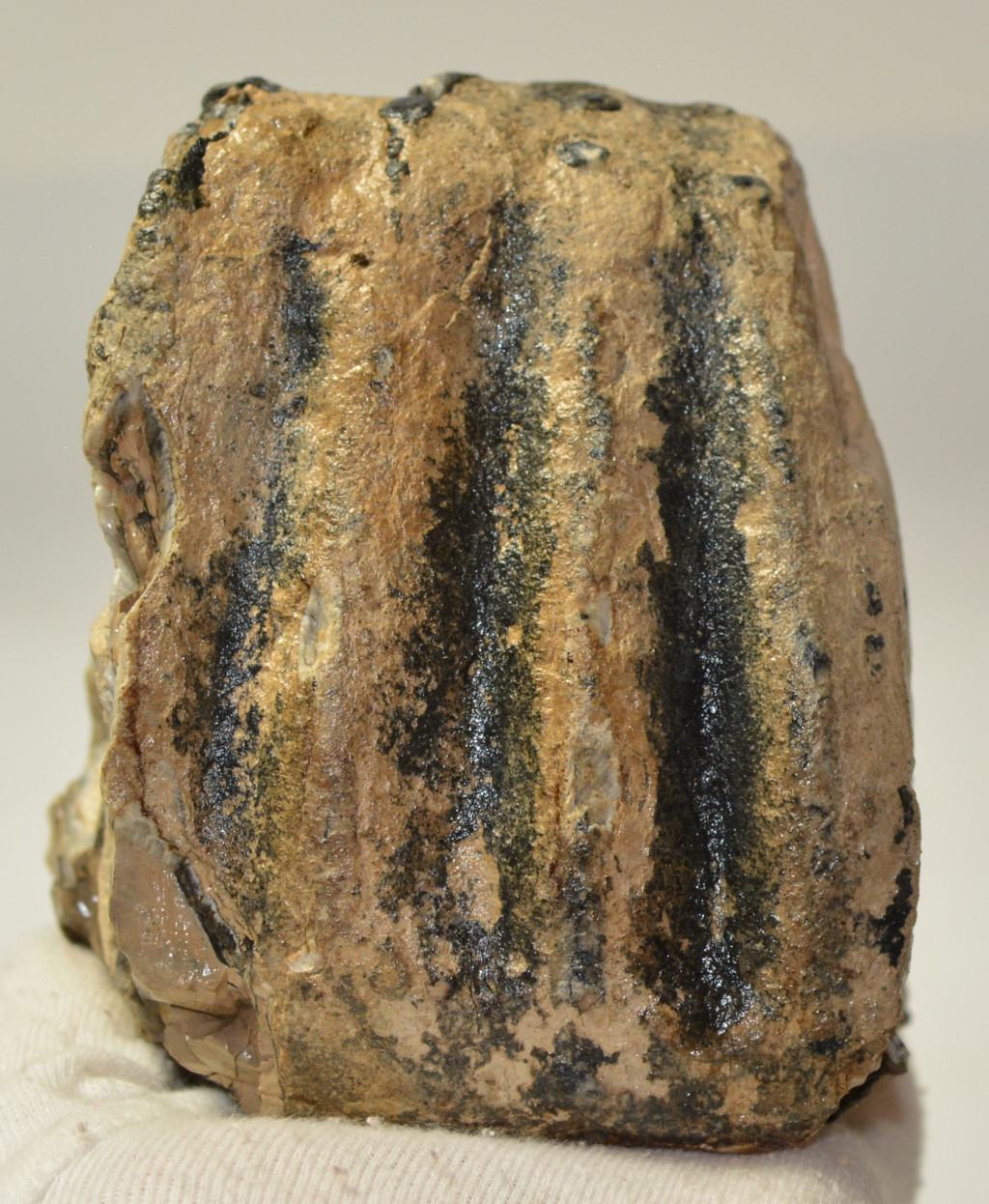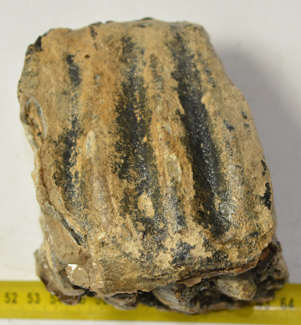 Mammuthus meridionalis (déli mamut) részleges fog. A mamut fosszília Magyarországon, Pest megyében kavicsbányászat során került a felszínre. A fog méretei kb: hosszúsága 104 mm, magassága 125 mm, szélessége 90 mm. Tömege kb: 1460 gramm + csomagolás. A fog felülete ethanolba oldott Polyvinyl Butyral 30 nevű anyaggal van konzerválva.