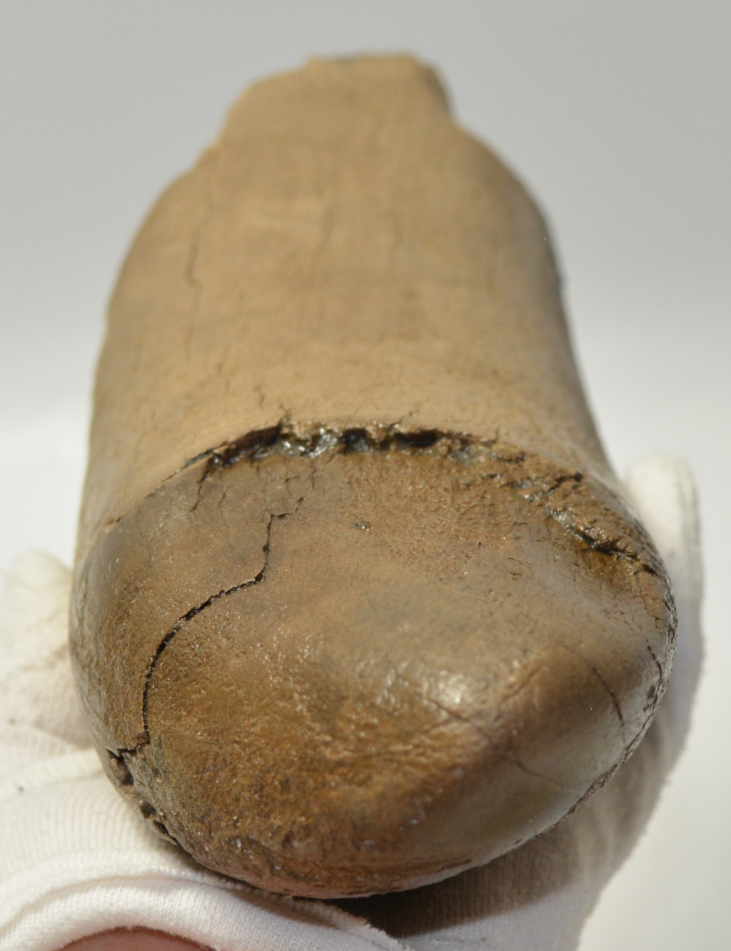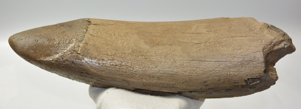 Mammuthus meridionalis (déli mamut) részleges agyar vég. A mamut fosszília Magyarországon, Pest megyében kavicsbányászat során került a felszínre. Az agyar méretei kb: hosszúsága 323 mm, szélessége 100 mm, vastagsága 79 mm. Tömege kb: 1683 gramm + csomagolás. Az agyar felülete cianoakriláttal és ethanolba oldott Polyvinyl Butyral 30 nevű anyaggal van konzerválva.