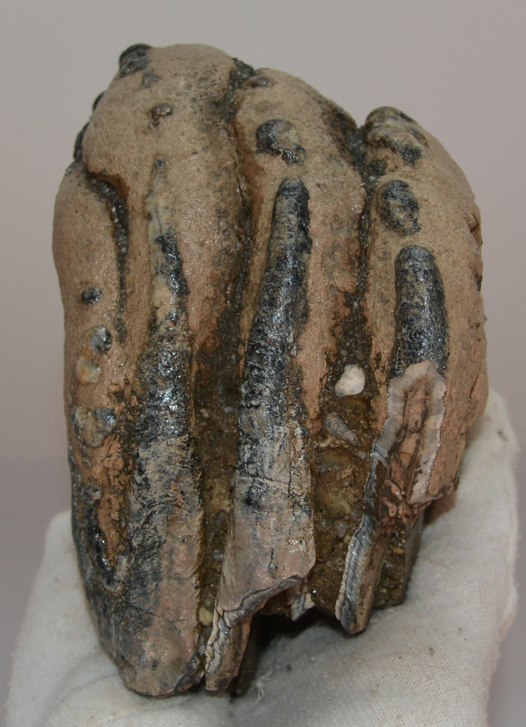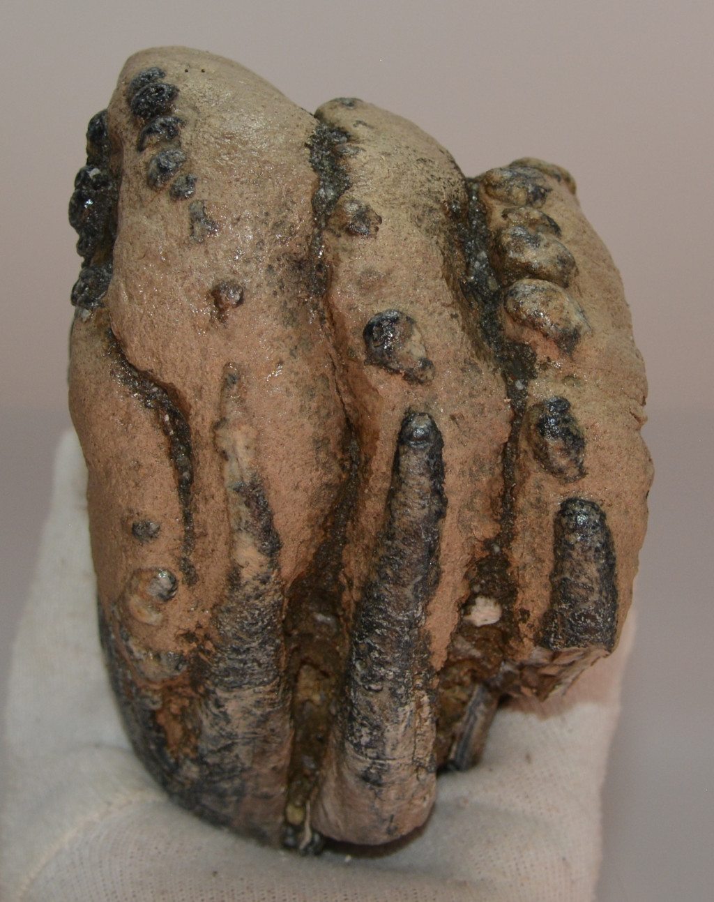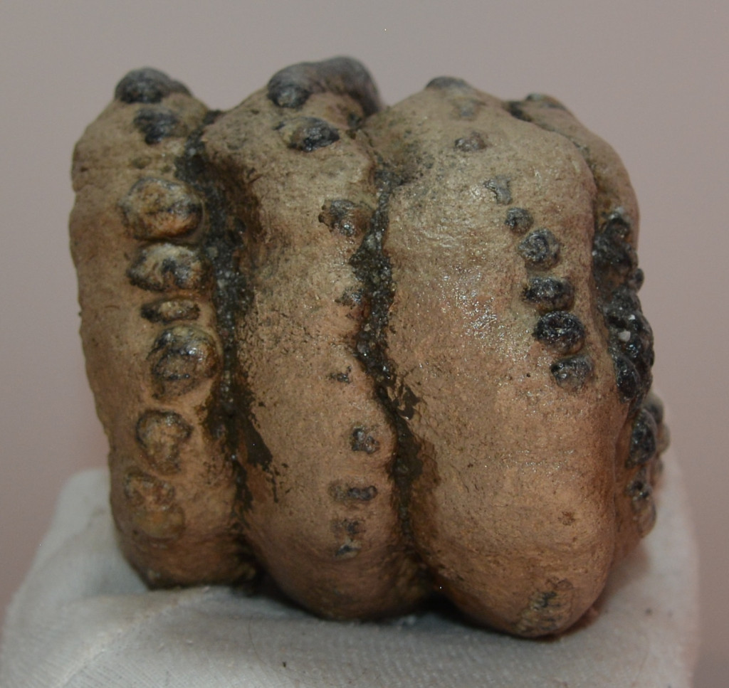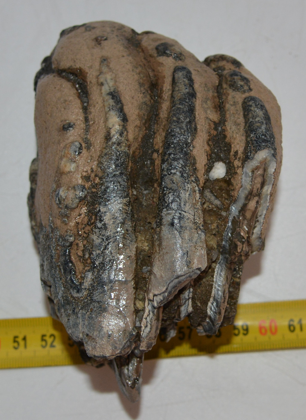 Mammuthus meridionalis (déli mamut) részleges fog. A mamut fosszília Magyarországon, Pest megyében kavicsbányászat során került a felszínre. A fog méretei kb: hosszúsága 80 mm, magassága 130 mm, szélessége 88 mm. Tömege kb: 920 gramm + csomagolás. A fog felülete ethanolba oldott Polyvinyl Butyral 30 nevű anyaggal van konzerválva.
