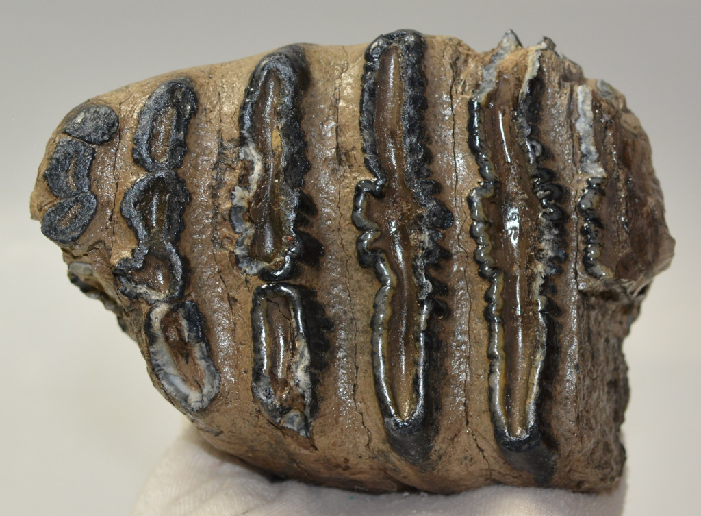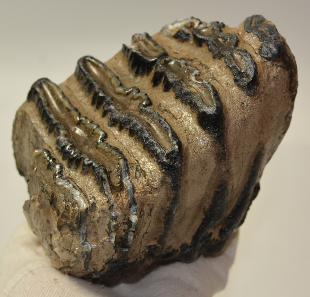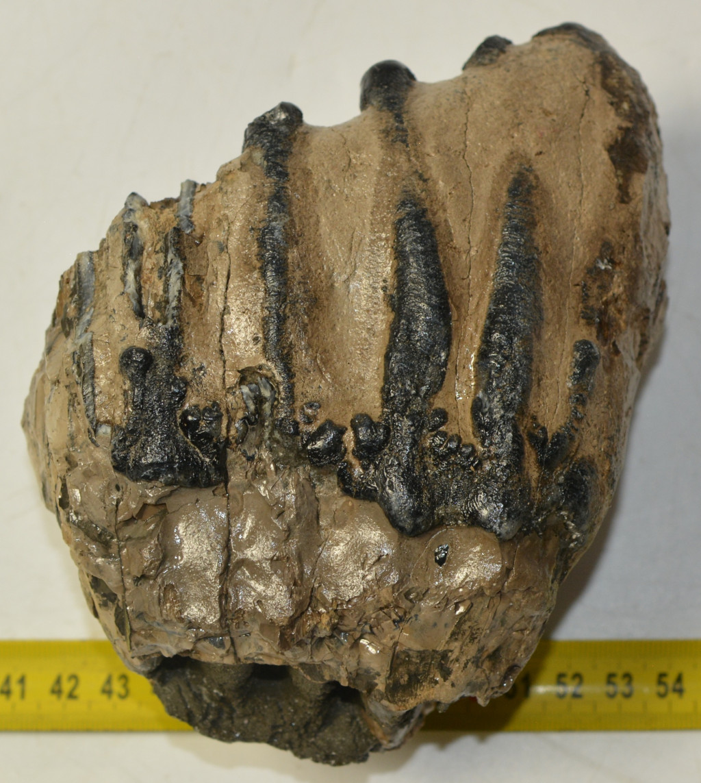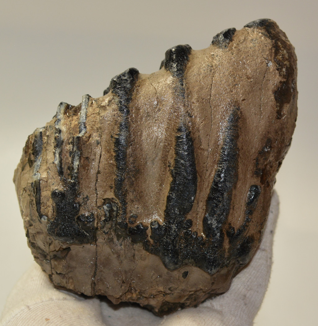 Mammuthus meridionalis (déli mamut) részleges fog. A mamut fosszília Magyarországon, Pest megyében kavicsbányászat során került a felszínre. A fog méretei kb: hosszúsága 129 mm, magassága 136 mm, szélessége 97 mm. Tömege kb: 1491 gramm + csomagolás. A fog felülete ethanolba oldott Polyvinyl Butyral 30 nevű anyaggal van konzerválva.