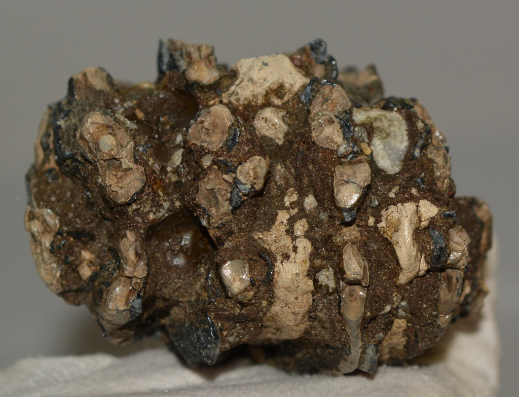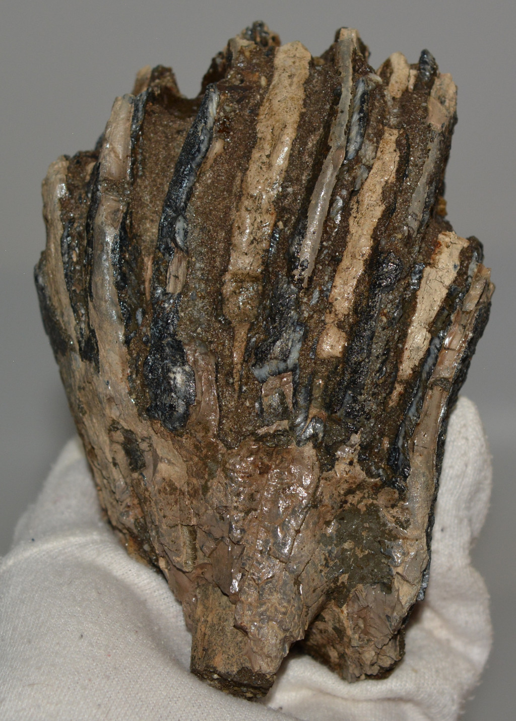 Mammuthus meridionalis (déli mamut) részleges fog. A mamut fosszília Magyarországon, Pest megyében kavicsbányászat során került a felszínre. A fog méretei kb: hosszúsága 102 mm, magassága 146 mm, szélessége 77 mm. Tömege kb: 1044 gramm + csomagolás. A fog felülete ethanolba oldott Polyvinyl Butyral 30 nevű anyaggal van konzerválva. A fogon sok helyen homok és kavics rákövesedés látható.