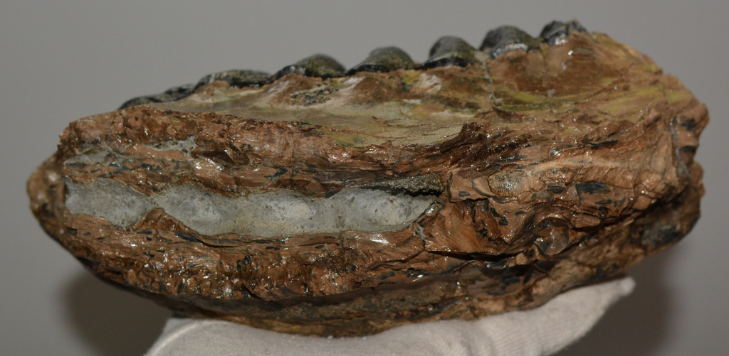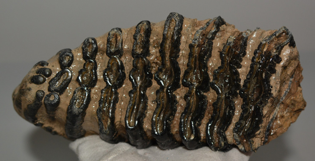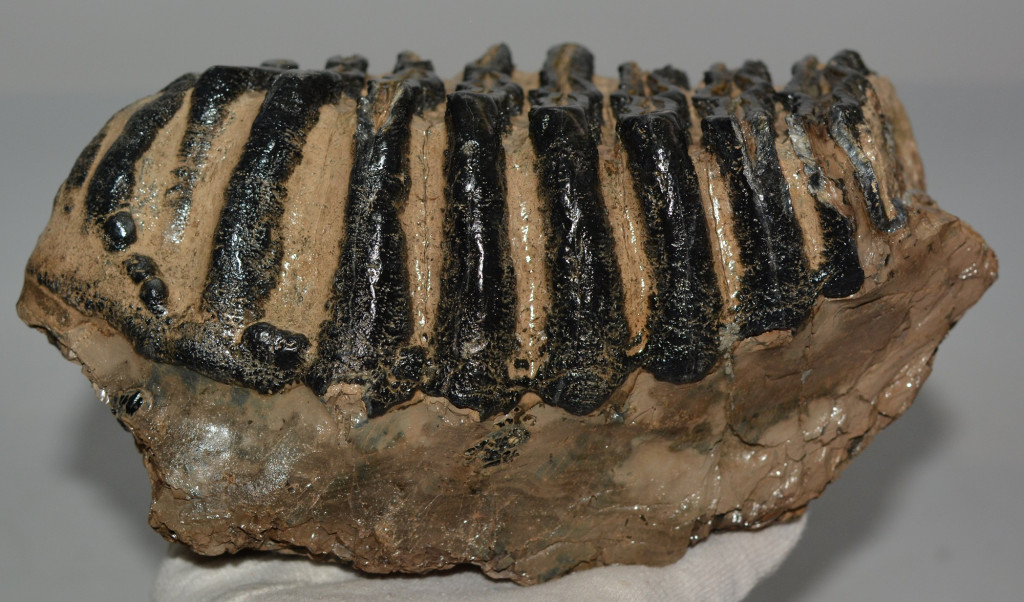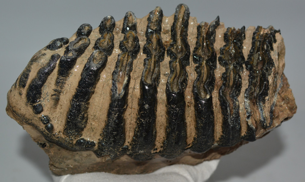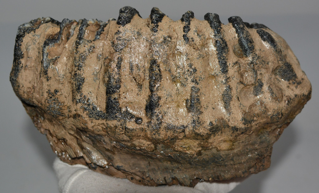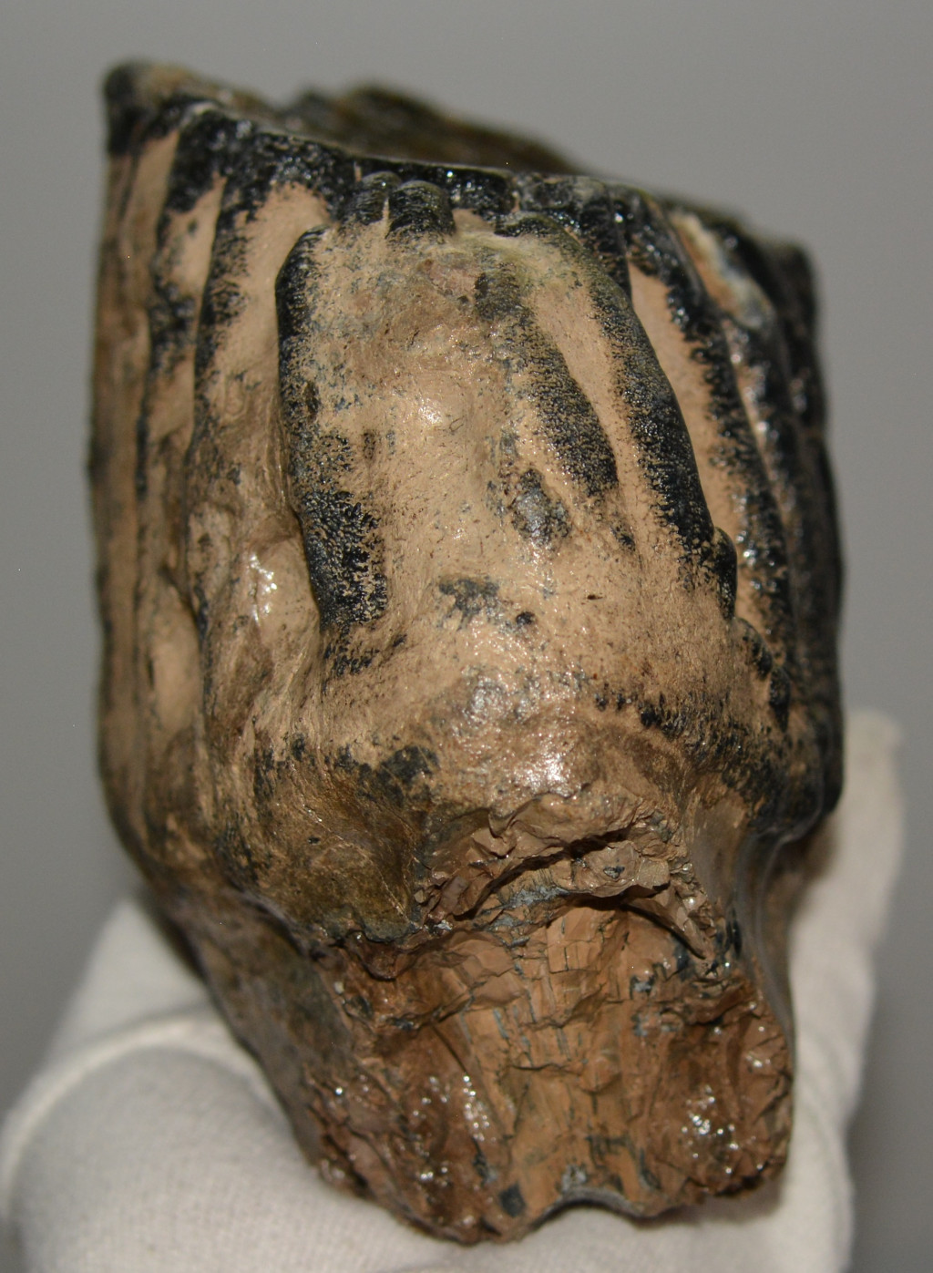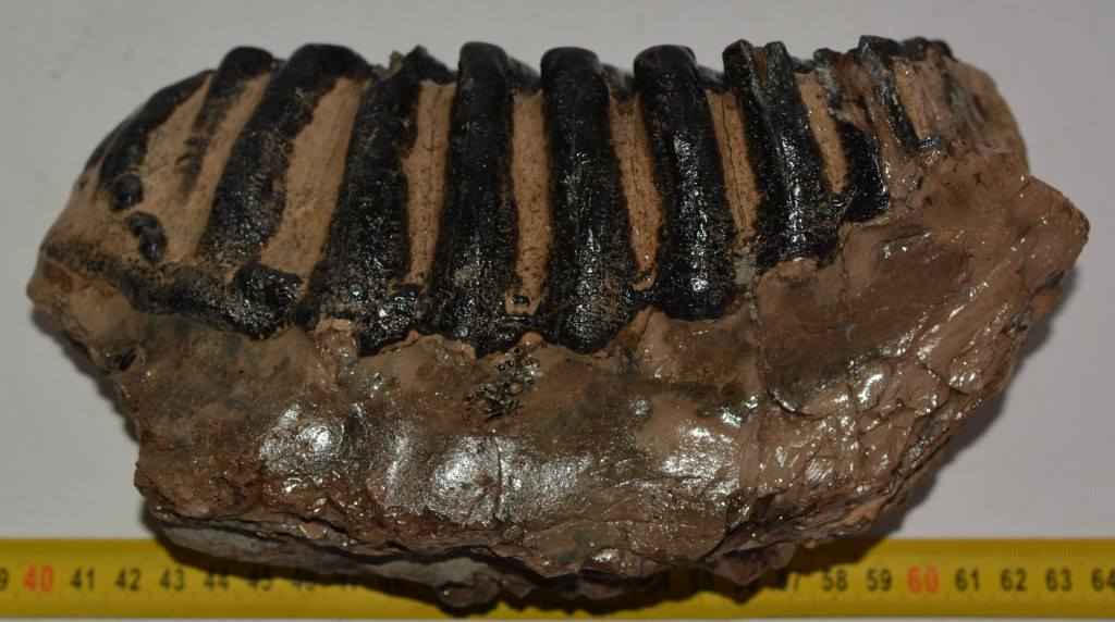 Mammuthus meridionalis (déli mamut) részleges fog. A mamut fosszília Magyarországon, Pest megyében kavicsbányászat során került a felszínre. A fog méretei kb: hosszúsága 225 mm, magassága 123 mm, szélessége 97 mm. Tömege kb: 2795 gramm + csomagolás. A fog felülete ethanolba oldott Polyvinyl Butyral 30 nevű anyaggal van konzerválva.