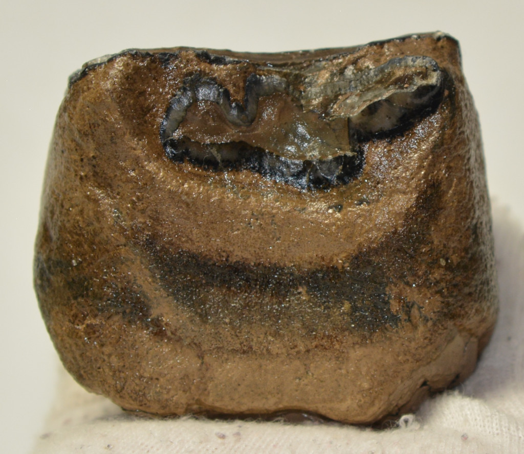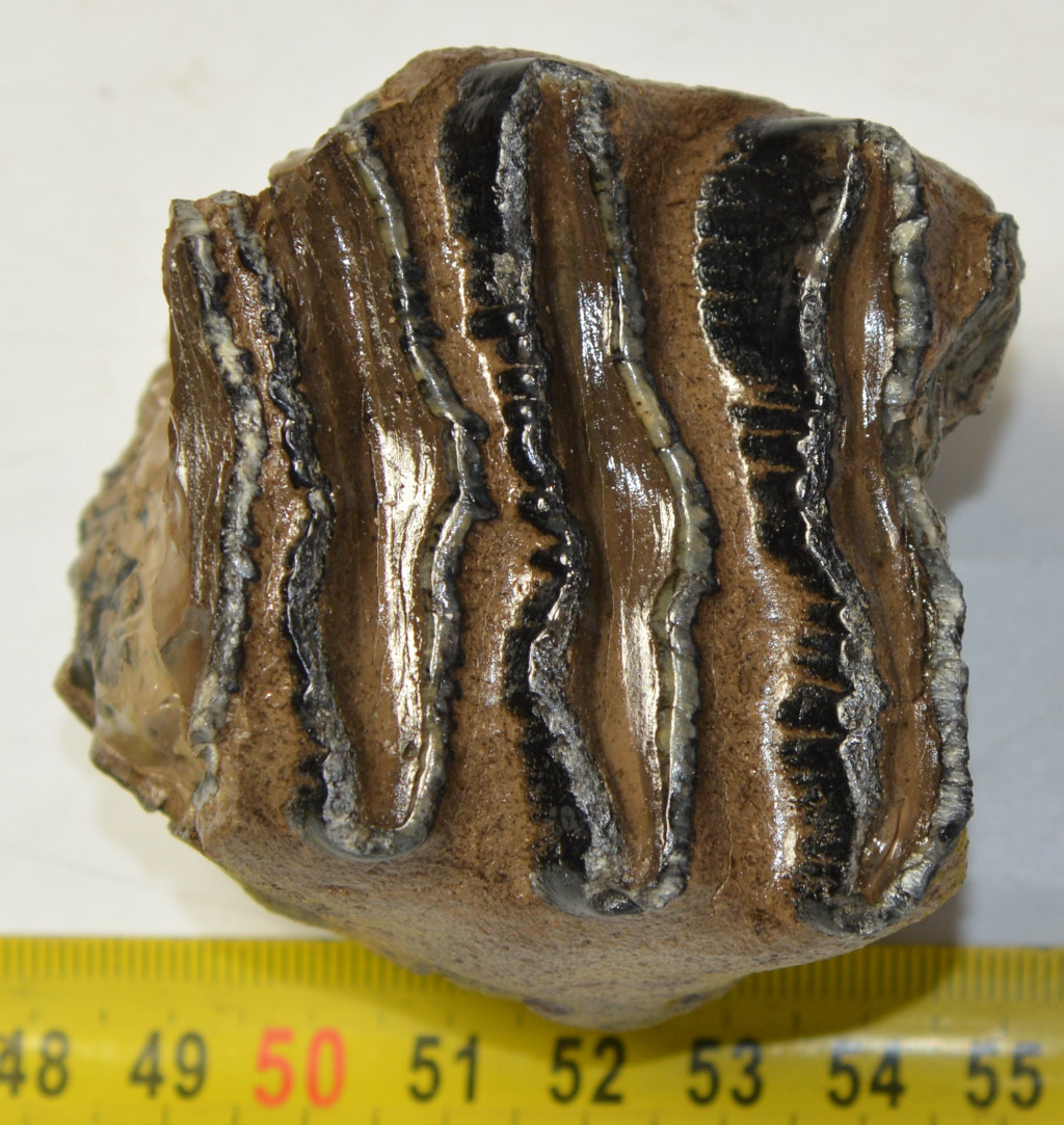 Mammuthus meridionalis (déli mamut) részleges fog. A mamut fosszília Magyarországon, Pest megyében kavicsbányászat során került a felszínre. A fog méretei kb: hosszúsága 58 mm, magassága 55 mm, szélessége 64 mm. Tömege kb: 245 gramm + csomagolás. A fog felülete ethanolba oldott Polyvinyl Butyral 30 nevű anyaggal van konzerválva.