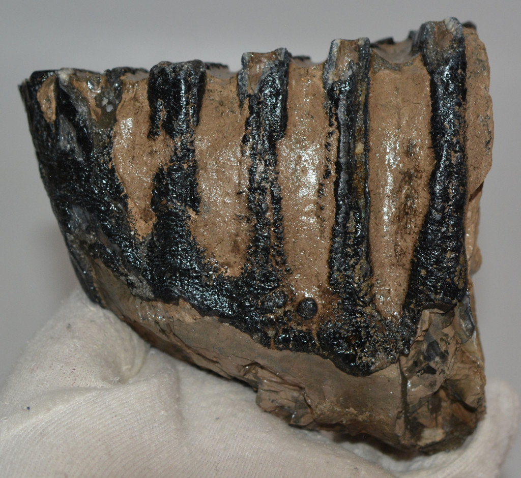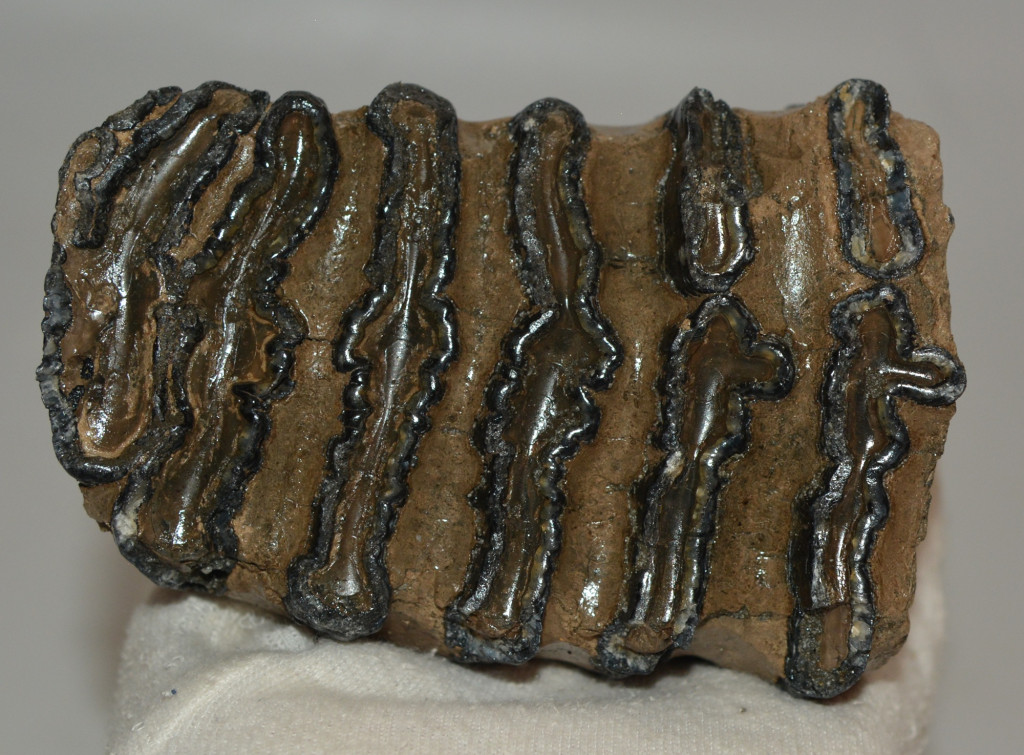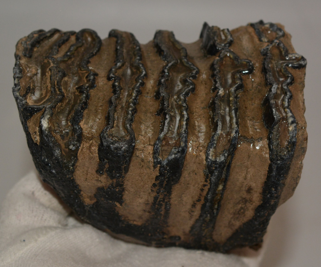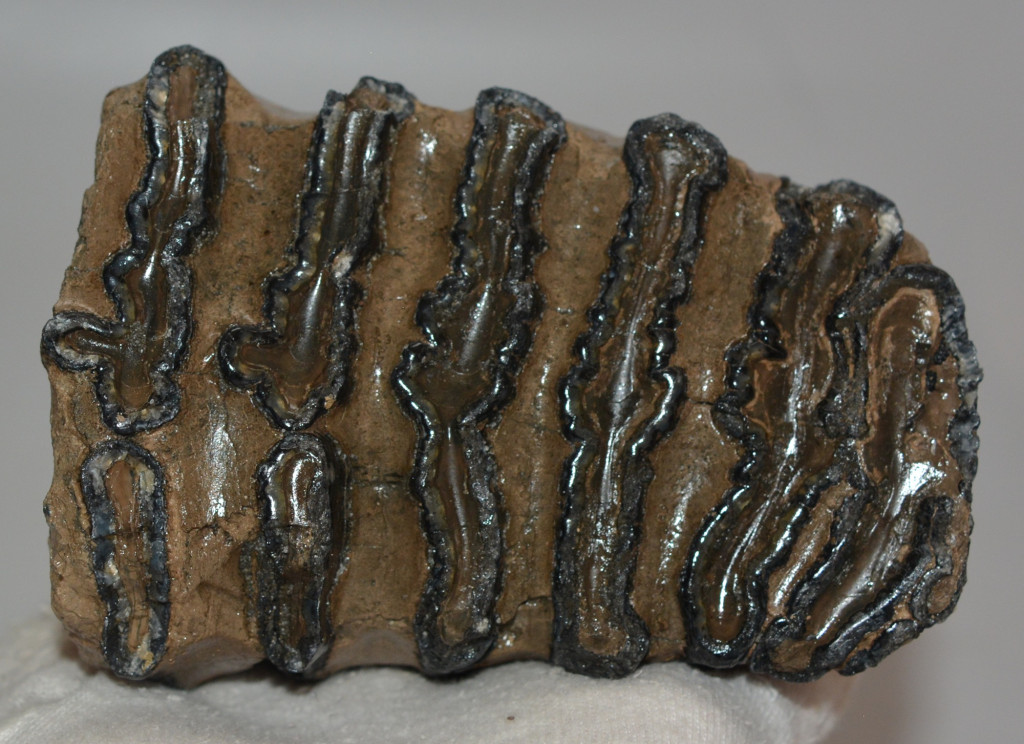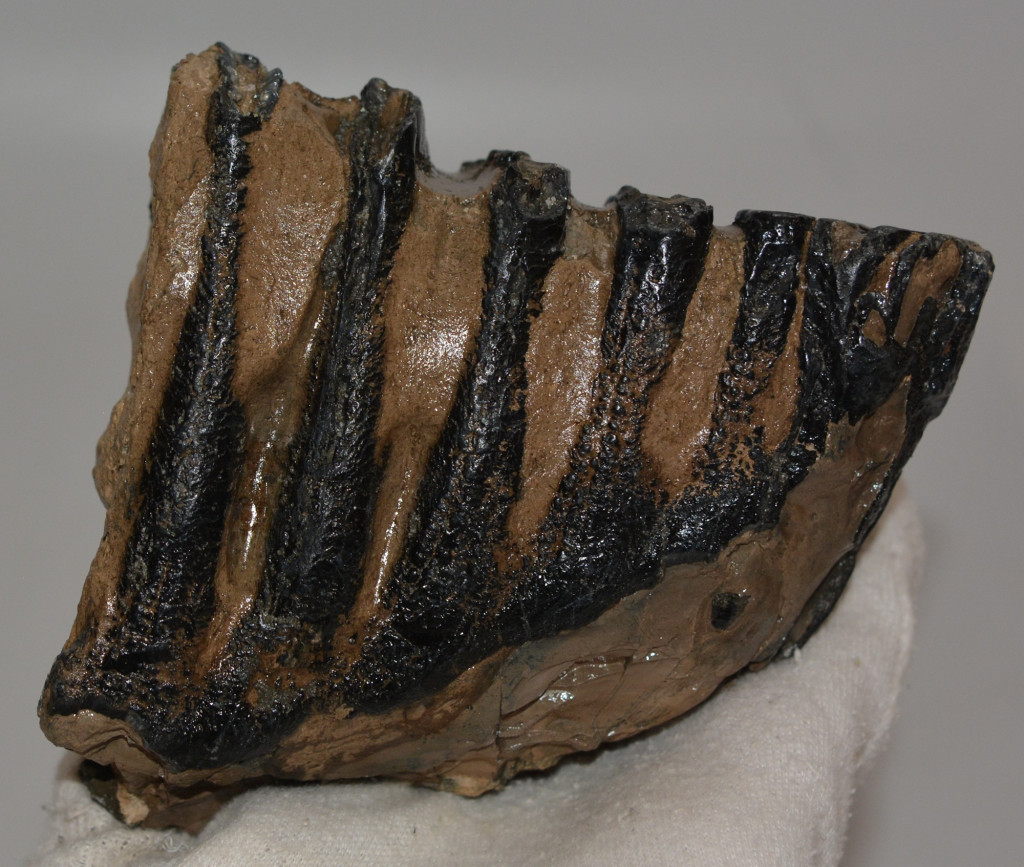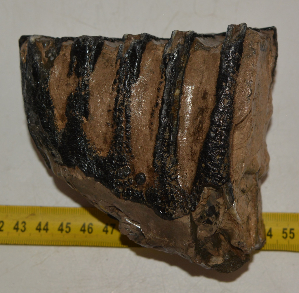 Mammuthus meridionalis (déli mamut) részleges fog. A mamut fosszília Magyarországon, Pest megyében kavicsbányászat során került a felszínre. A fog méretei kb: hosszúsága 112 mm, magassága 104 mm, szélessége 81 mm. Tömege kb: 961 gramm + csomagolás. A fog felülete ethanolba oldott Polyvinyl Butyral 30 nevű anyaggal van konzerválva.