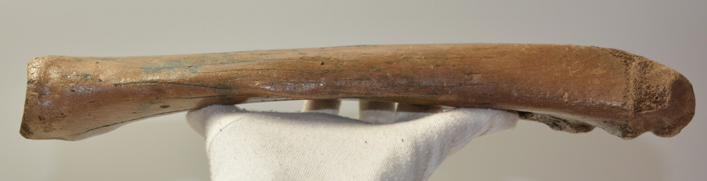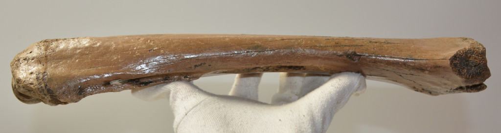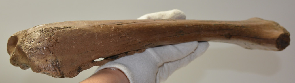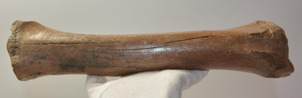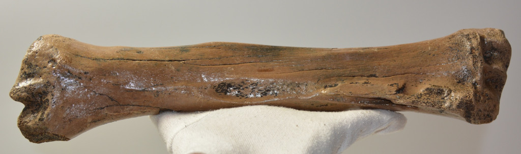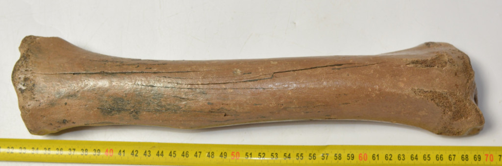 Pleisztocén korú Megaloceros giganteus vagy verticornis radius csont. A szarvas fosszília Magyarországon, Győr-Mosom-Sopron megyében Győrújfalu közelében kavicsbányászat során került a felszínre kb: 20 évvel ezelőtt. A bányában akkoriban Mammuthus meridionalis maradványok kerültek elő ezért valószínűleg ez a csont egy Megaloceros verticornis nevű szarvashoz tartozhatott. A csont méretei kb: Hosszúsága: 371 mm, szélessége 79,3 mm, vastagsága 45,3 mm. Tömege kb: 890 gramm + csomagolás. A csont felülete ethanolba oldott Polyvinyl Butyral 30 nevű anyaggal van konzerválva.