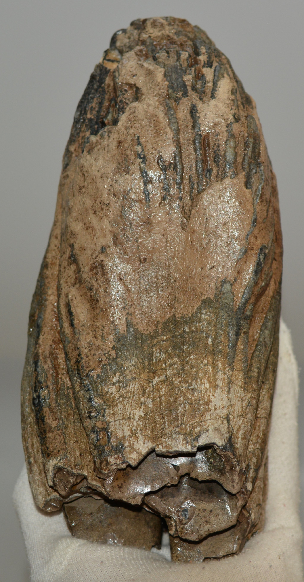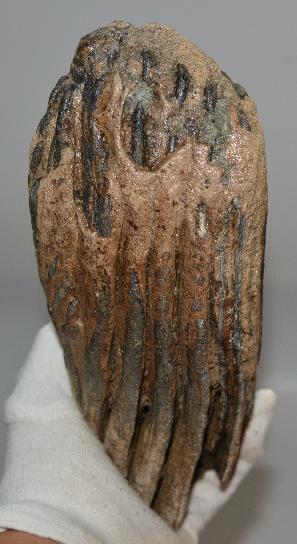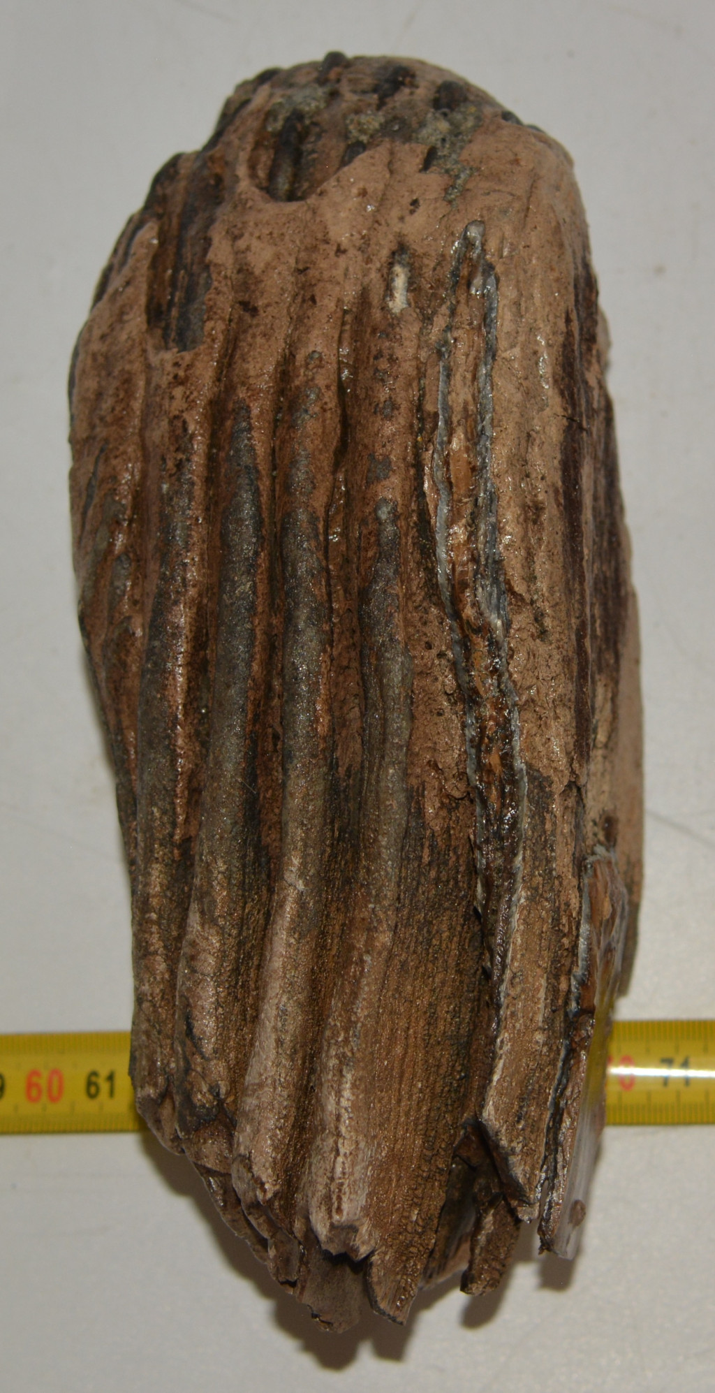 Mammuthus primigenius (gyapjas mamut) részleges fog. A mamut fosszília Magyarországon, Heves megyében kavicsbányászat során került a felszínre. A fog méretei kb: hosszúsága 91 mm, magassága 213 mm, szélessége 99 mm. Tömege kb: 1790 gramm + csomagolás. A fog felülete ethanolba oldott Polyvinyl Butyral 30 nevű anyaggal van konzerválva.