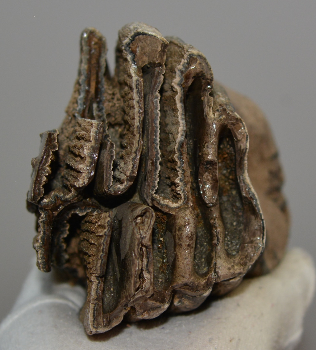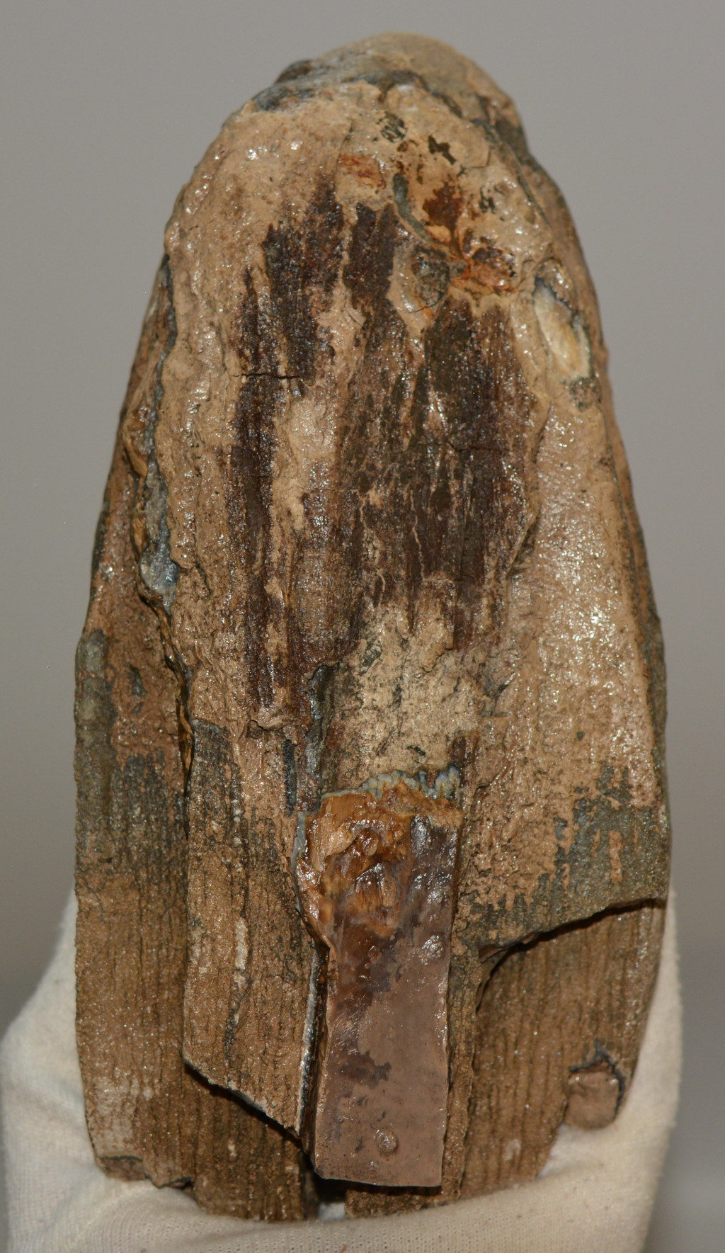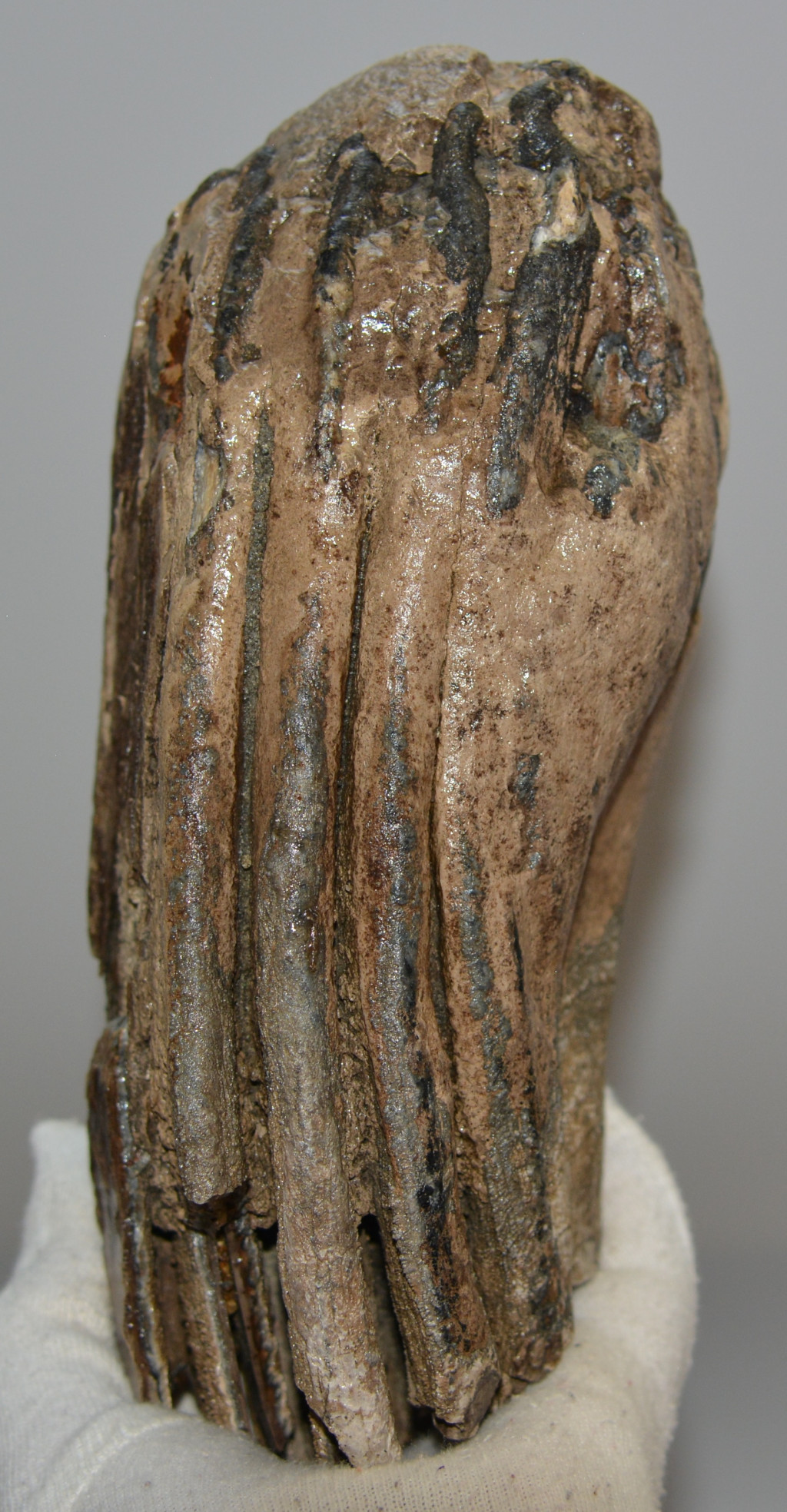 Mammuthus primigenius (gyapjas mamut) részleges fog. A mamut fosszília Magyarországon, Heves megyében kavicsbányászat során került a felszínre. A fog méretei kb: hosszúsága 91 mm, magassága 213 mm, szélessége 99 mm. Tömege kb: 1790 gramm + csomagolás. A fog felülete ethanolba oldott Polyvinyl Butyral 30 nevű anyaggal van konzerválva.