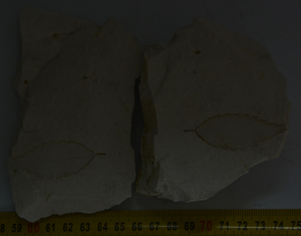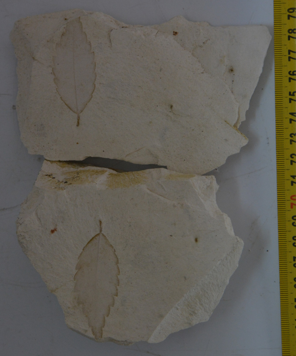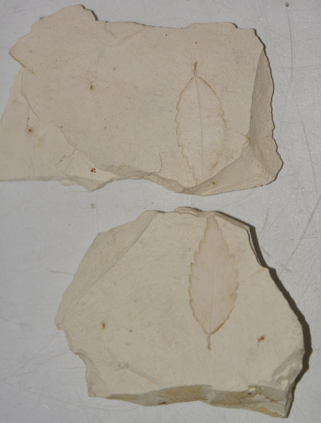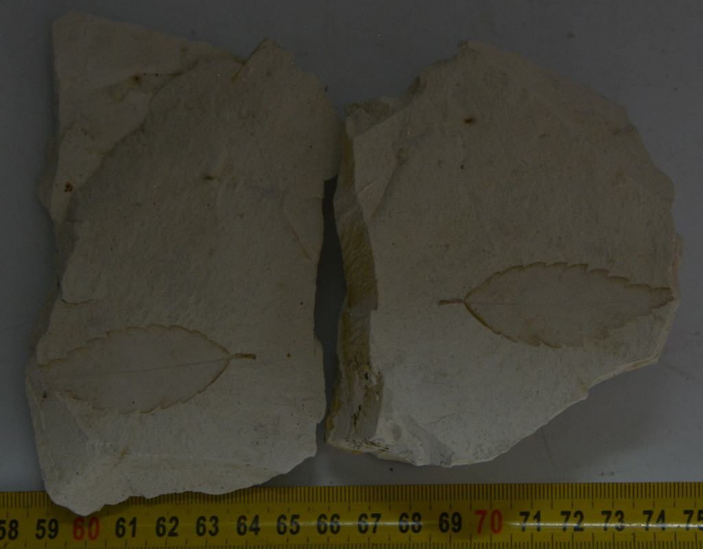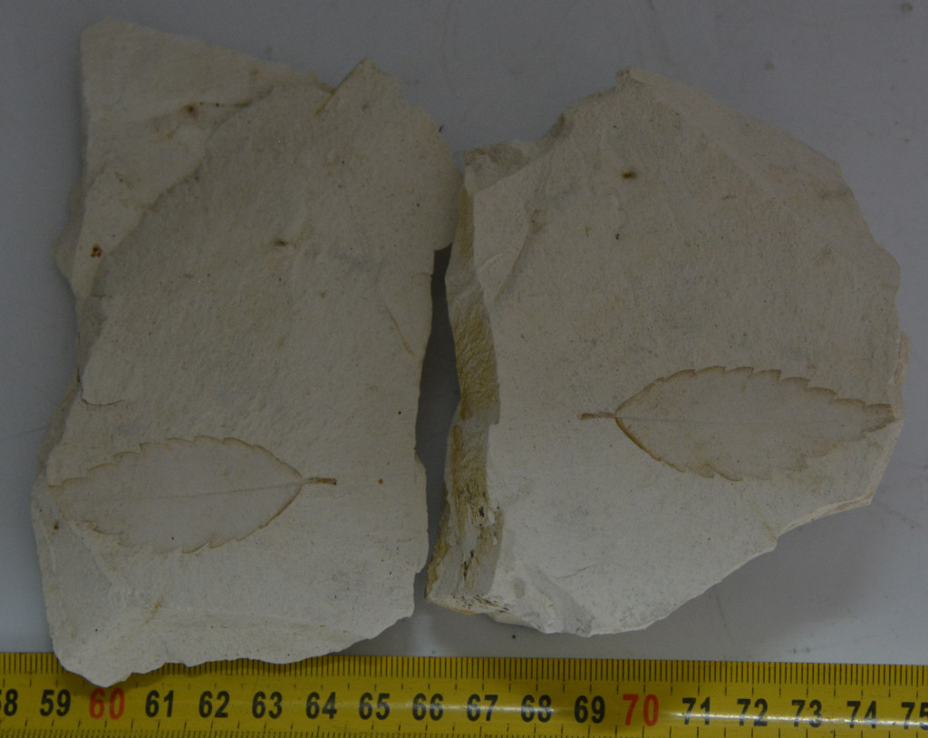 Miocén korú (kb: 10-13 millió éves) Zelkova ungeri (szilfa) levél lenyomat párban diatóma (kovaföld) felületén. A növény fosszília Magyarországon a Zempléni hegységben Erdőbénye település közelében diatóma bányászat során került a felszínre. A diatóma méretei kb: (A): 108 mm x 83 mm x 36 mm. tömege kb: 147 gramm + csomagolás. (B): 129 mm x 81 mm x 16 mm. Tömege kb: 67 gramm + csomagolás.A Zelkova levél lenyomat hosszúsága kb: 55,8 mm. A diatóma nagyon puha és porlékony ezért felülete konzerválva van.