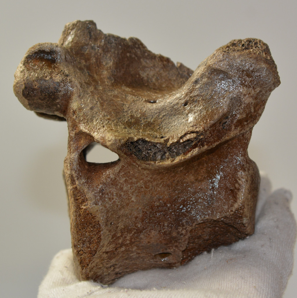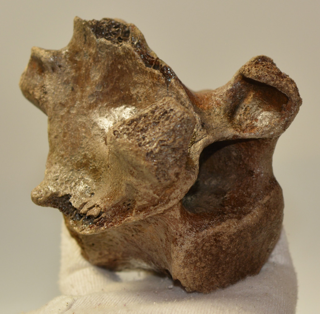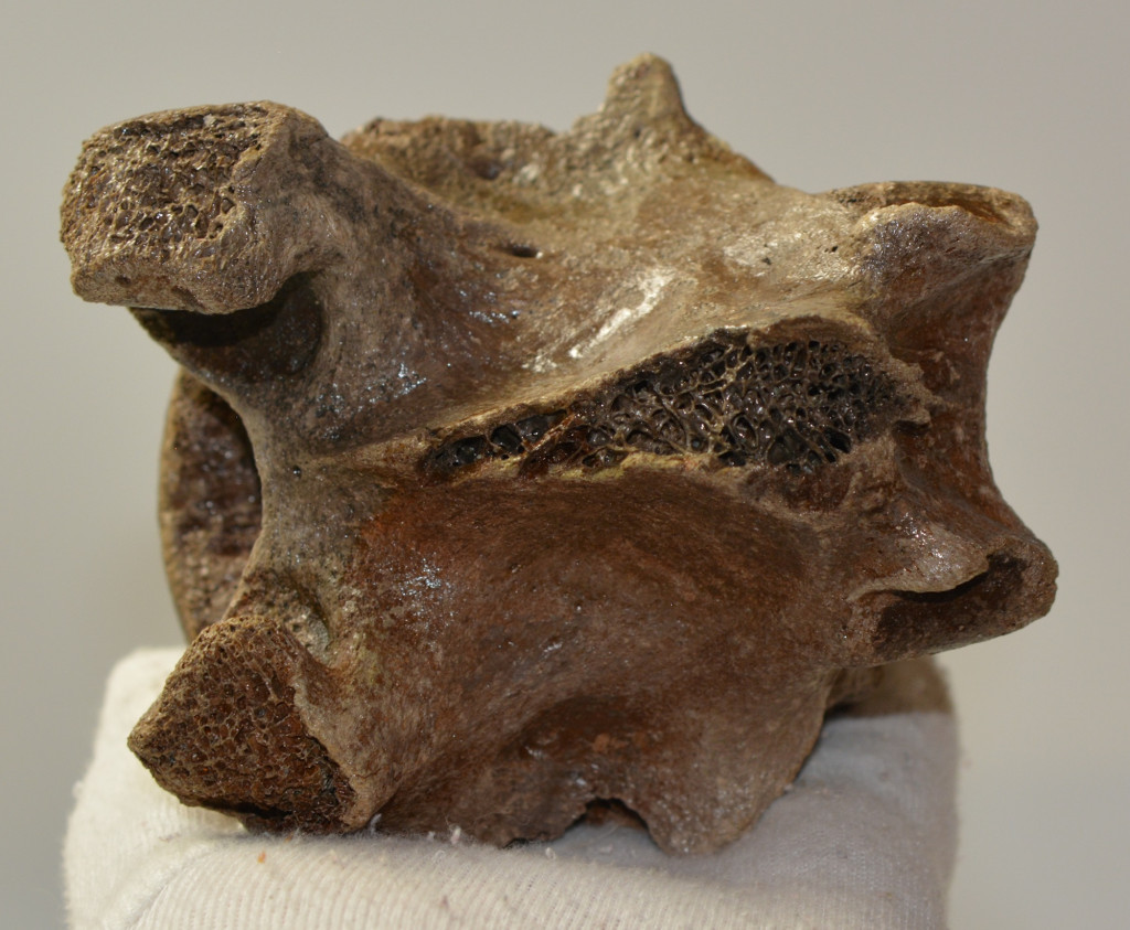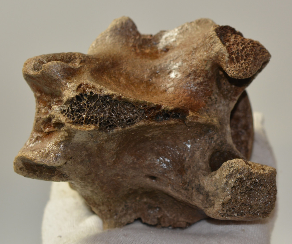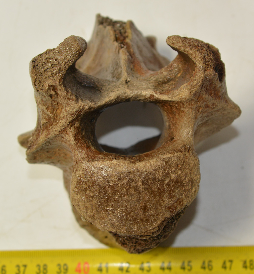Bison priscus (sztyeppei bölény) részleges hátcsigolya csont. A bölény fosszília Magyarországon, Pest megyében kavicsbányászat során került a felszínre. A bölény fosszília méretei kb: hosszúsága 111 mm, magassága 115 mm, szélessége 99 mm. Tömege kb: 316 gramm + csomagolás. A fosszília felülete ethanolba oldott Polyvinyl Butyral 30 nevű anyaggal van konzerválva.