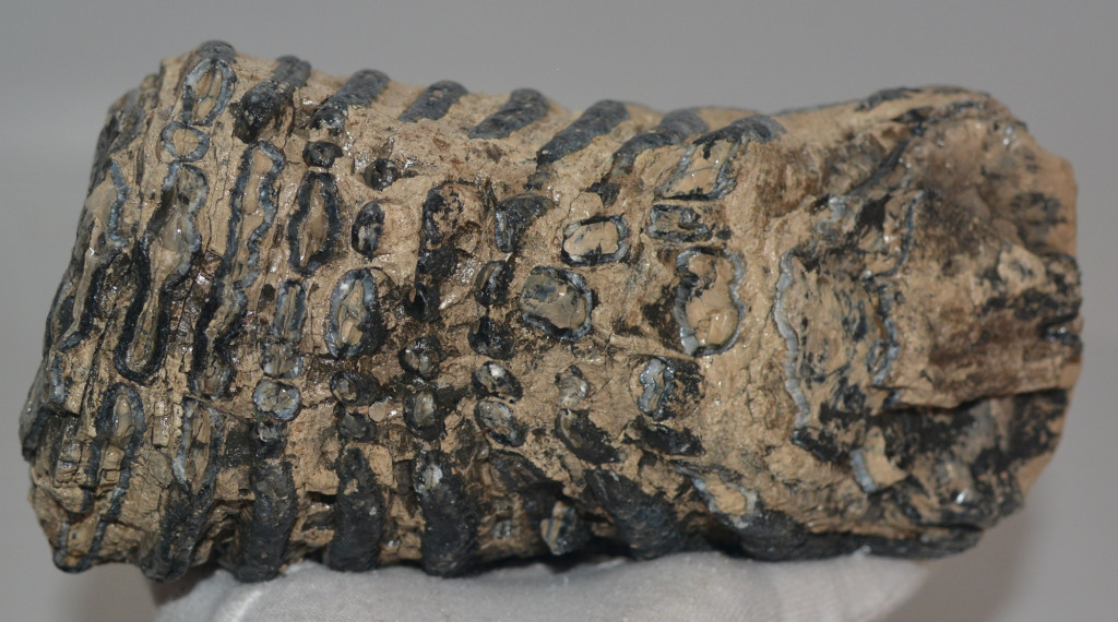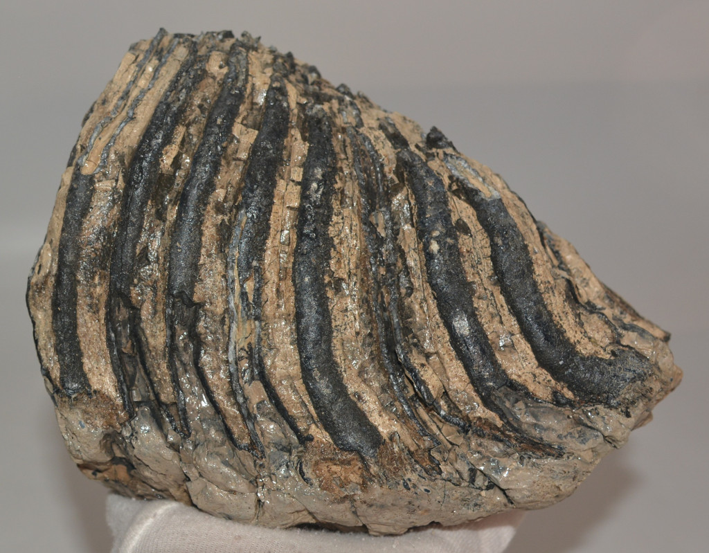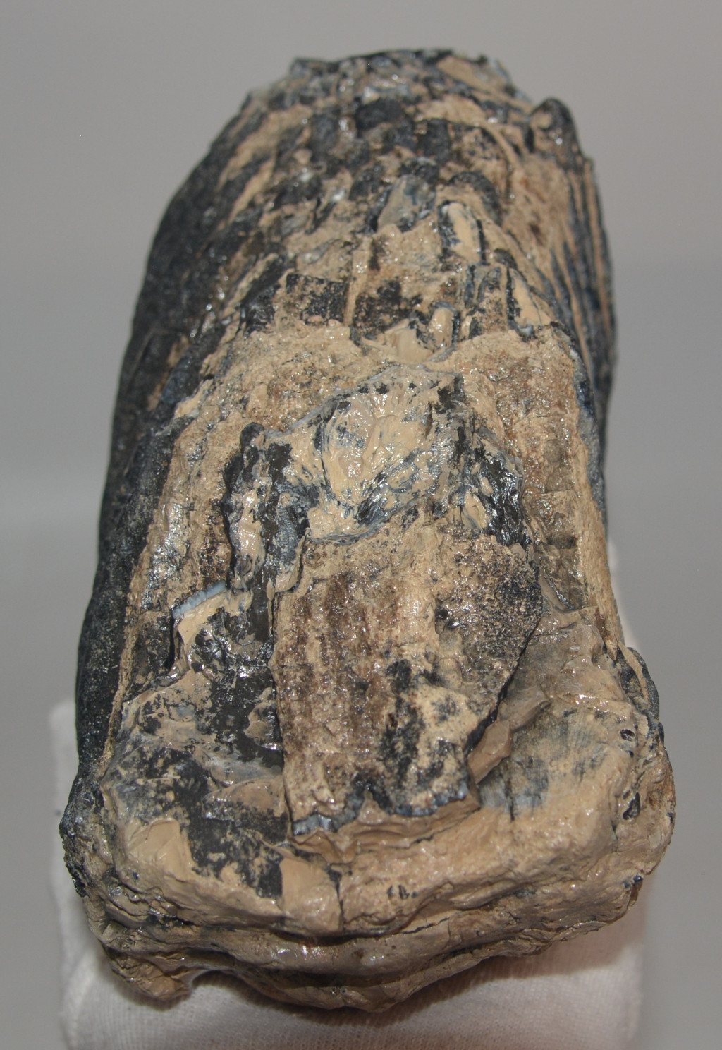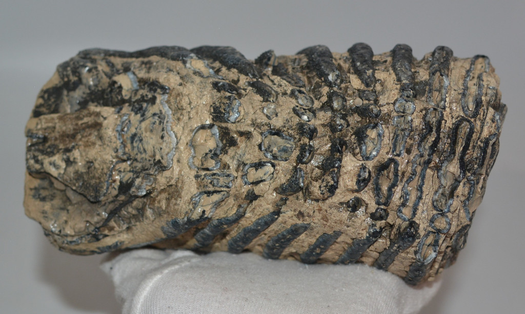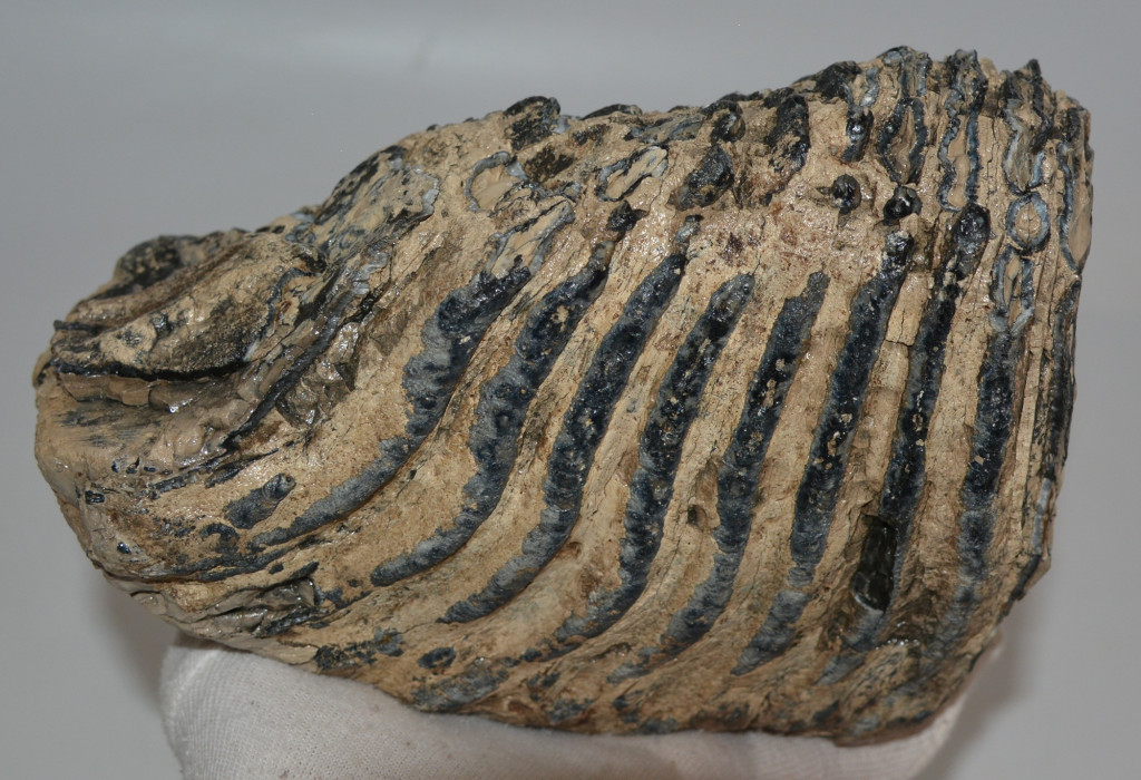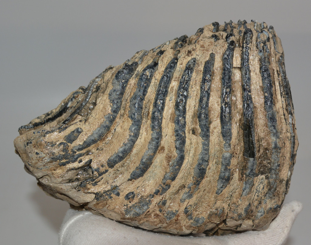 Mammuthus primigenius (gyapjas mamut) részleges fog. A mamut fosszília Magyarországon, Pest megyében kavicsbányászat során került a felszínre. A fog méretei kb: hosszúsága 186 mm, magassága 149 mm, szélessége 93 mm. Tömege kb: 2552 gramm + csomagolás. A fog felülete ethanolba oldott Polyvinyl Butyral 30 nevű anyaggal van konzerválva.