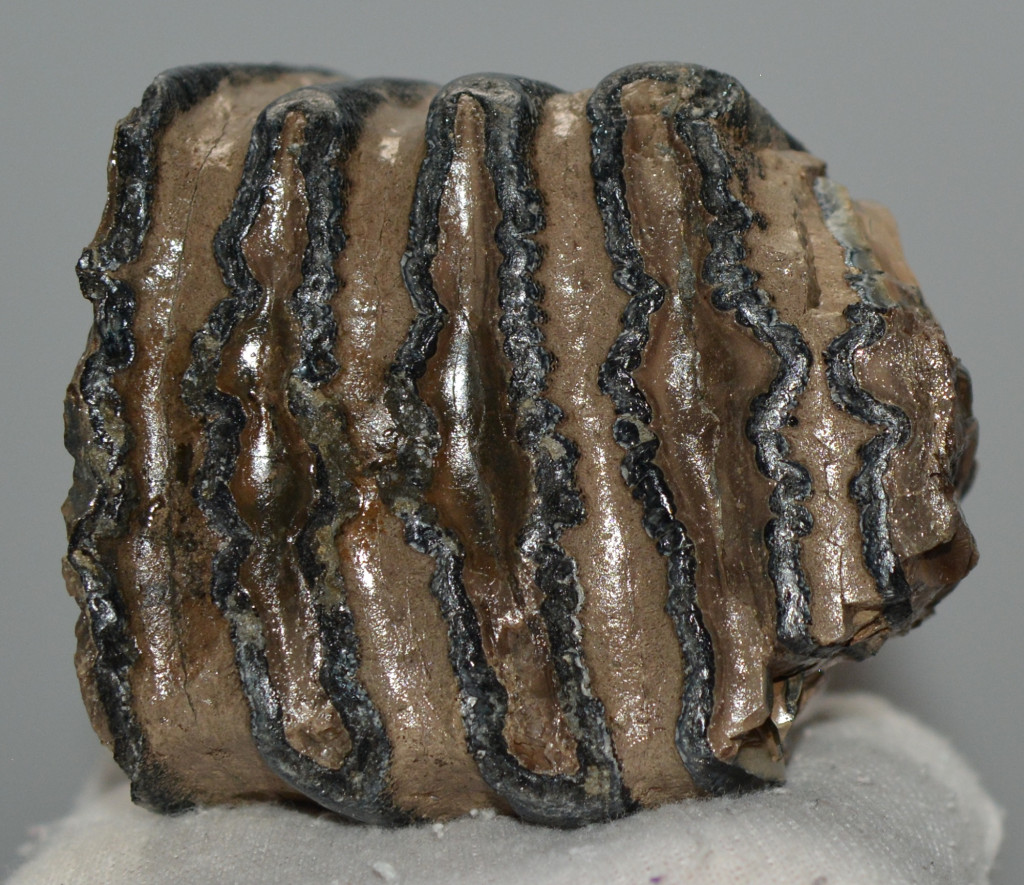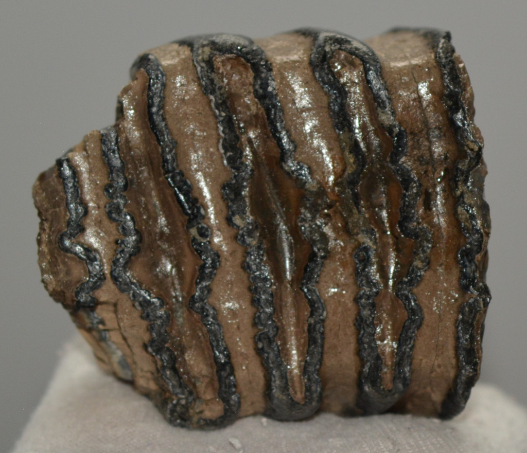 Mammuthus meridionalis (déli mamut) részleges fog. A mamut fosszília Magyarországon, Pest megyében kavicsbányászat során került a felszínre. A fog méretei kb: hosszúsága 67 mm, magassága 75 mm, szélessége 64 mm. Tömege kb: 318 gramm + csomagolás. A fog felülete ethanolba oldott Polyvinyl Butyral 30 nevű anyaggal van konzerválva.