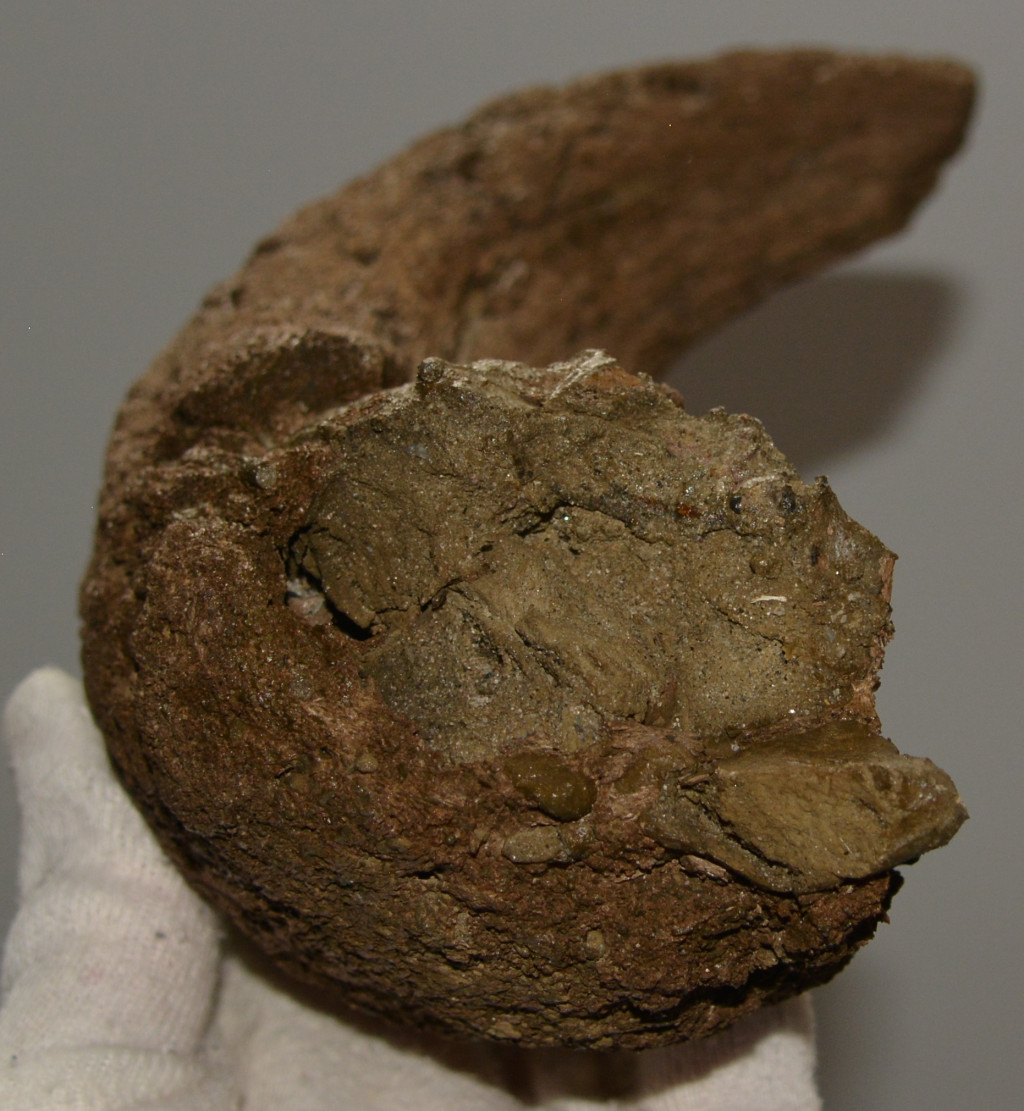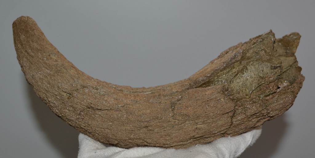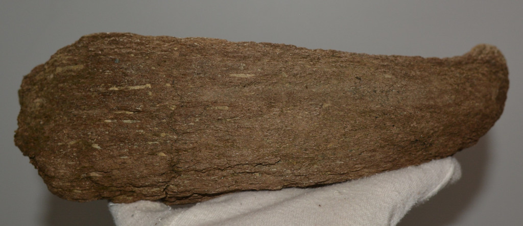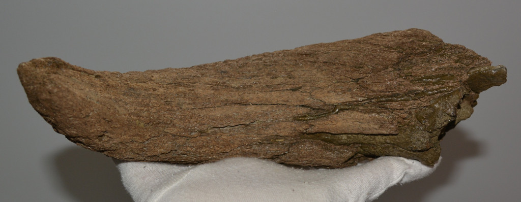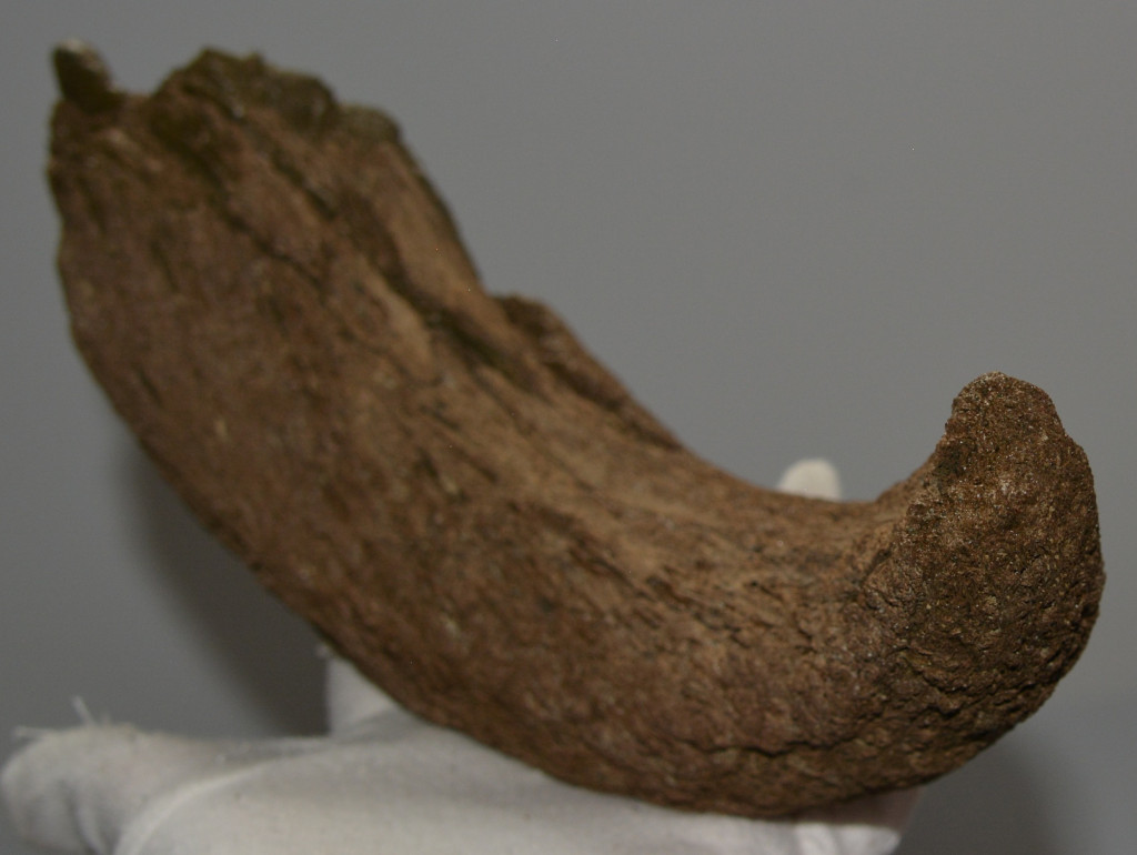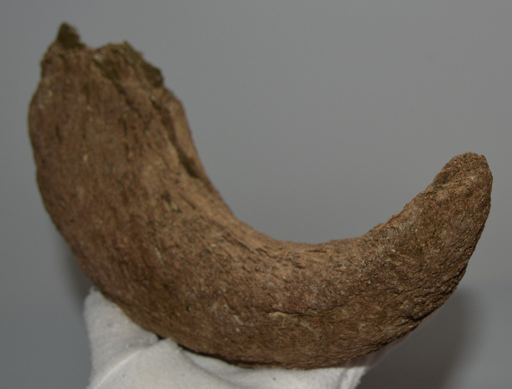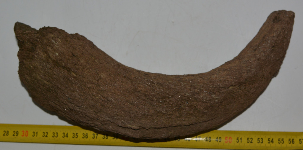 Bison sp. (erdei bölény) részleges szarvcsap csont. A bölény fosszília Magyarországon, Pest megyében kavicsbányászat során került a felszínre. A csont méretei kb: hosszúsága 269 mm, szélessége 85 mm, legnagyobb vastagsága 71 mm. Tömege kb: 1720 gramm + csomagolás. A szarvcsap csont belsejében homok és kavics rákövesedések láthatóak. A csont felülete ethanolba oldott Polyvinyl Butyral 30 nevű anyaggal van konzerválva.