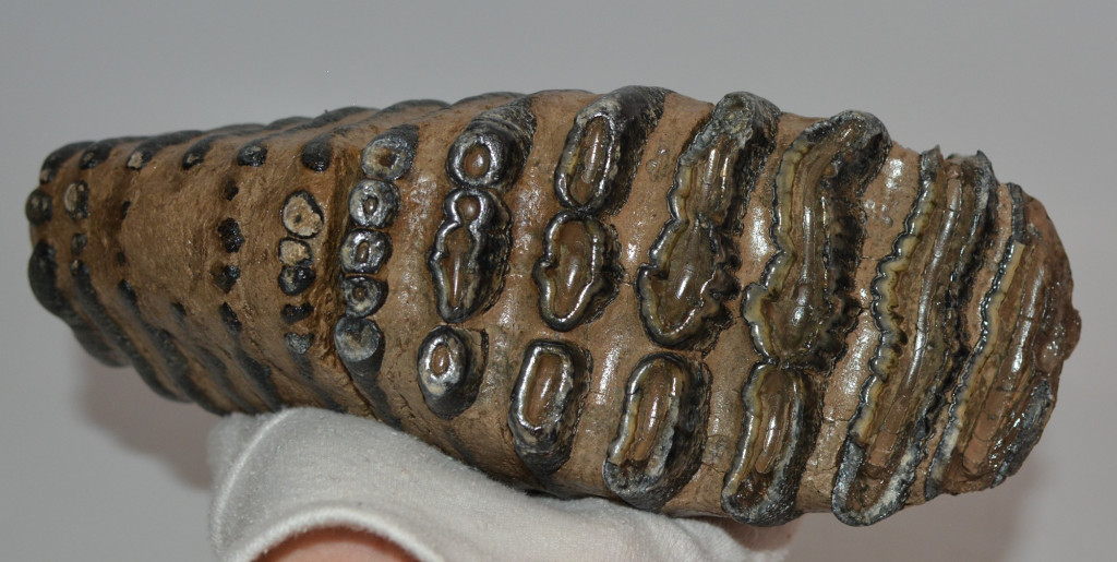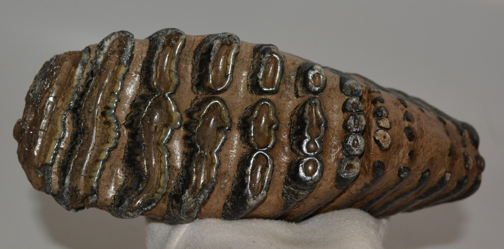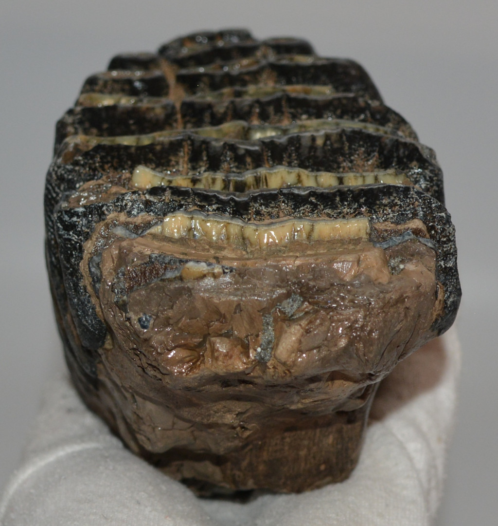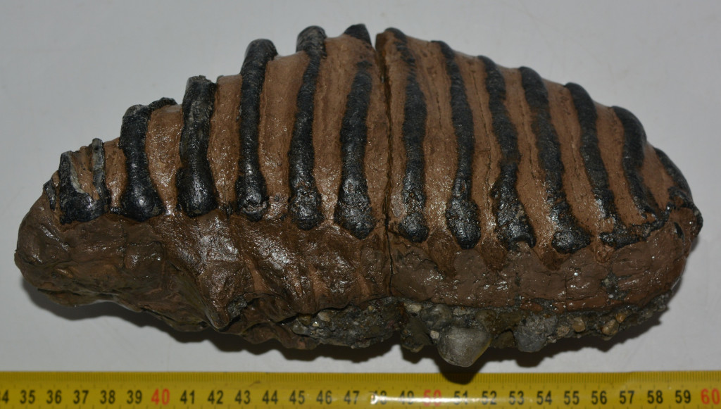 Mammuthus meridionalis (déli mamut) fog. A mamut fosszília Magyarországon, Pest megyében kavicsbányászat során került a felszínre. Megtalálásakor kettő darabra volt törve, cianoakriláttal lett összeragasztva. A fog méretei kb: hosszúsága 234 mm, magassága 120 mm, szélessége 83 mm. Tömege kb: 2239 gramm + csomagolás. A fog felülete ethanolba oldott Polyvinyl Butyral 30 nevű anyaggal van konzerválva.