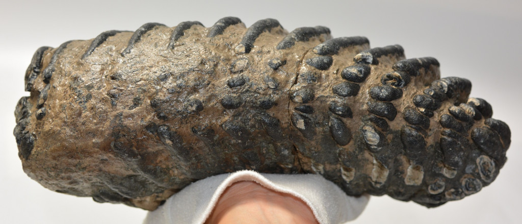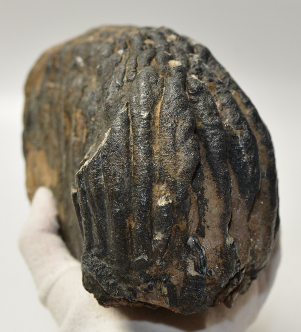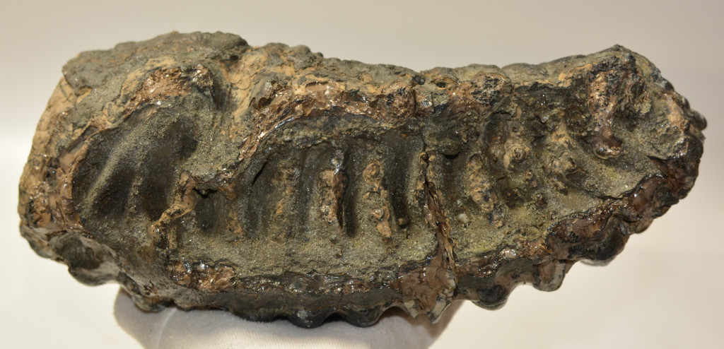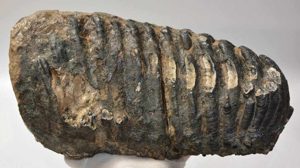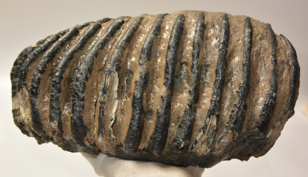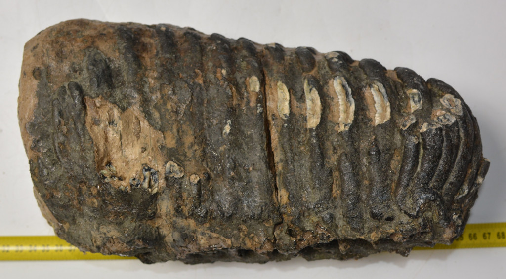 Mammuthus meridionalis (déli mamut) bal alsó m3 fog. A mamut fosszília Magyarországon, Pest megyében kavicsbányászat során került a felszínre. Megtalálásakor kettő darabra volt törve, cianoakriláttal lett összeragasztva. A fog méretei kb: hosszúsága 306 mm, magassága 162 mm, szélessége 119 mm. Tömege kb: 6452 gramm + csomagolás. A fog felülete ethanolba oldott Polyvinyl Butyral 30 nevű anyaggal van konzerválva.