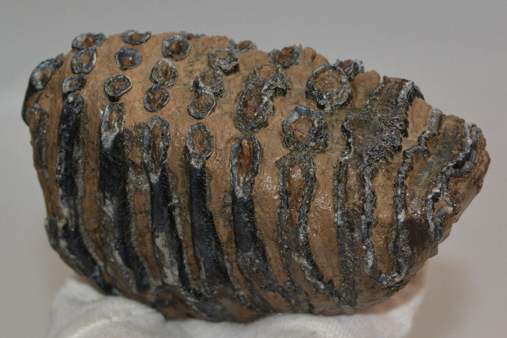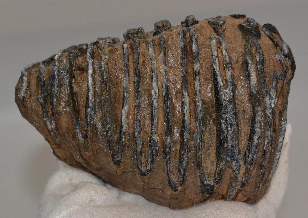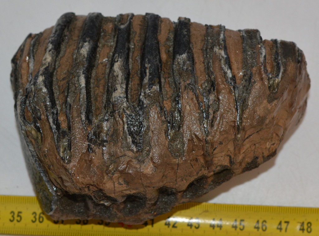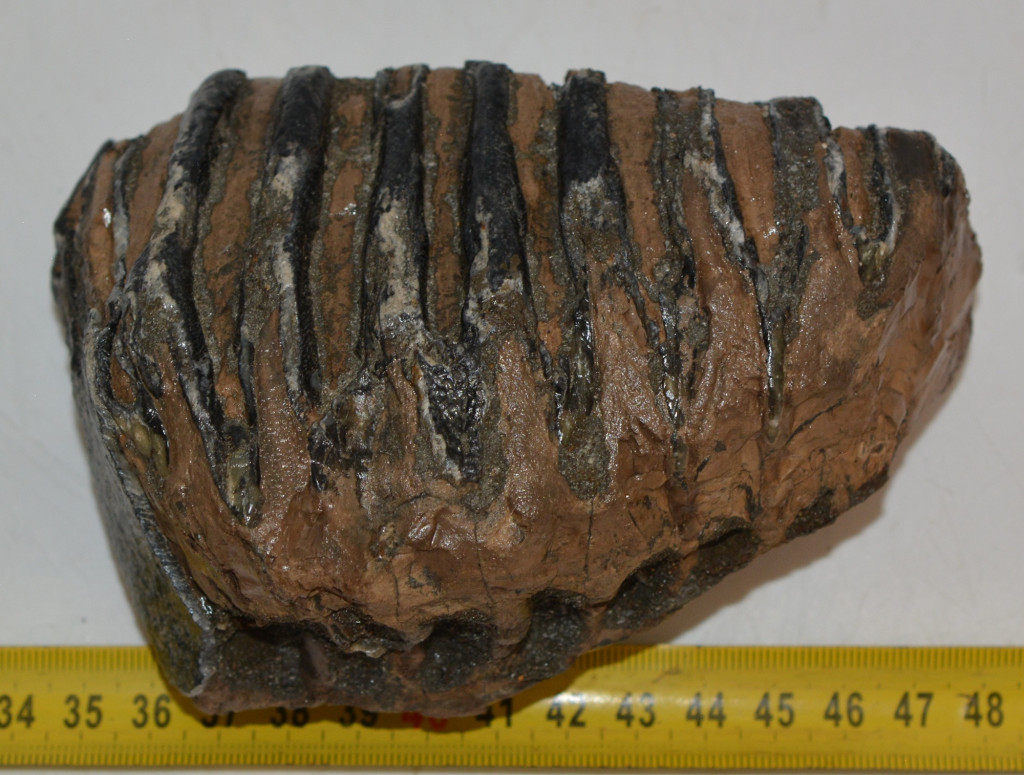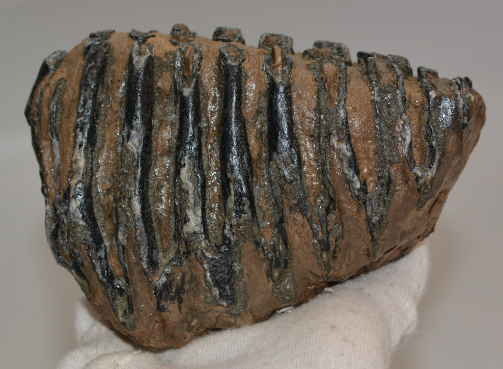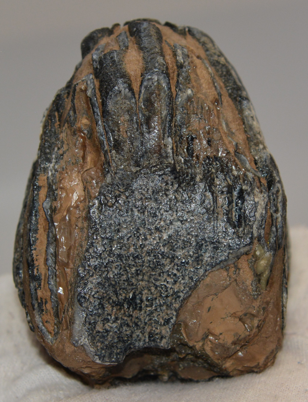 Mammuthus meridionalis (déli mamut) részleges fog. A mamut fosszília Magyarországon, Pest megyében kavicsbányászat során került a felszínre. A fog elejéből hiányzik egy pici darabka. A fog méretei kb: hosszúsága 133,9 mm, magassága 91,5 mm, szélessége 69,6 mm. Tömege kb: 957 gramm + csomagolás. A fog felülete ethanolba oldott Polyvinyl Butyral 30 nevű anyaggal van konzerválva.